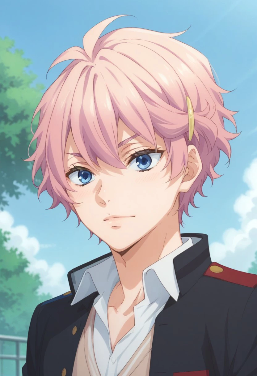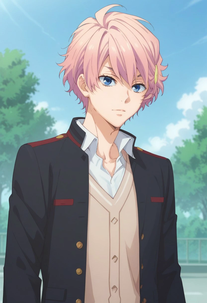 akimitsu, 1boy, male focus, solo, pink hair, hair ornament, hairclip, blue eyes, school uniform, jacket, open jacket, open clothes, shirt, collared shirt, cardigan,