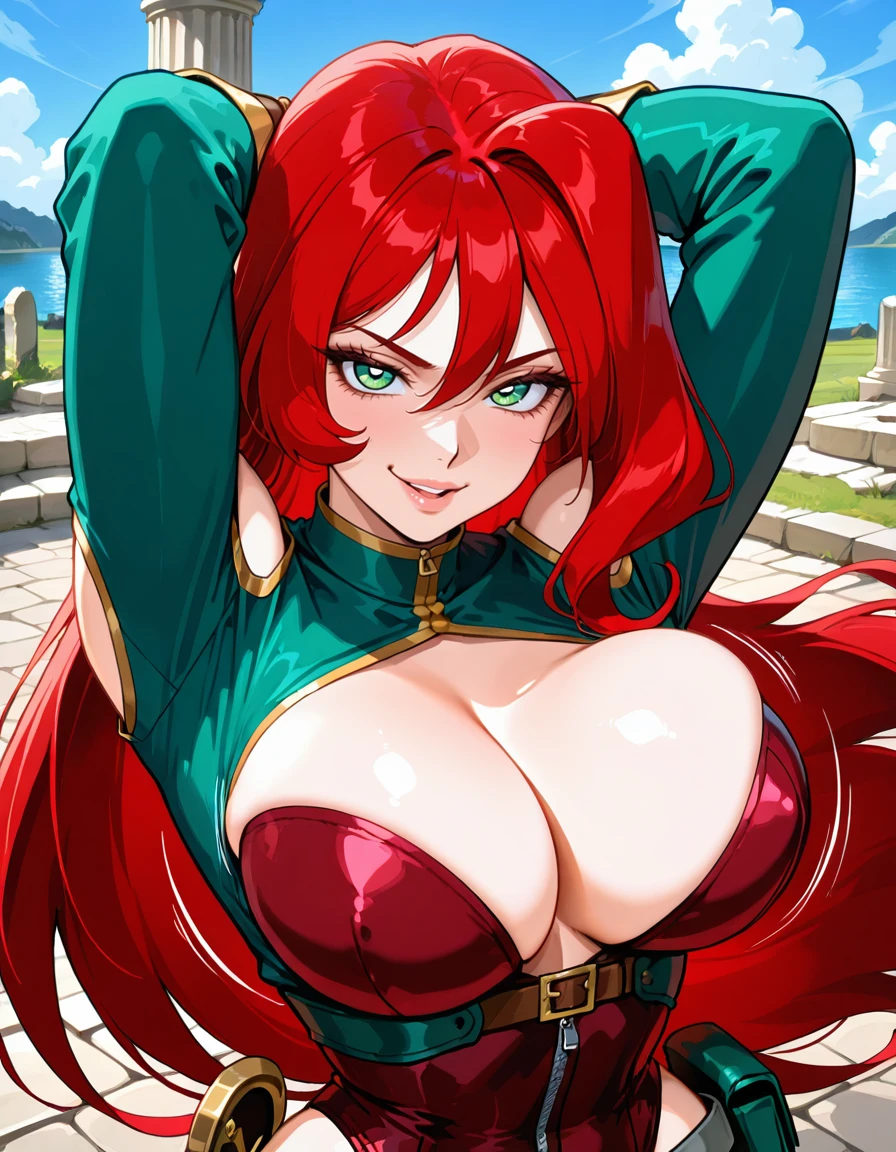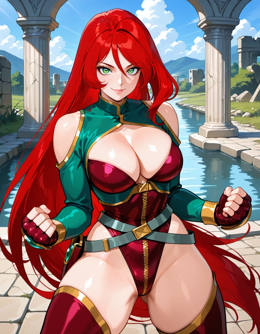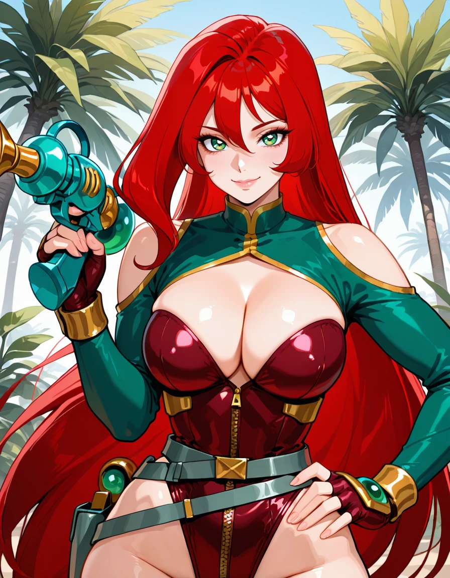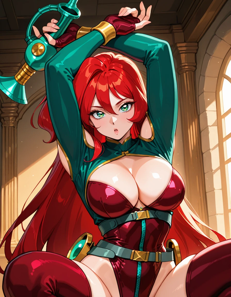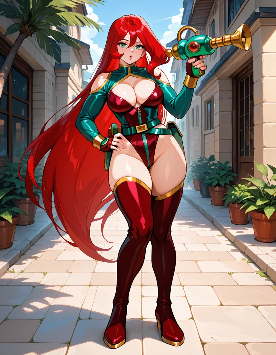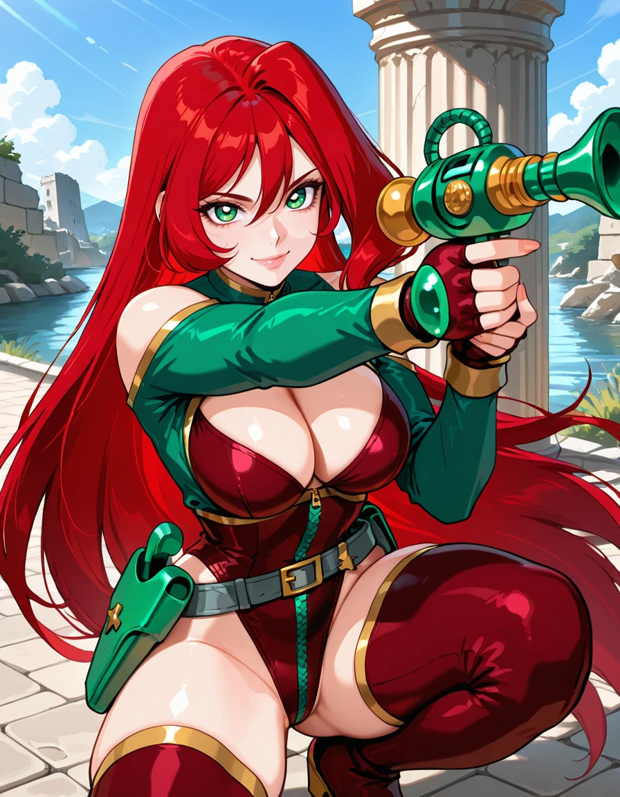(mysterious-power), (retro artstyle, green eyes, red hair, very long hair, huge swept bangs, hair between eyes, sidelocks, lips, large breasts, wide hips, thick thighs), (red leotard, clothing cutout, shoulder cutout, long sleeves, fingerless gloves, cleavage cutout, zipper, grey twin loose belts, cross belts, holster, yellow trim, thigh boots)