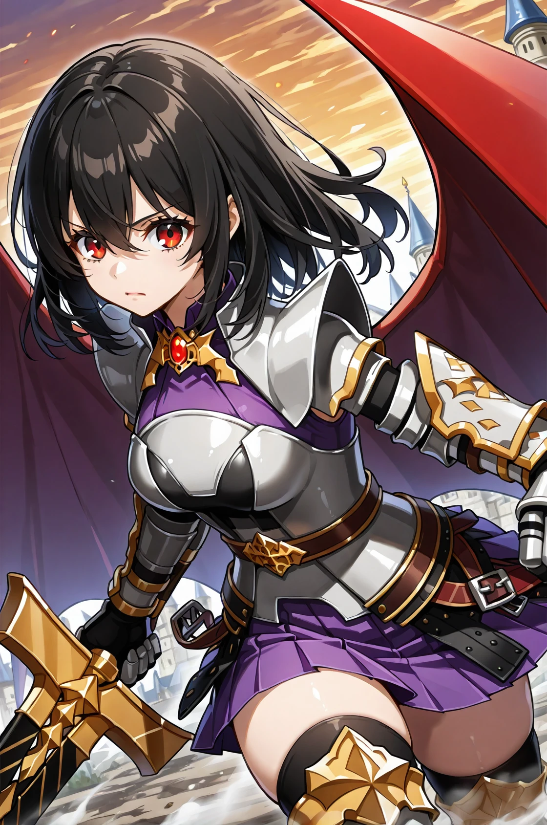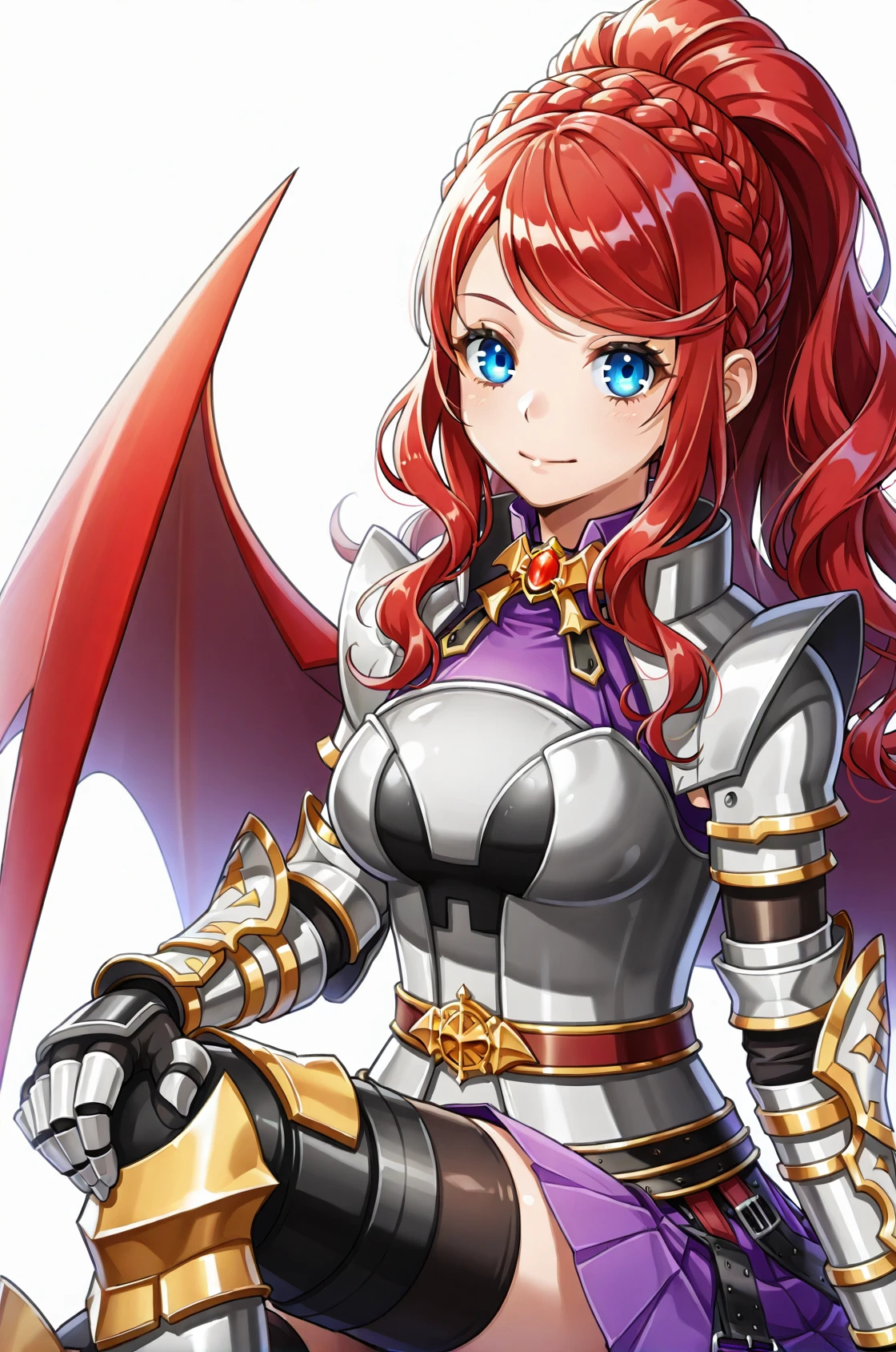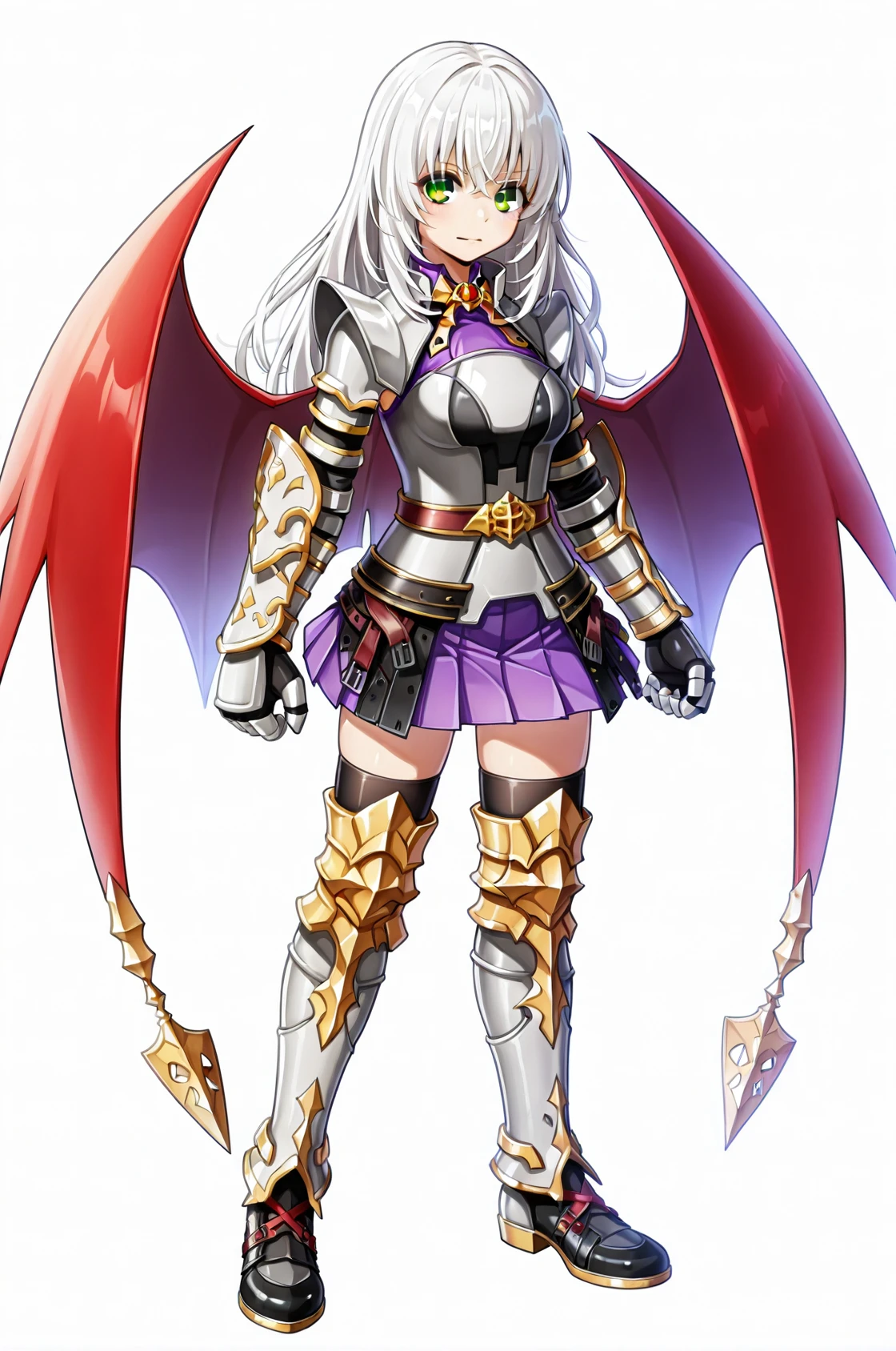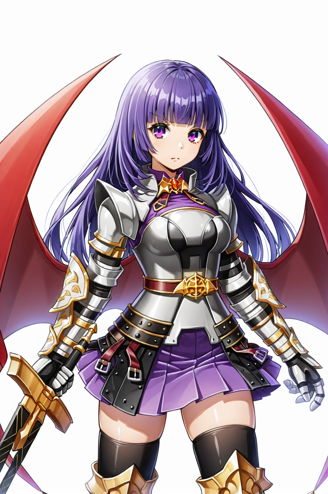 prompt: DKRO, armored dress, shoulder armor, gauntlets, red demon wings, purple skirt, pleated skirt, belt, thighhighs under boots, armored thigh boots