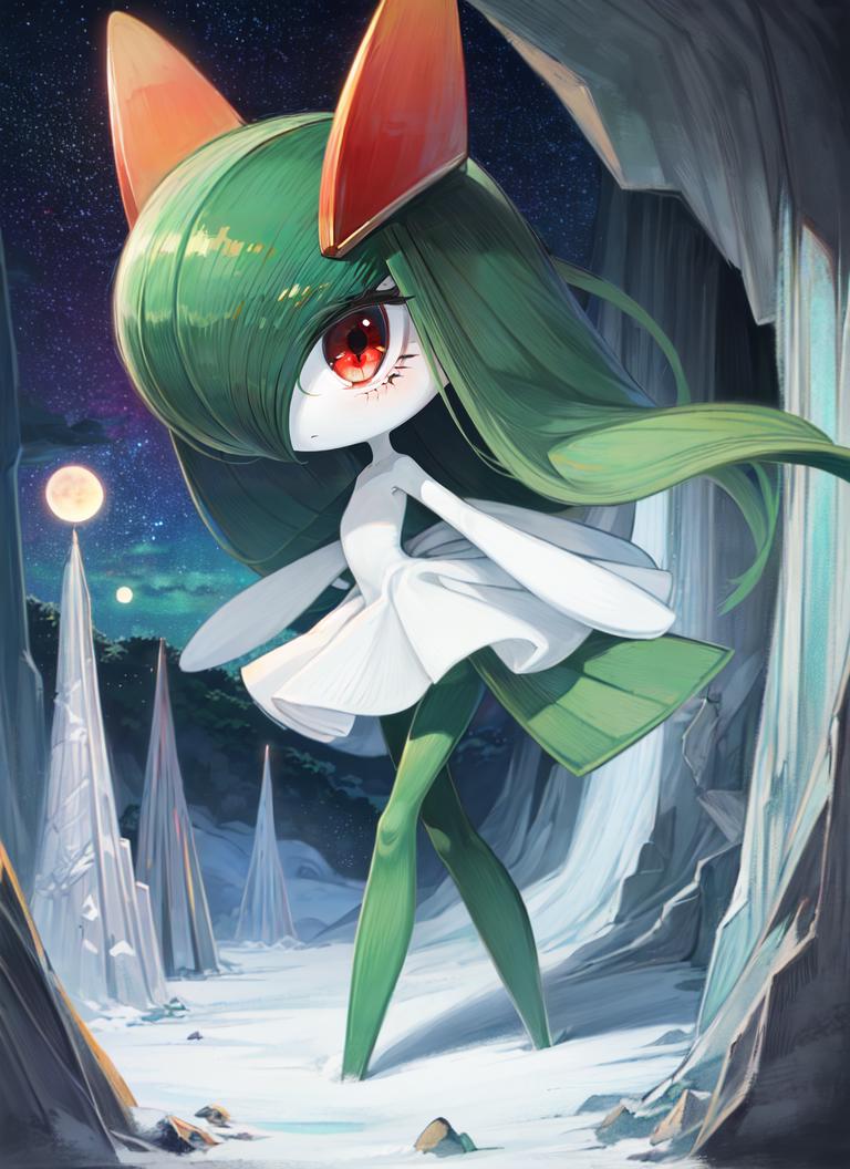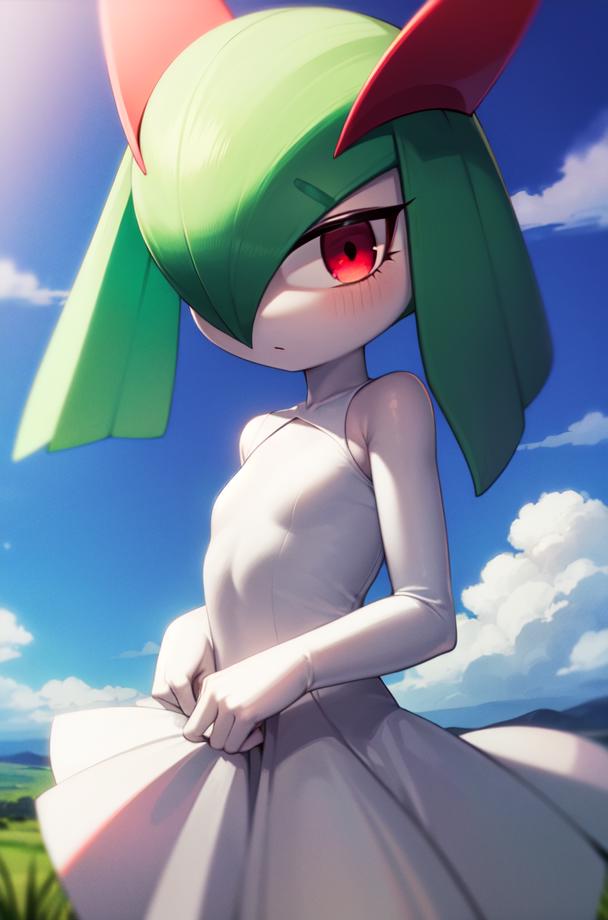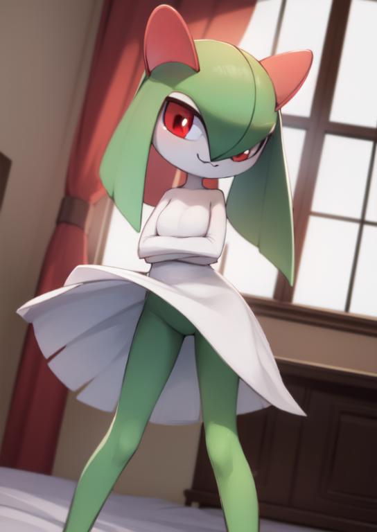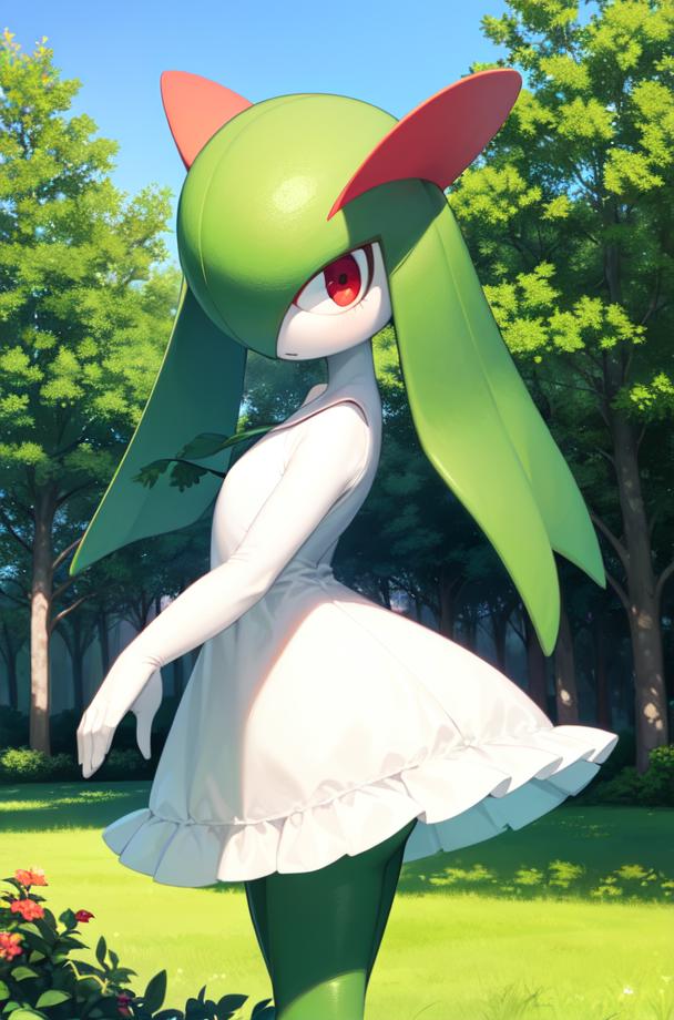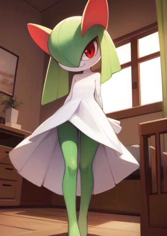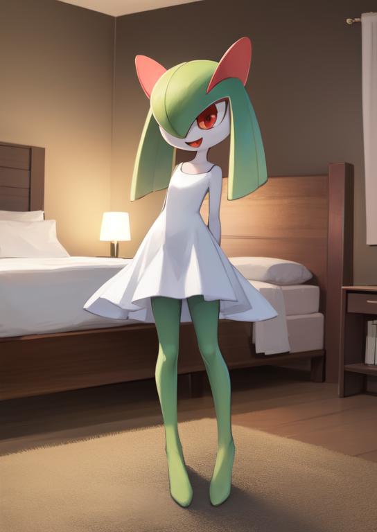 To actually prompt Kirlia you should include most if not all of the required tags which I will reiterate here: kirlia, green hair, red eyes, white dress, green skin