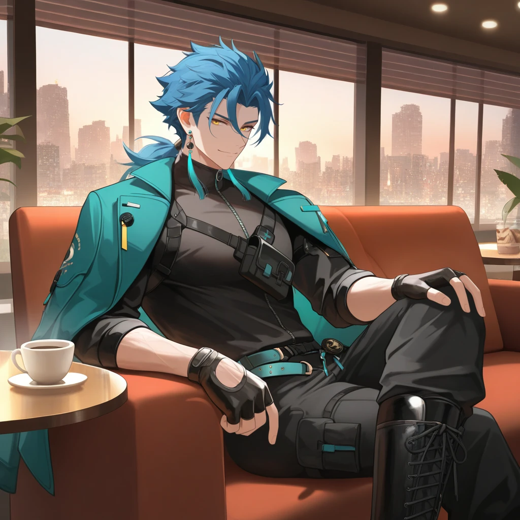 JiyanWW, Jya_Cas, low ponytail, blue hair, yellow eyes, cargo pants, black cargo pants, snap-fit buckle, teal belt, open belt, tassel, crossed belts, black belt, black pouch, zipper shirt, turtleneck shirt, black shirt, sleeves past elbows, fingerless gloves, black gloves, ????? strap, harness, ????? pouch, earrings, jacket on shoulders, teal jacket, collared jacket, black boots, cross-laced boots,The results of your generations are dependent on the additional LoRAs, weights, and models you use, so it may not work or come out as consistent as my sample images.