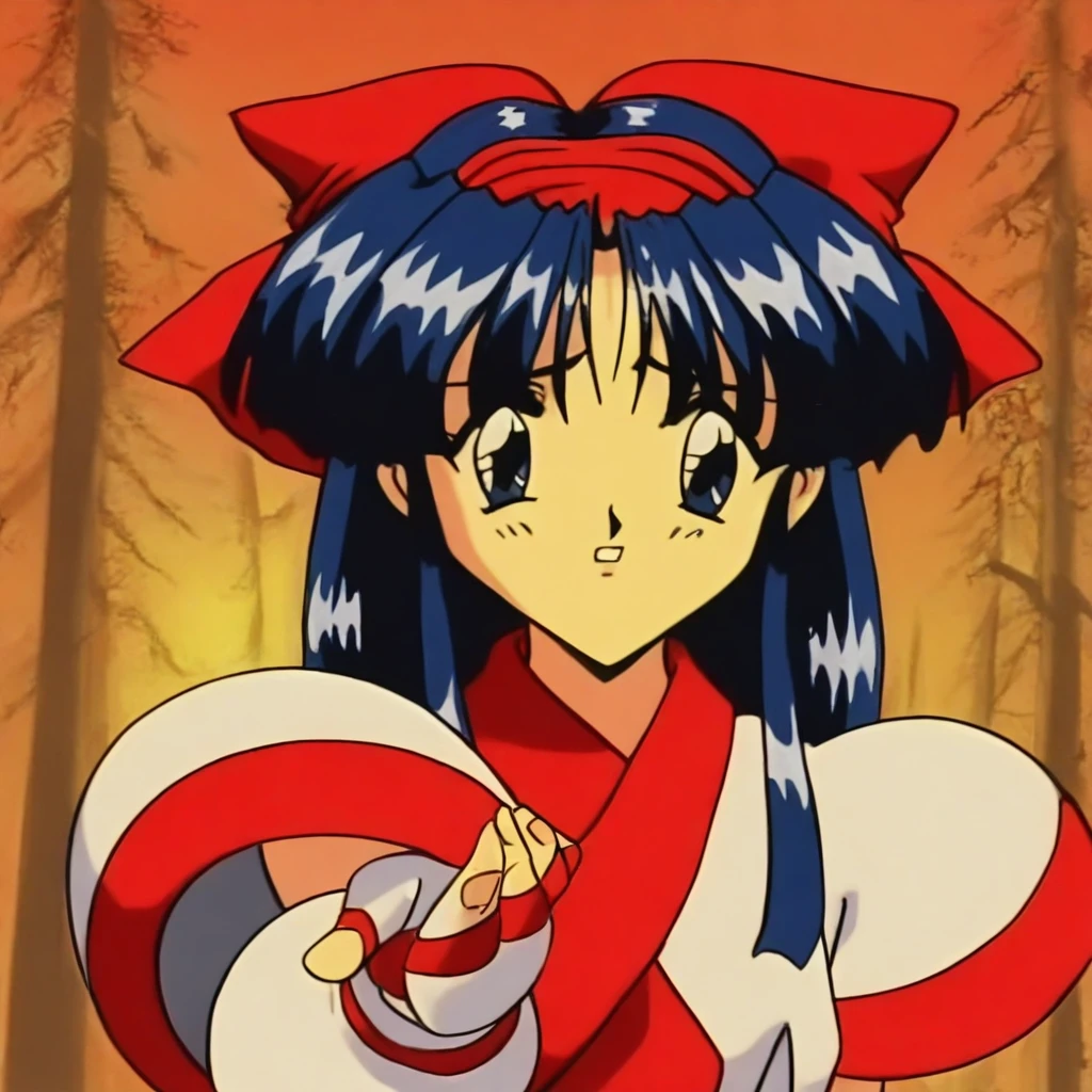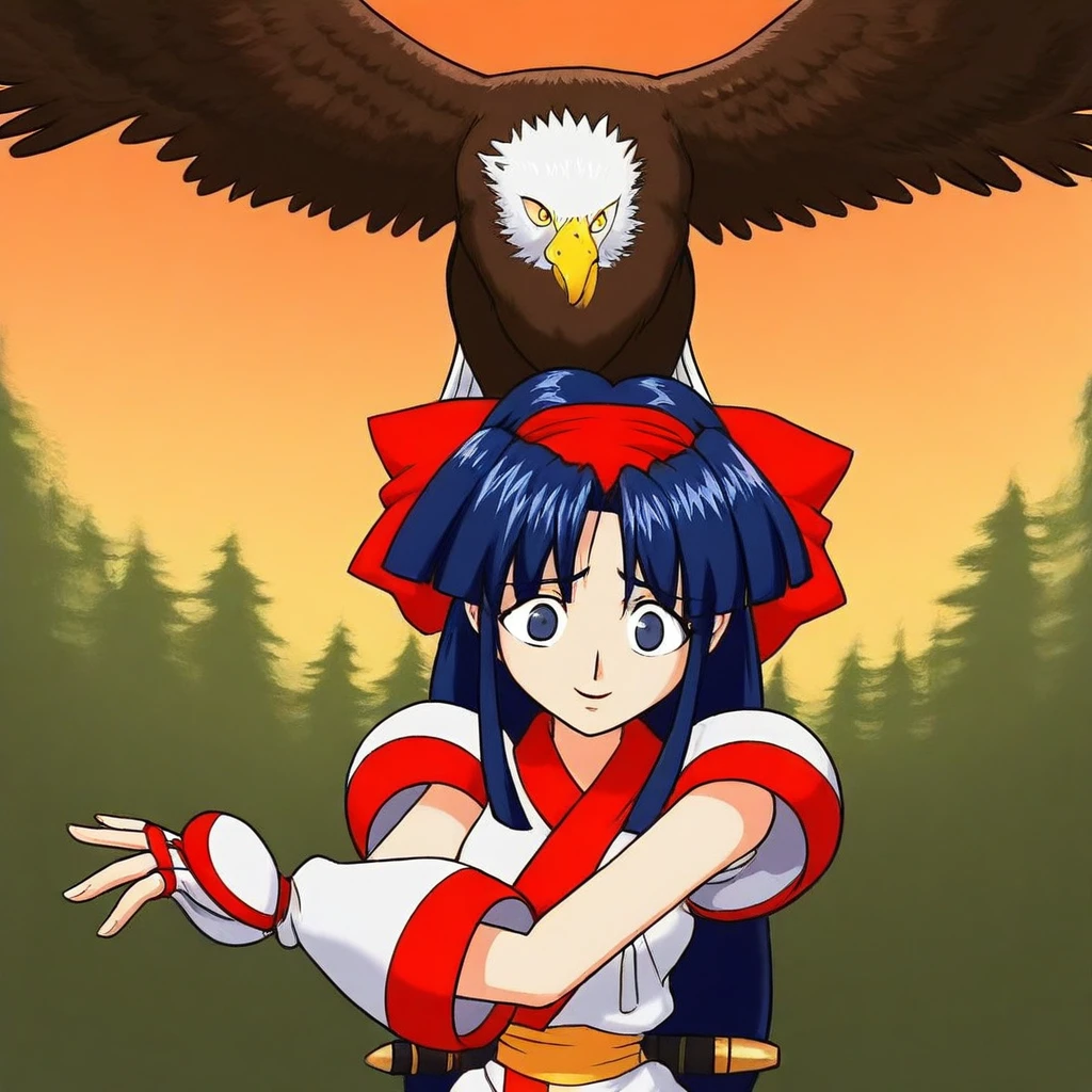 NKRRSSV,Iong hair,long hair locks, deep blue hair,parted bangs, red hairband,red bow,ainu clothes,sleeveless clothes,fingerless gloves,pants,red shoes,yellow sash