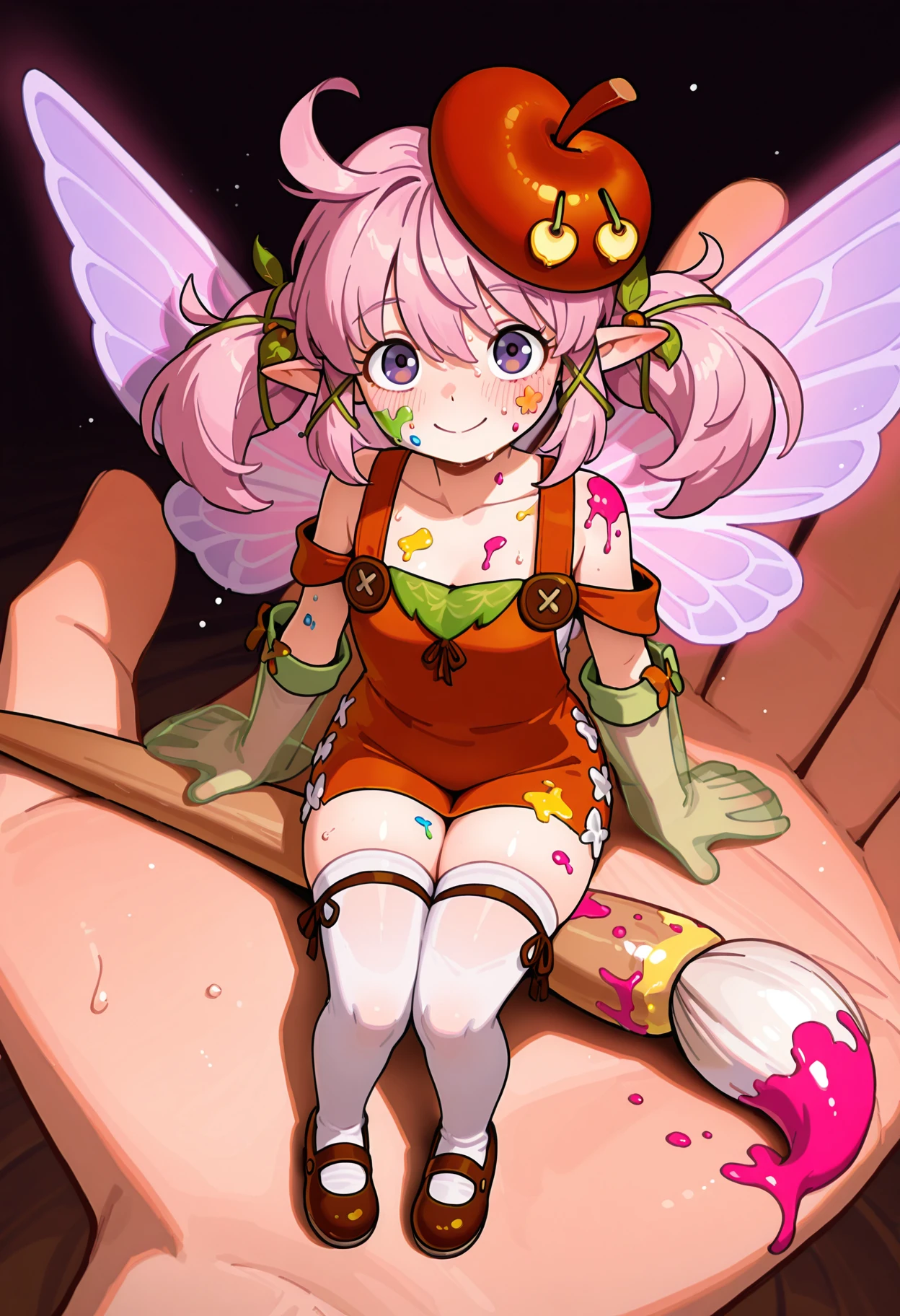 orange suspenders, zettai ryouiki, hat, socks, apple beret, green gloves, see-through gloves, brown mary janes, leaf ornaments, vine ornaments,  paint splatter, large paint brush, paint splatter on face