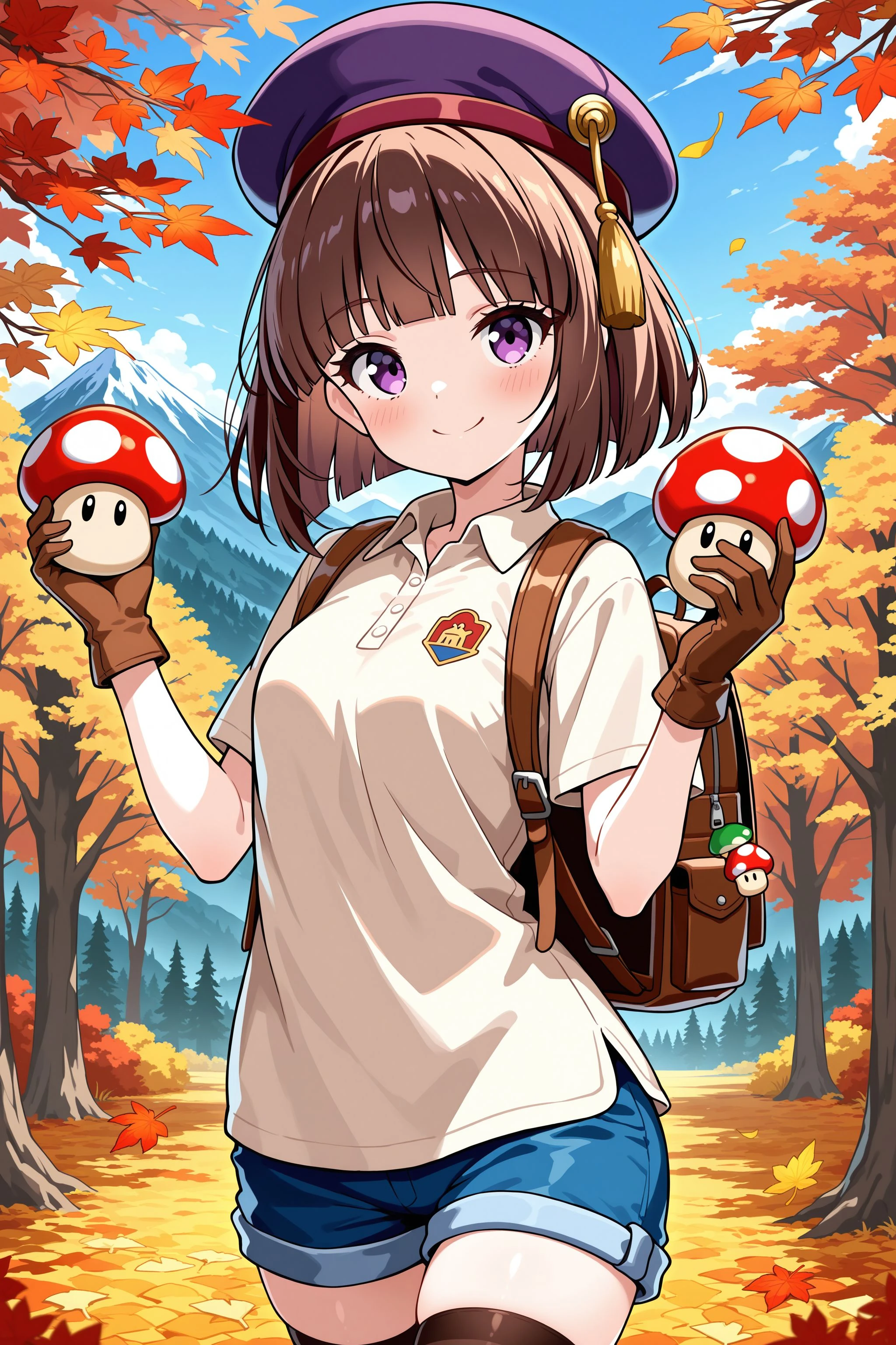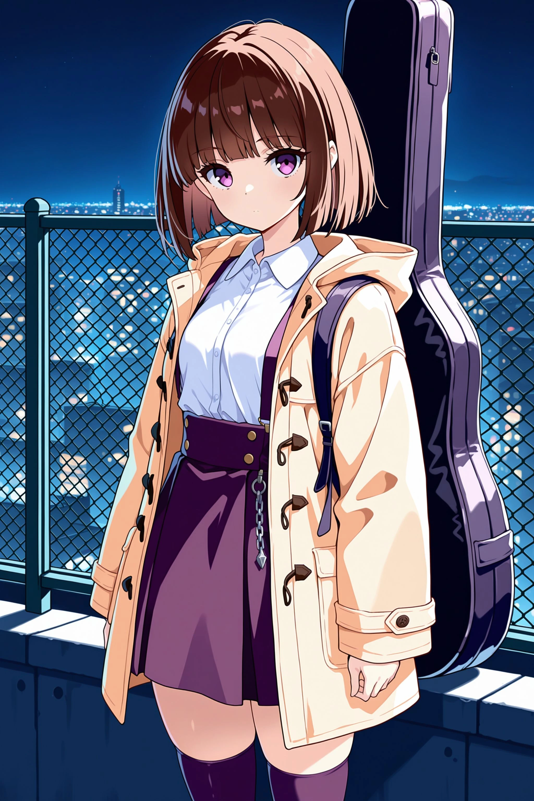 small breasts, purple hair, brown hair, blunt bangs, bob cut, pink eyes, purple eyes