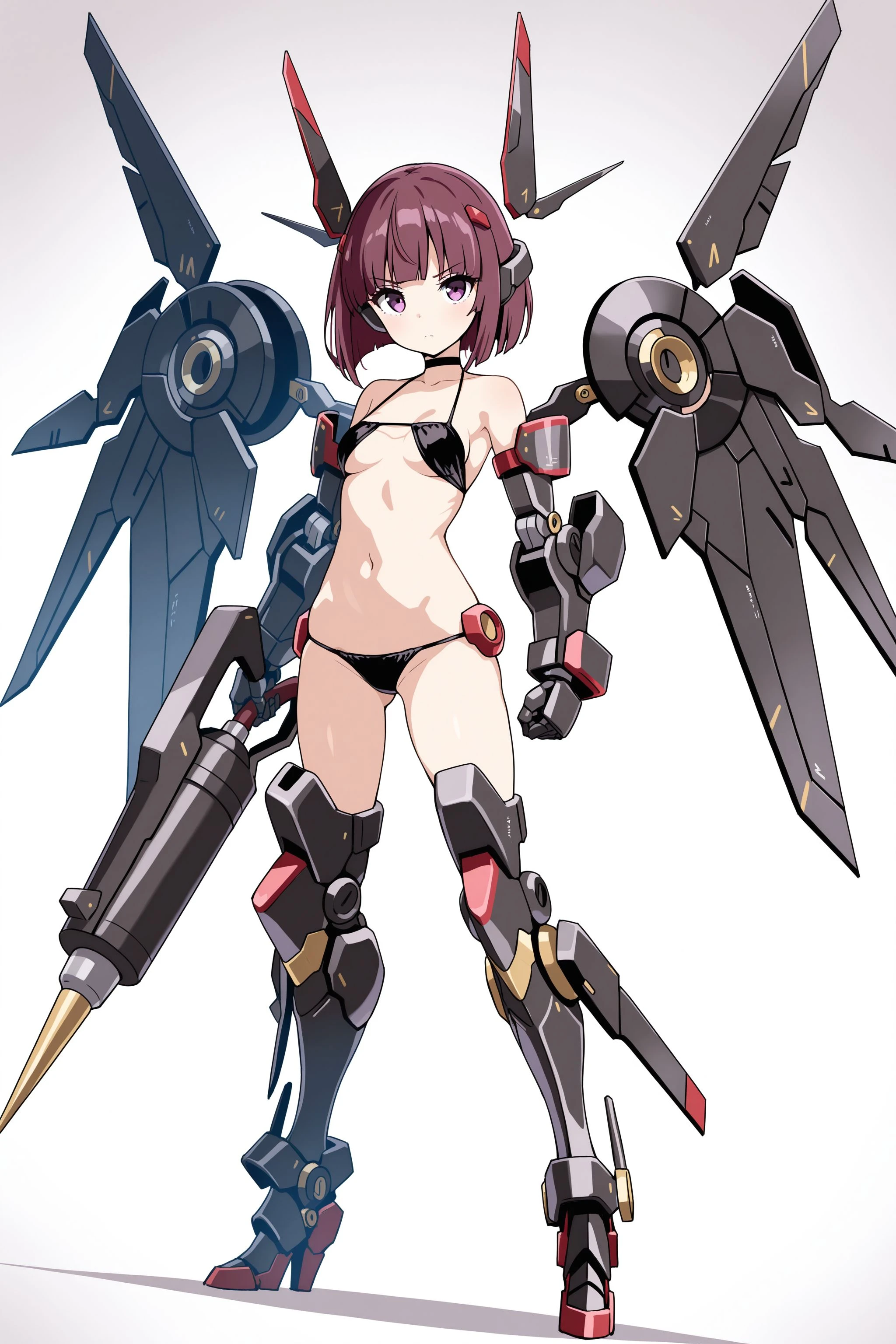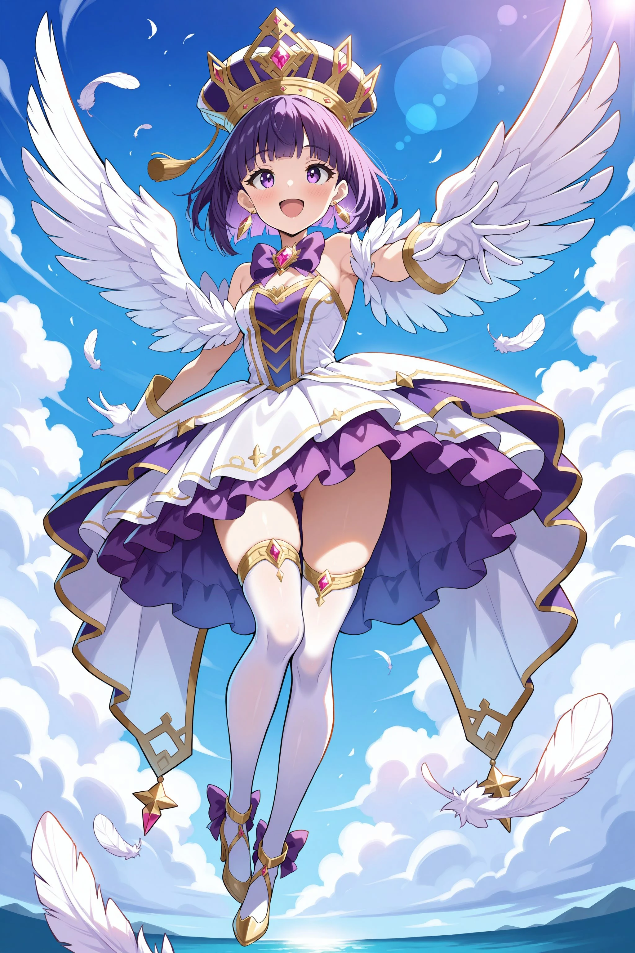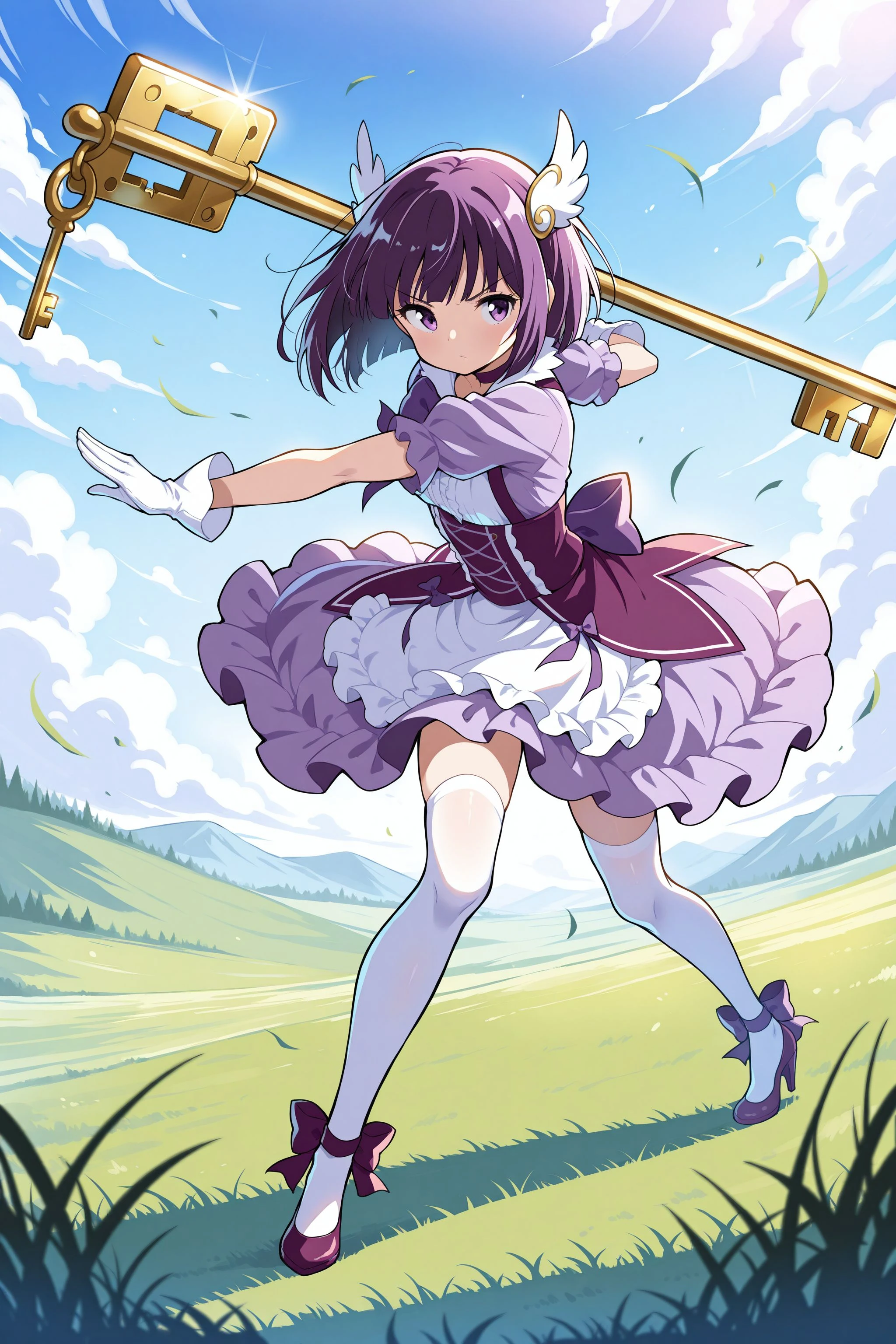 Magica2019: magica2019, wing hair ornament, purple dress, puffy short sleeves, choker, purple bow, bowtie, white gloves, purple skirt, white thighhighs, high heels