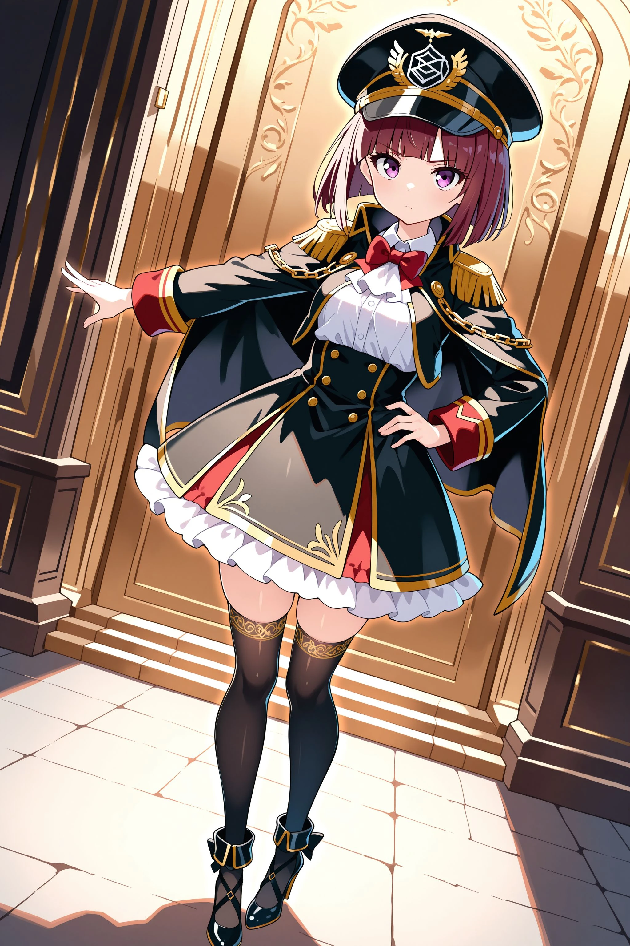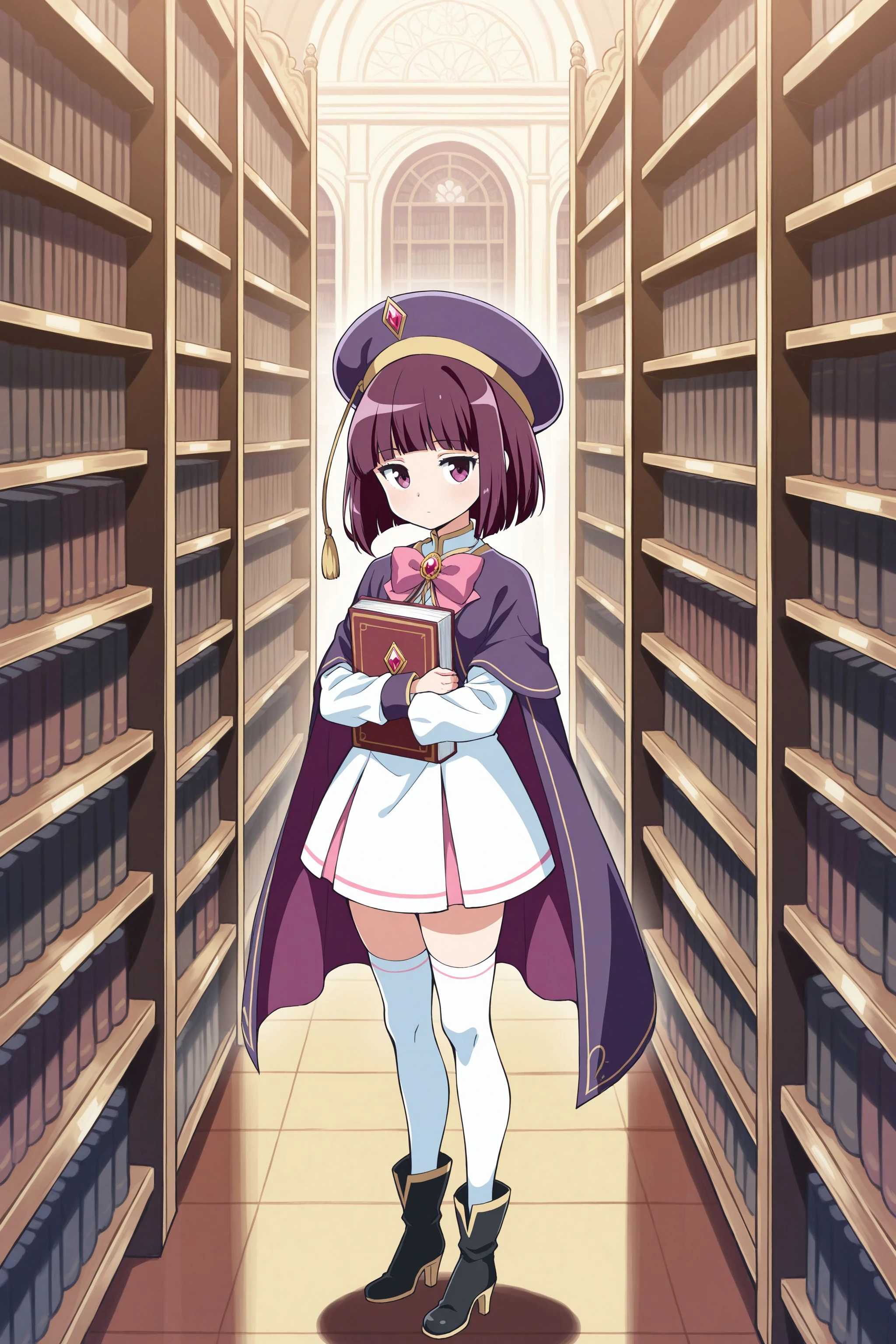 Magica2020: magica2020, purple headwear, gem, beret, aiguillette, purple cape, bowtie, pink bow, white dress, long sleeves, white thighhighs, high heel boots,