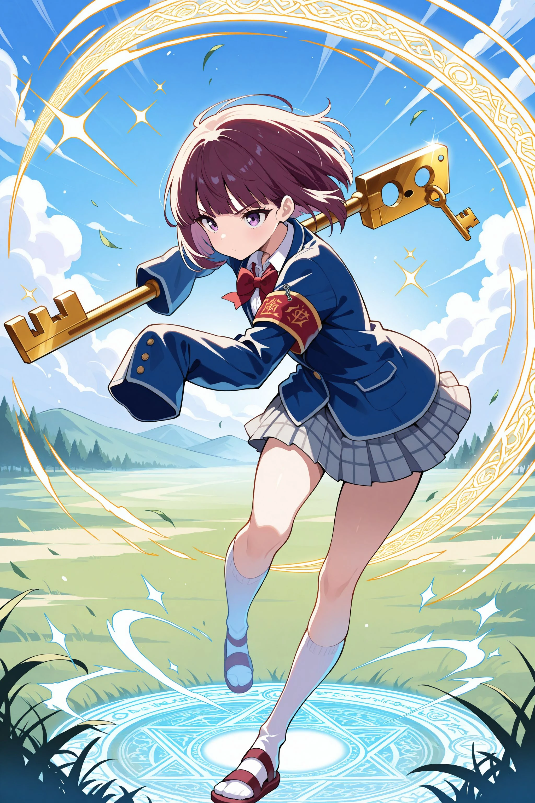 School uniform: school uniform, blazer, armband, long sleeves, sleeves past fingers, red bowtie, white shirt, pleated skirt, plaid skirt, grey skirt, white socks, sandals