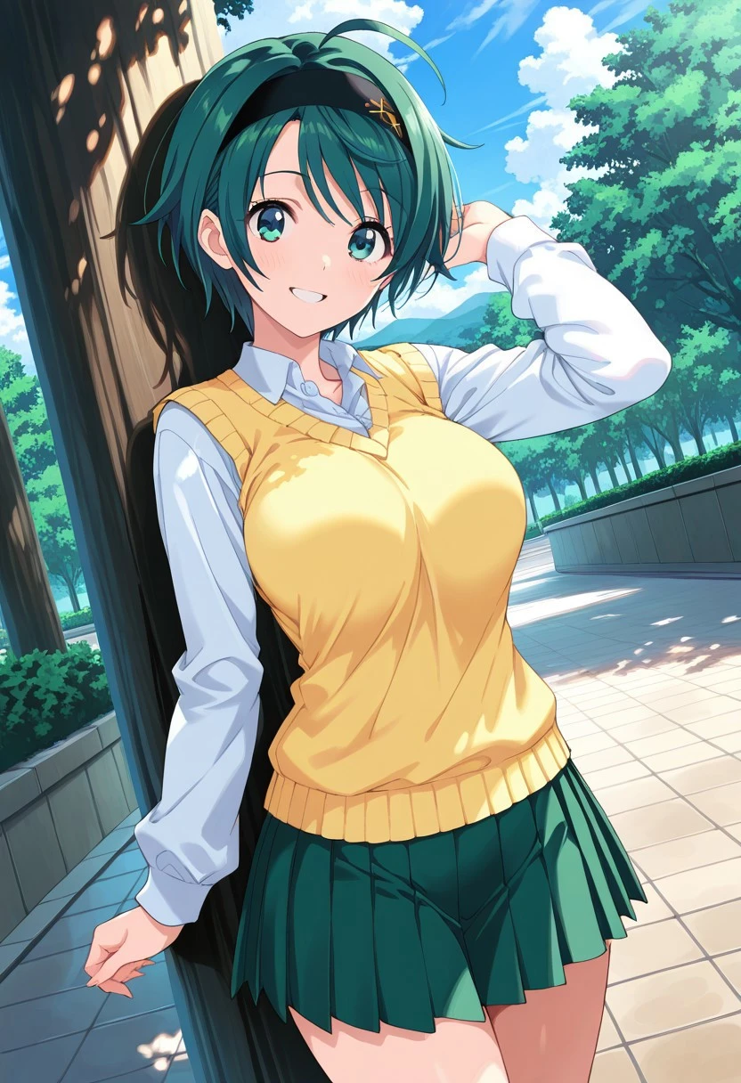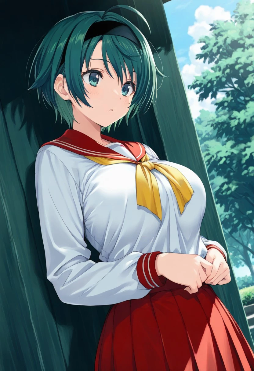 Chie Yoshioka, green hair, black headband, short hair, blue-green eyes, ahoge, large breasts,