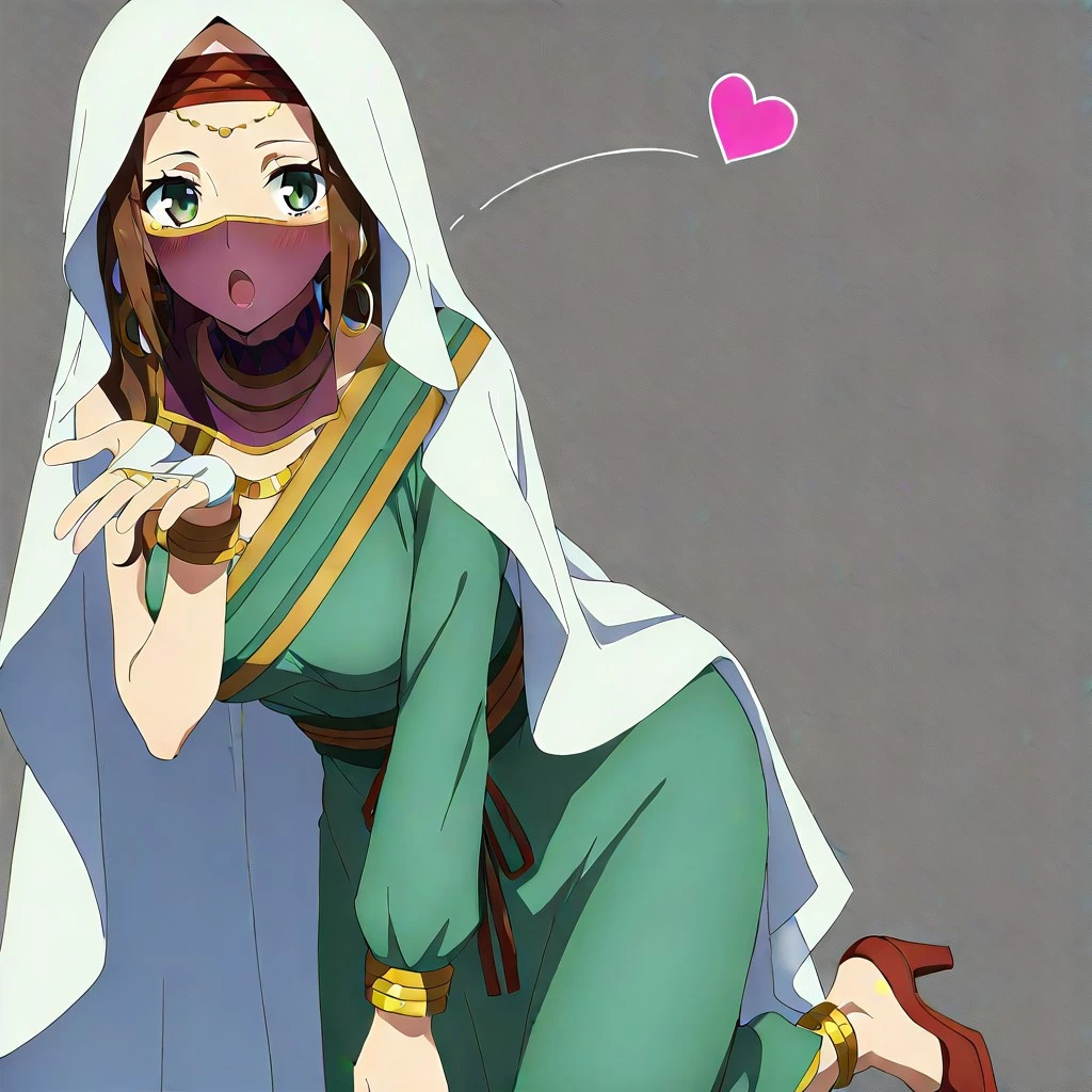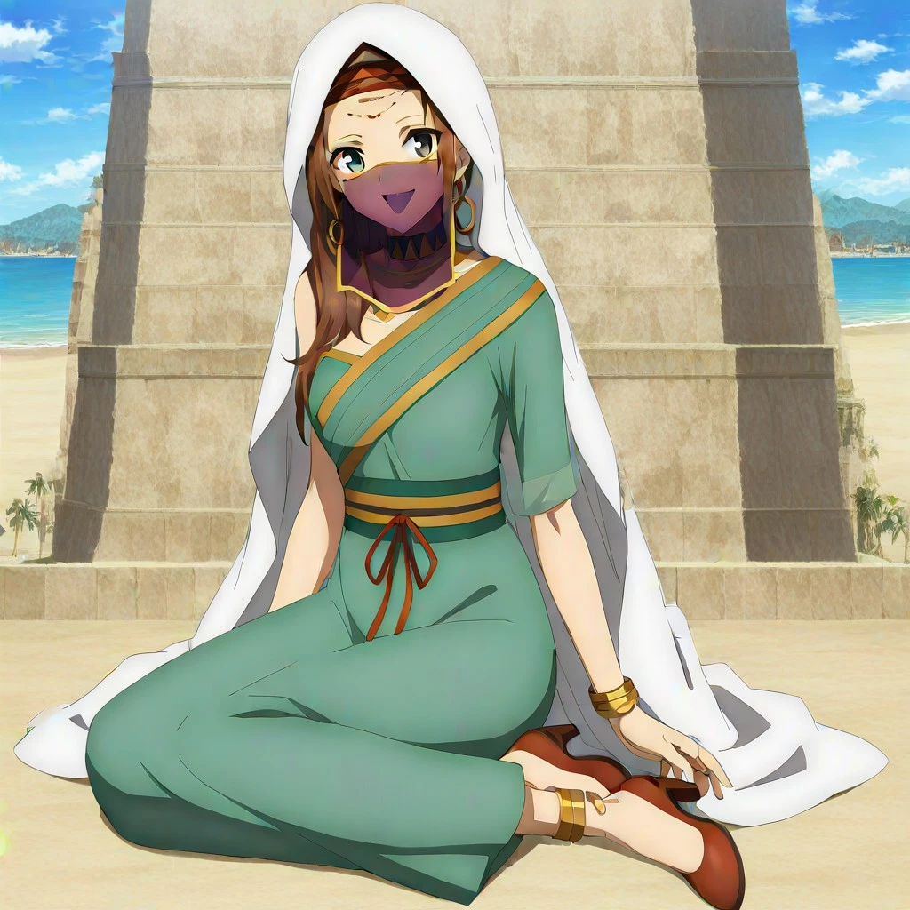 siduri \(fate\), brown hair, long hair, sidelocks, green eyes, jewelry, choker, veil, mouth veil, green dress, skirt, sash, bracelets, anklet, heels, large breasts, 1girl, solo
