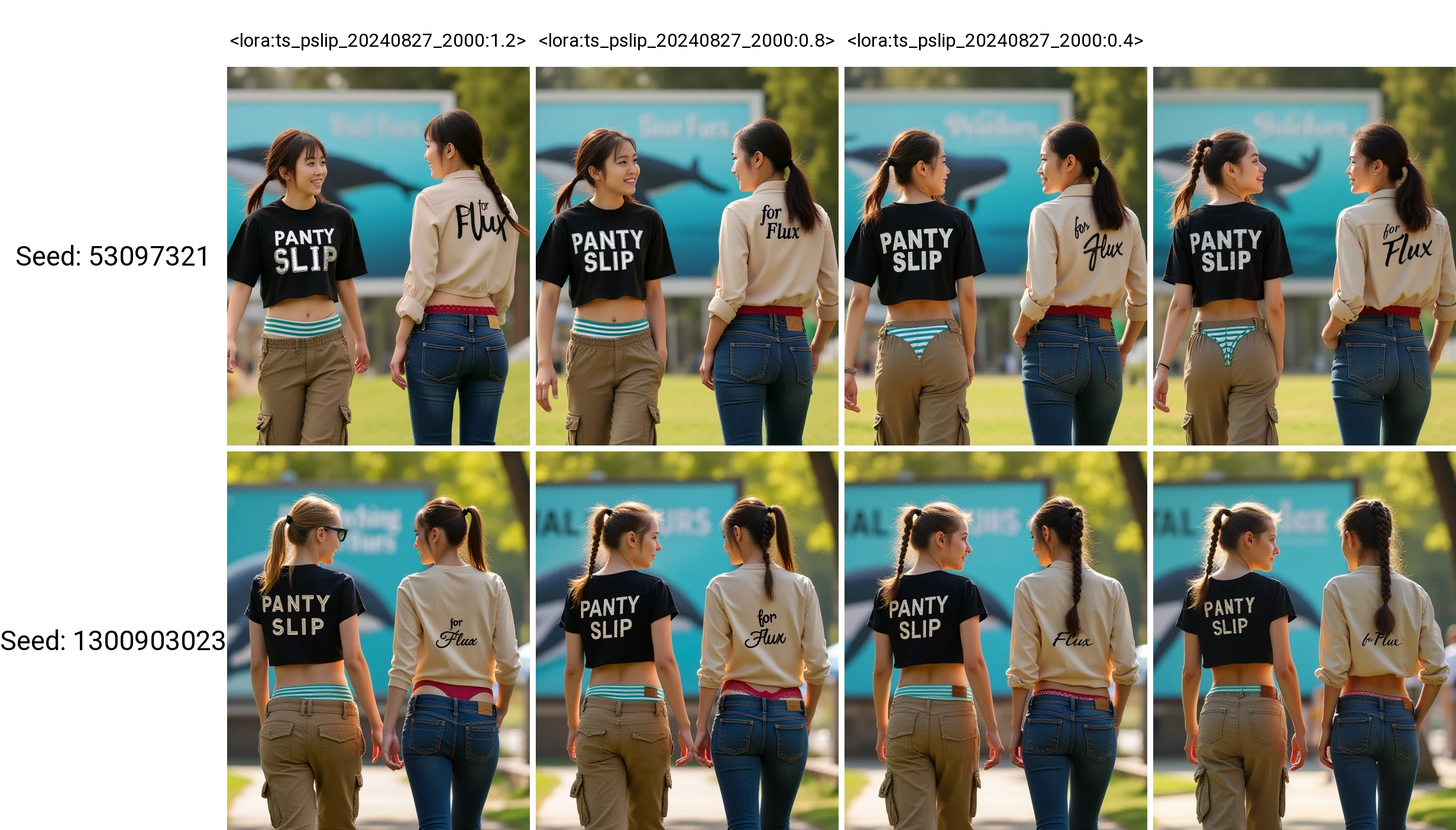 pslip is the technical trigger word, but it is not needed as the LoRA works best if you describe the overall situation. Adding thong and/or whaletail increases the likelihood of the classic whaletail appearance. (and it still might appear even without these prompts). fullback will give the exposed area more continuous coverage. Can also handle front/side views, though there are no specific prompts in this model for that.
