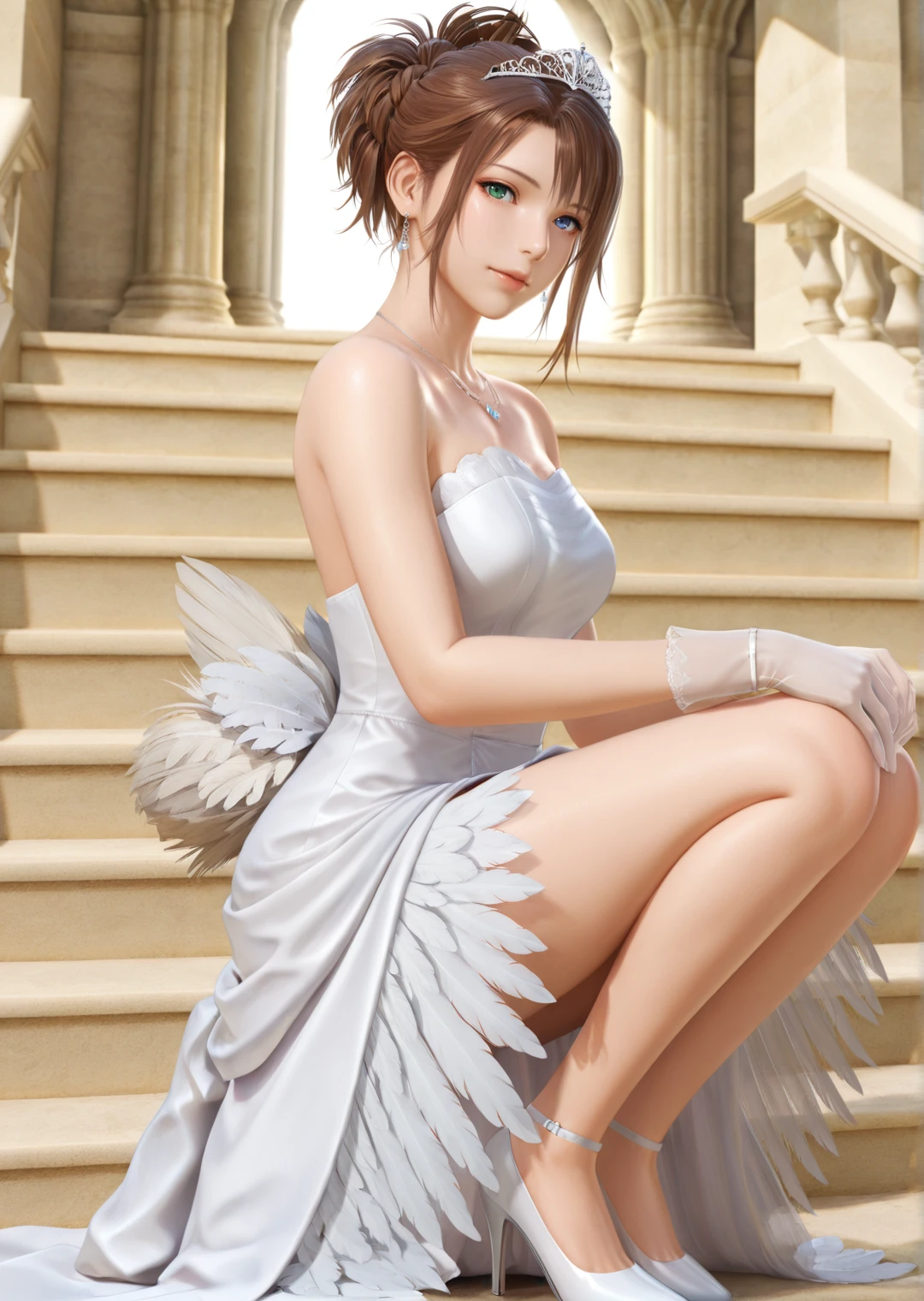 Yuna (Wedding Dress), 1girl, solo, short hair, brown hair, hair up, heterochromia, blue eyes, green eyes, jewelry, tiara, necklace, earrings, ???? shoulders, feathers, feather back bow, wedding dress, white gloves, high heels, realistic