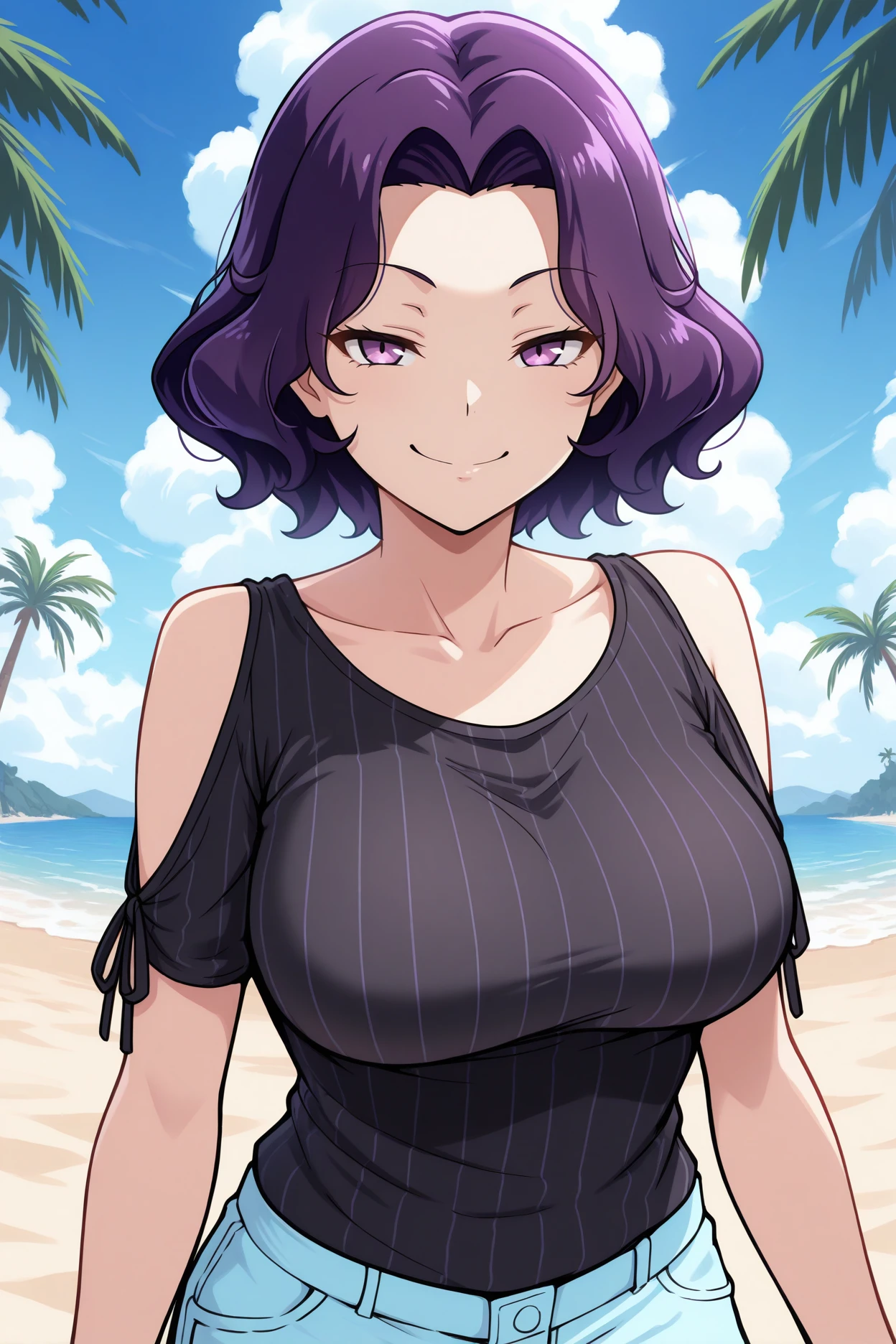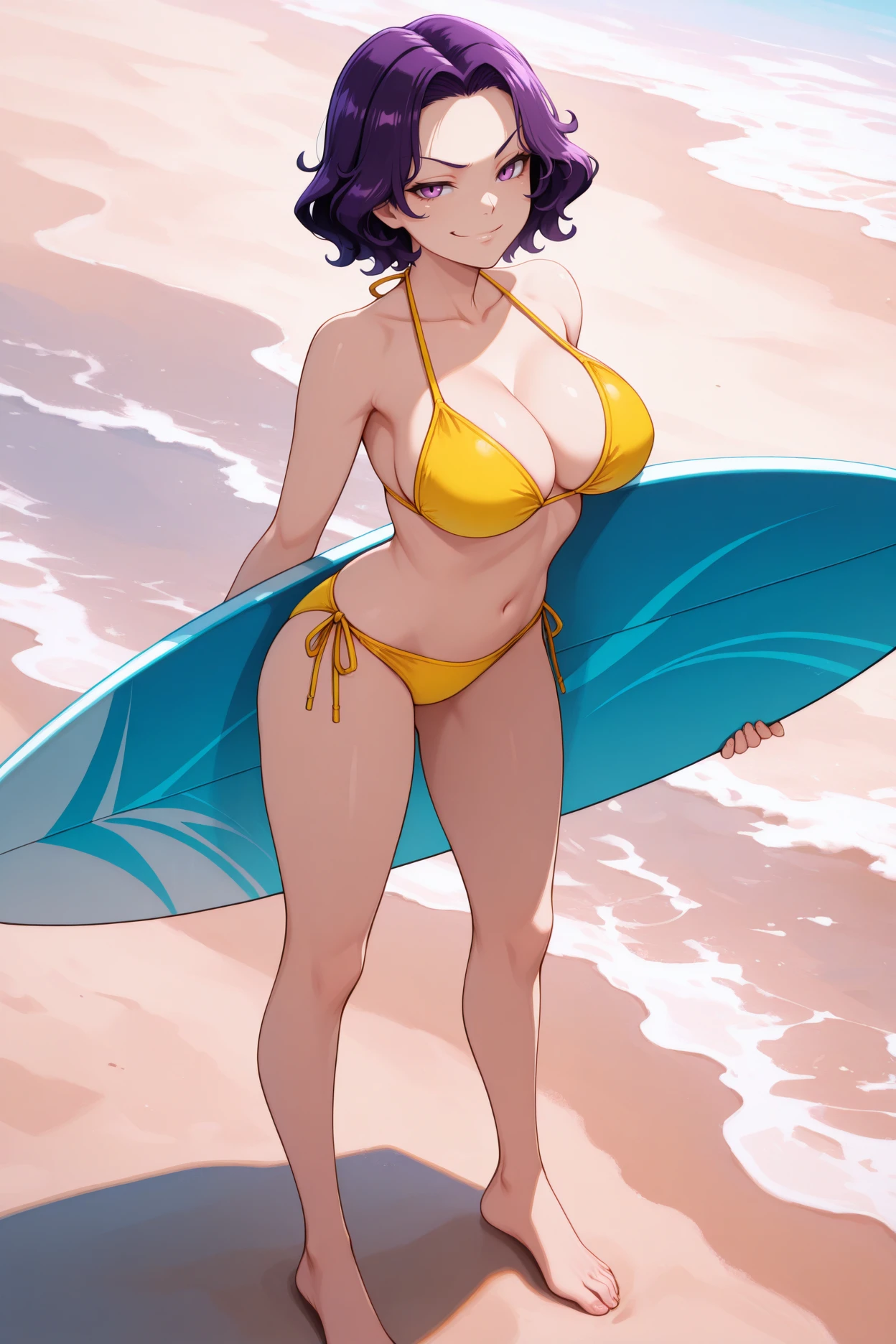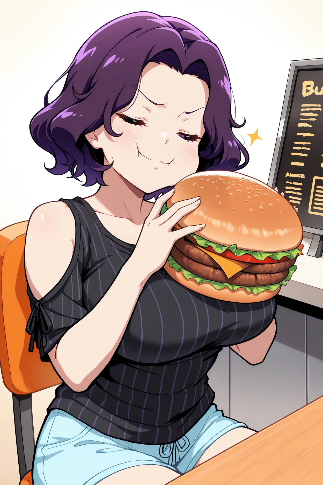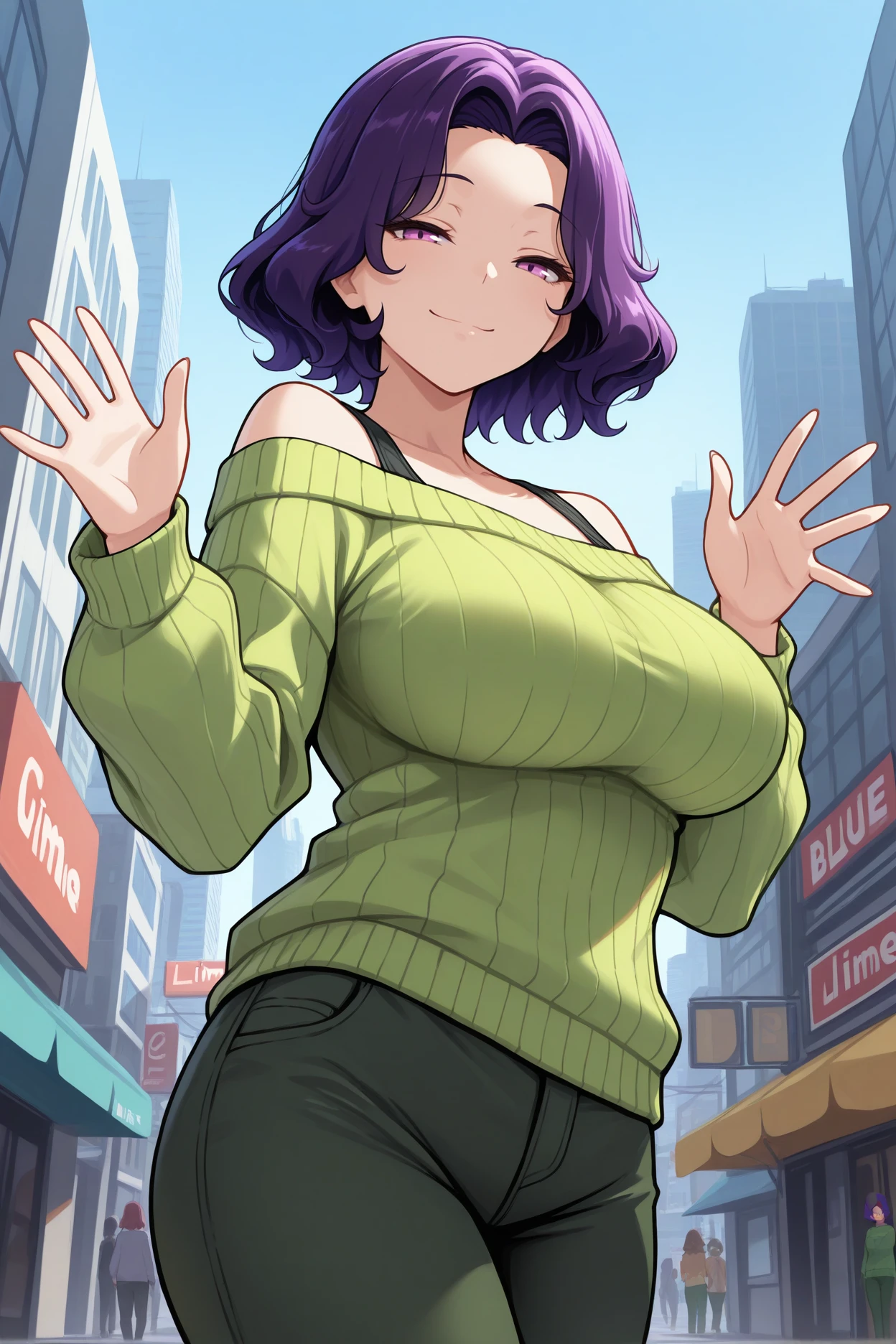 gblueah, purple hair, short hair, wavy hair, purple eyes, large breasts