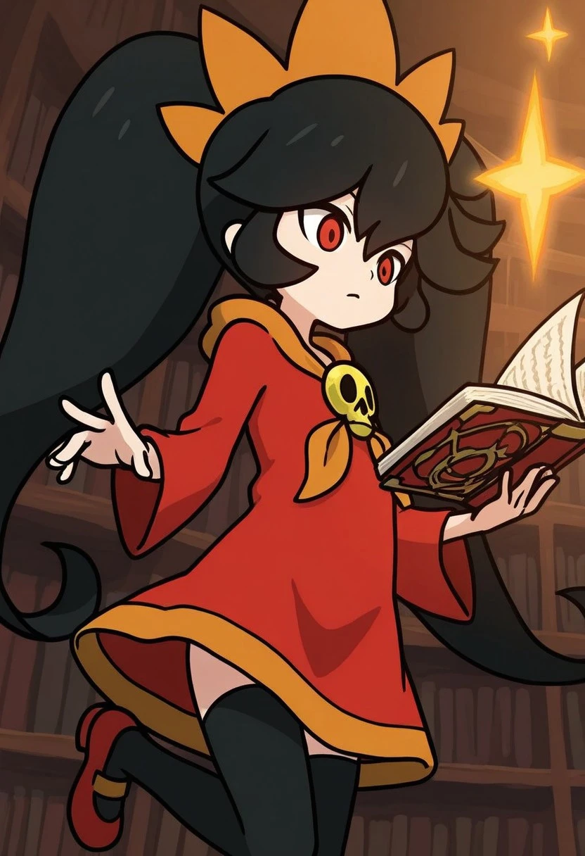 Prompts: ashley, warioware, black hair, red eyes, hair ornament, twintails, red dress, mary janes, red footwear, black legwear, pantyhose/thighhighs,