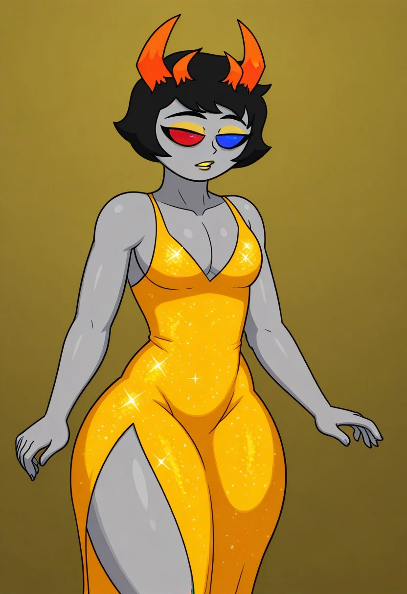 1boy, femboy, homestuck troll, grey skin, heterochromia, red sclera, blue sclera, black hair, short hair,
