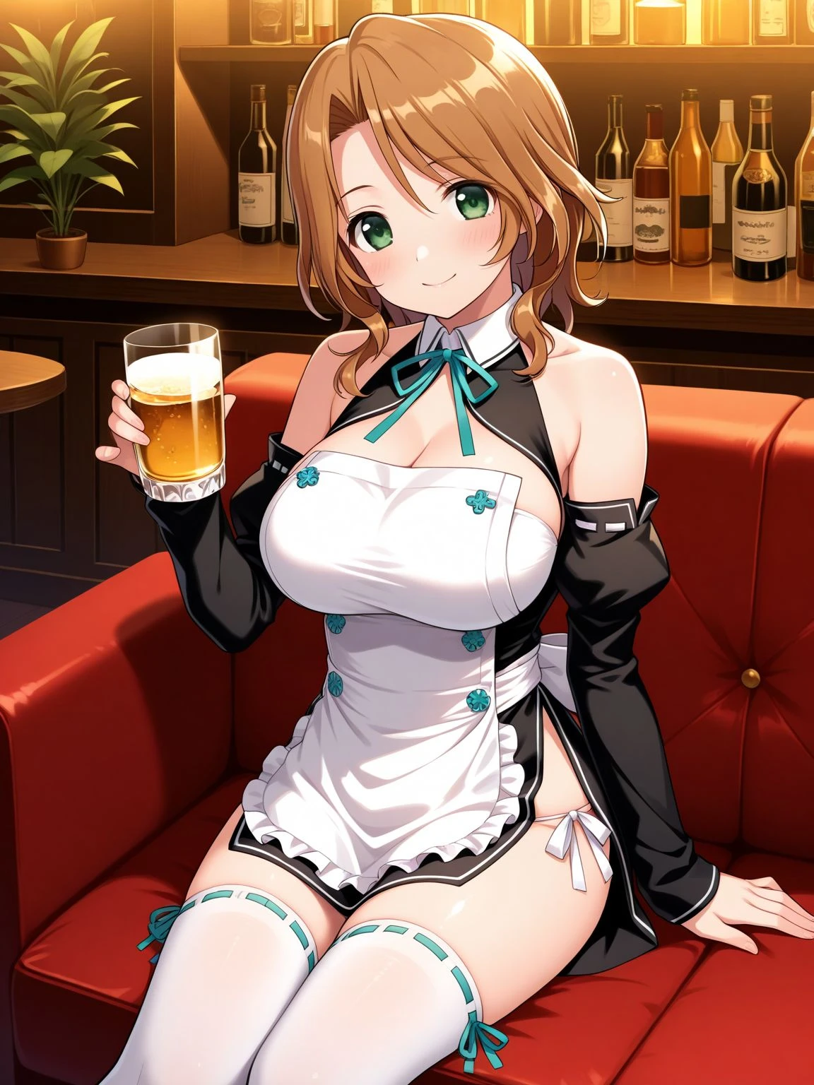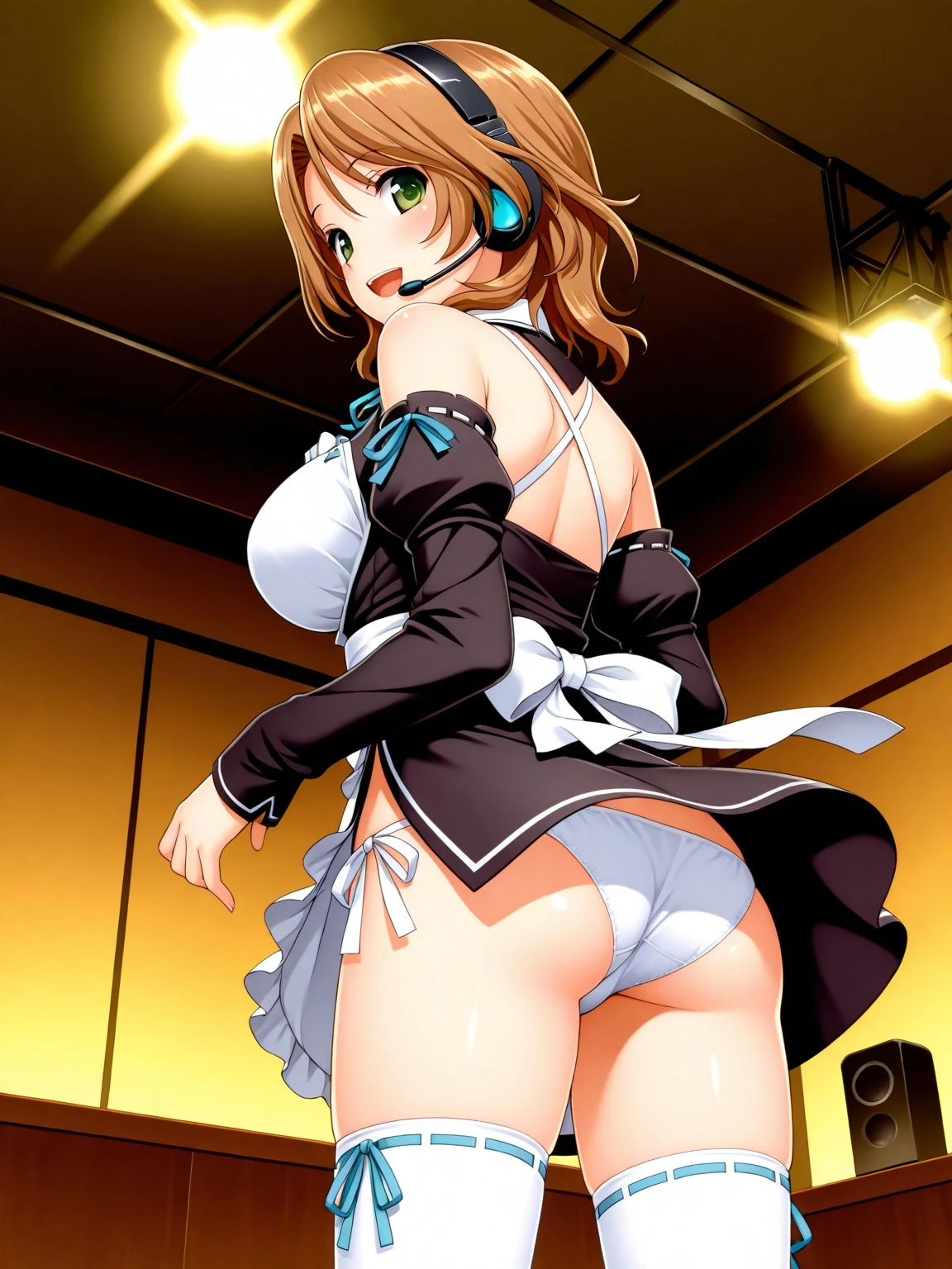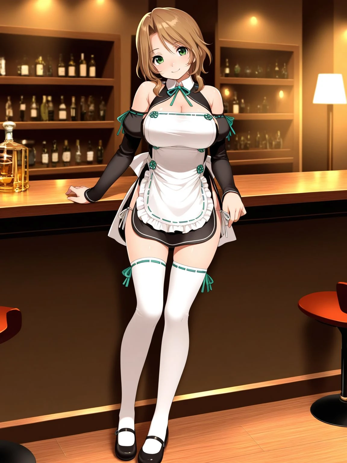 apron,long sleeves,white thighhighs,zettai ryouiki,ribbon-trimmed legwear,side-tie panties,underwear,panties,shoes,dress,ribbon,bare shoulders