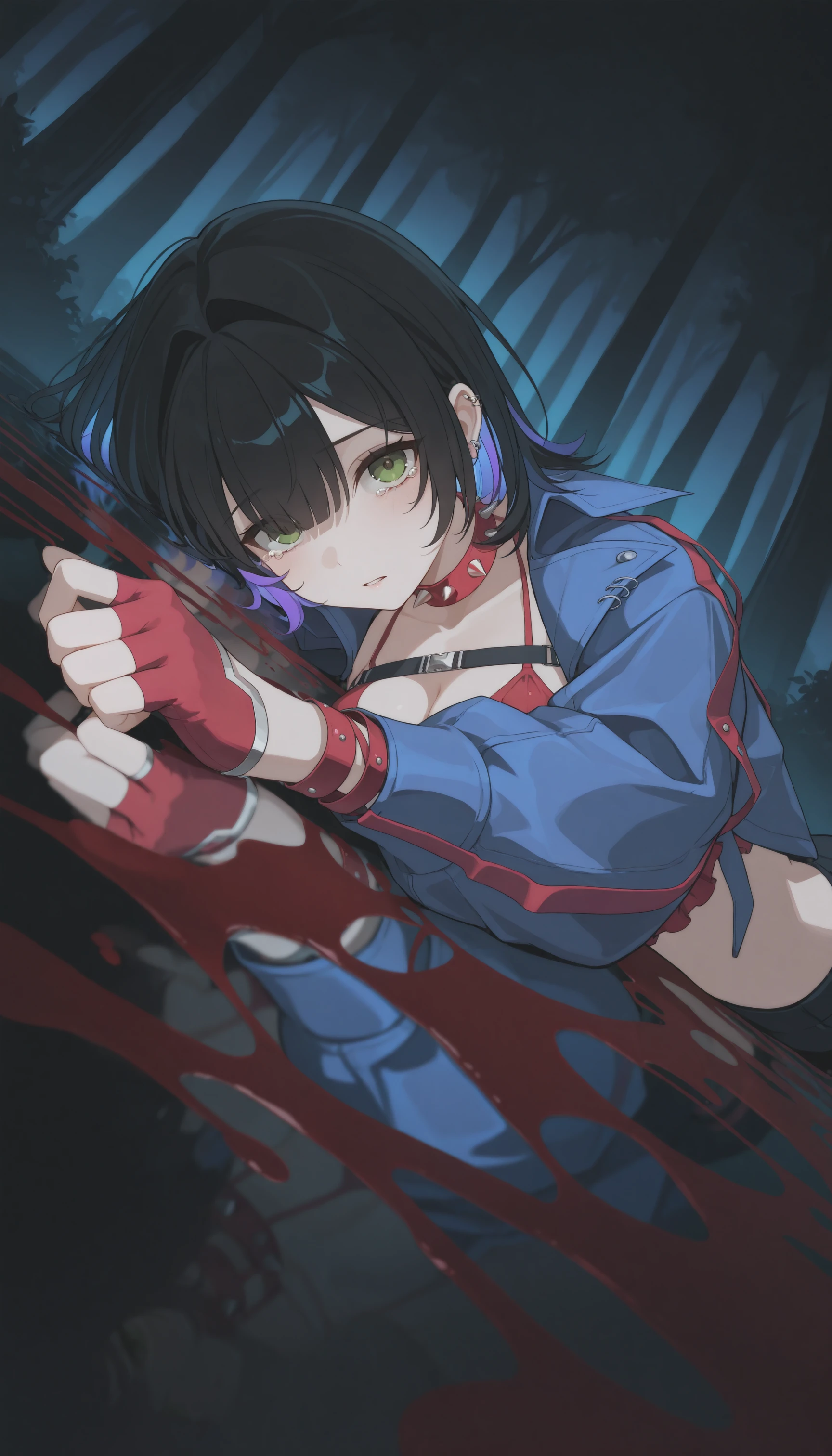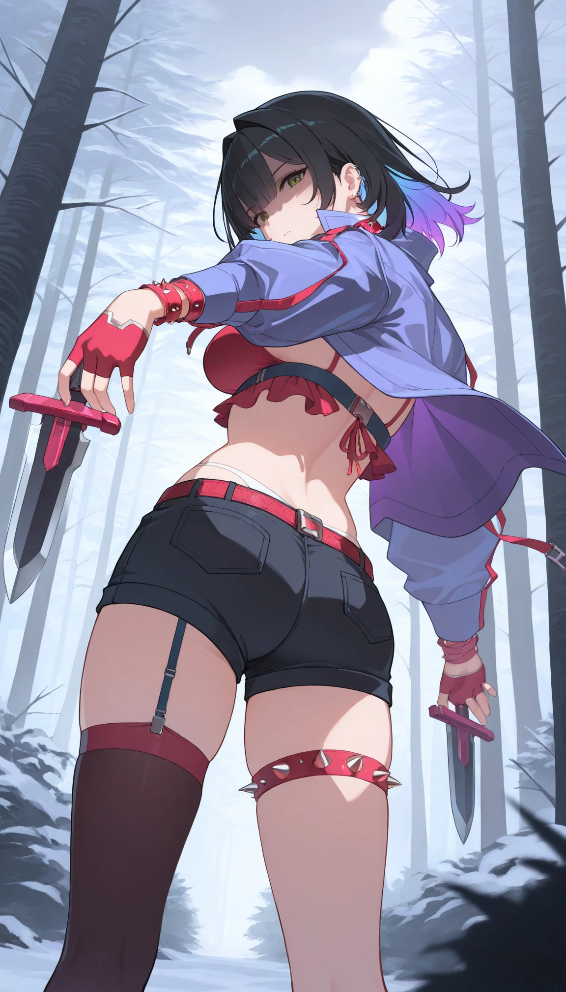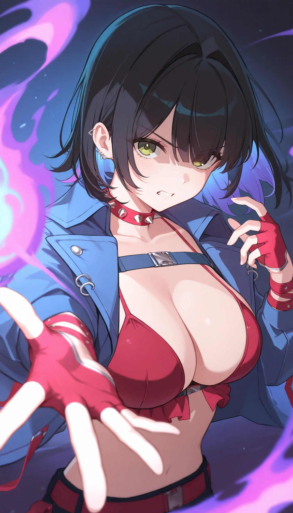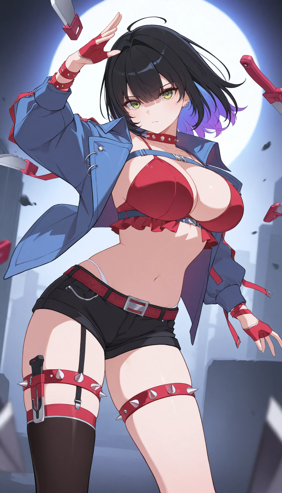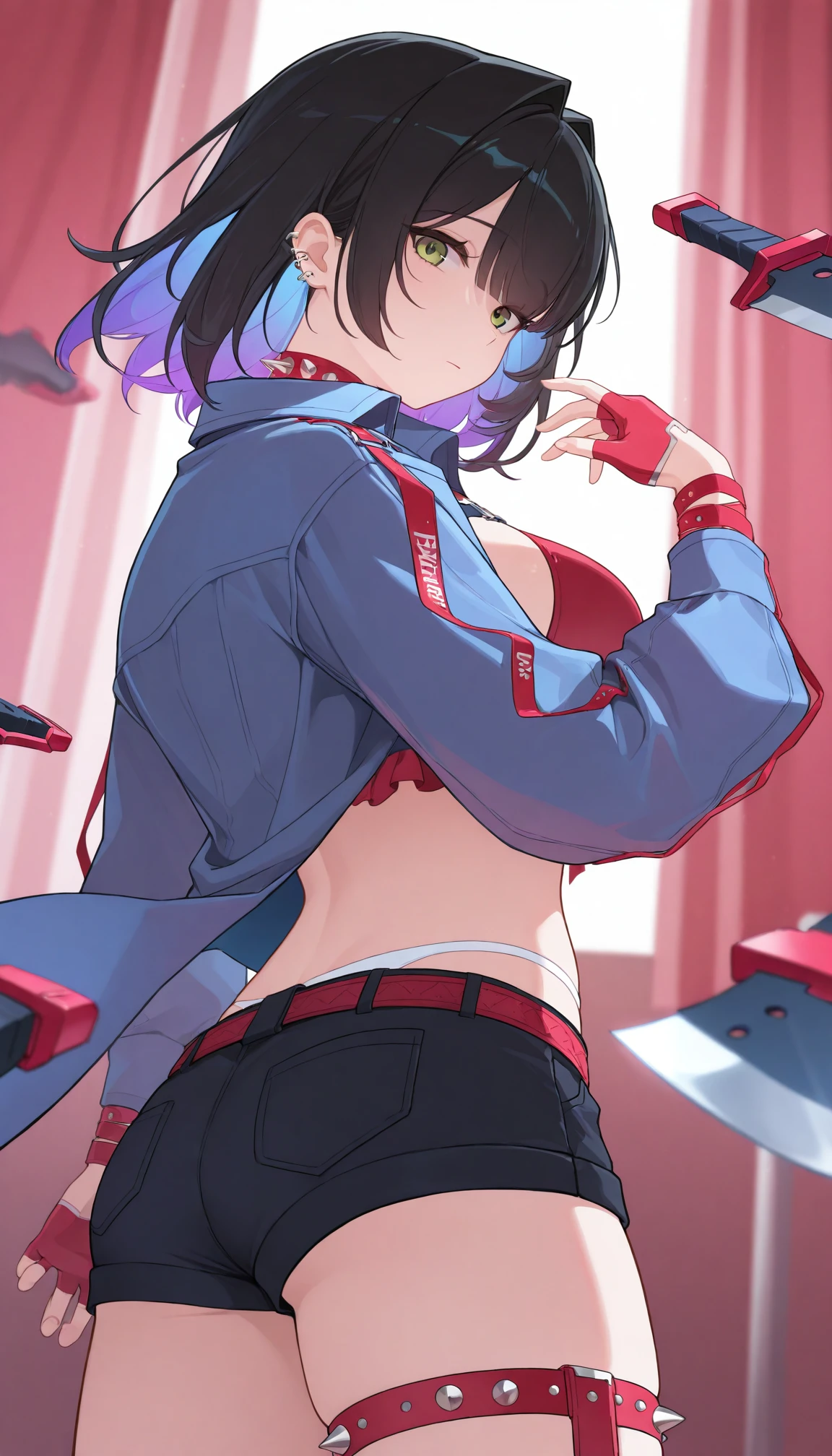 t3re3ss4czn, green eyes, medium hair, black hair, purple hair, two-tone hair, colored inner hair, blunt bangs, hair intakes, red choker, spiked choker, ear piercing, blue jacket, , popped collar, chest harness, bikini top only, red bikini, frilled bikini, spaghetti strap, long sleeves, red gloves, half gloves, fingerless gloves, spiked bracelet, red belt, belt buckle, short shorts, white panties, panty straps, spiked thigh strap, single garter strap, single thighigh, black thighhighs,