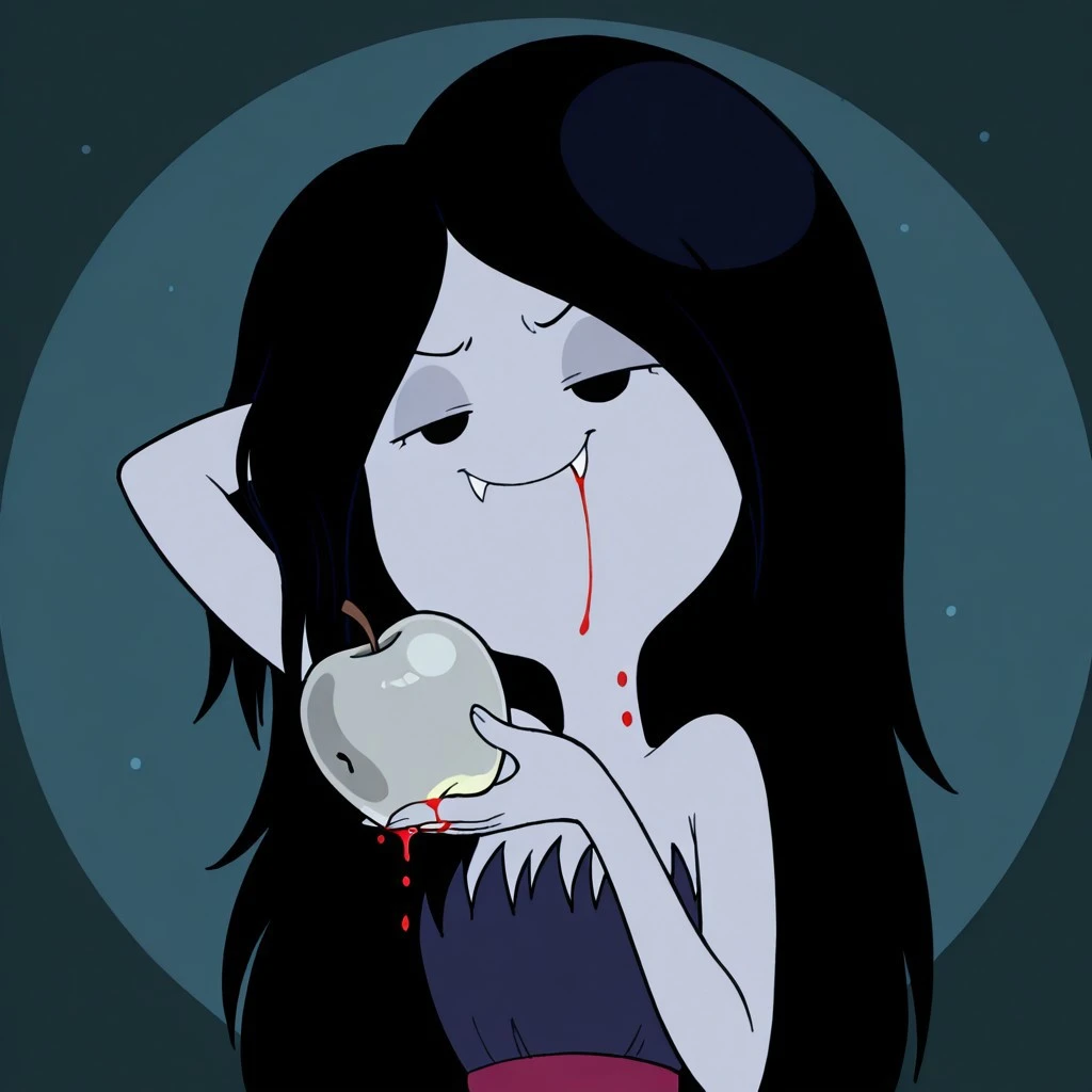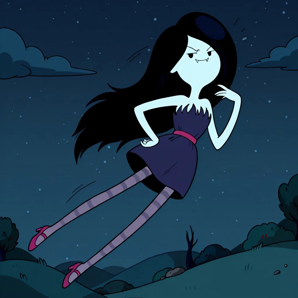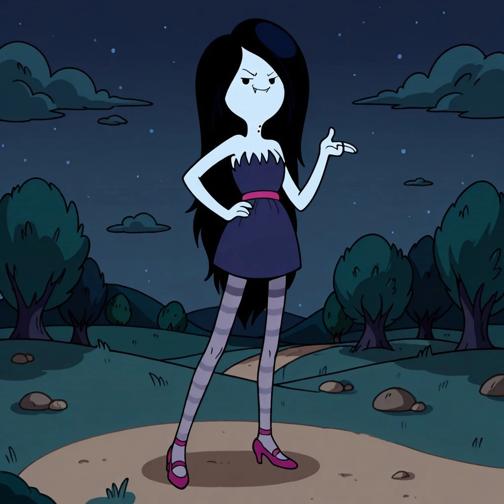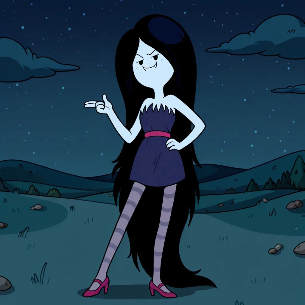 vampire female, solo, gray skin, fangs, black eyes, no sclera, very long black hair, dark blue strapless dress with frayed top, dark pink belt, dark pink heels, gray stockings with dark gray stripes,