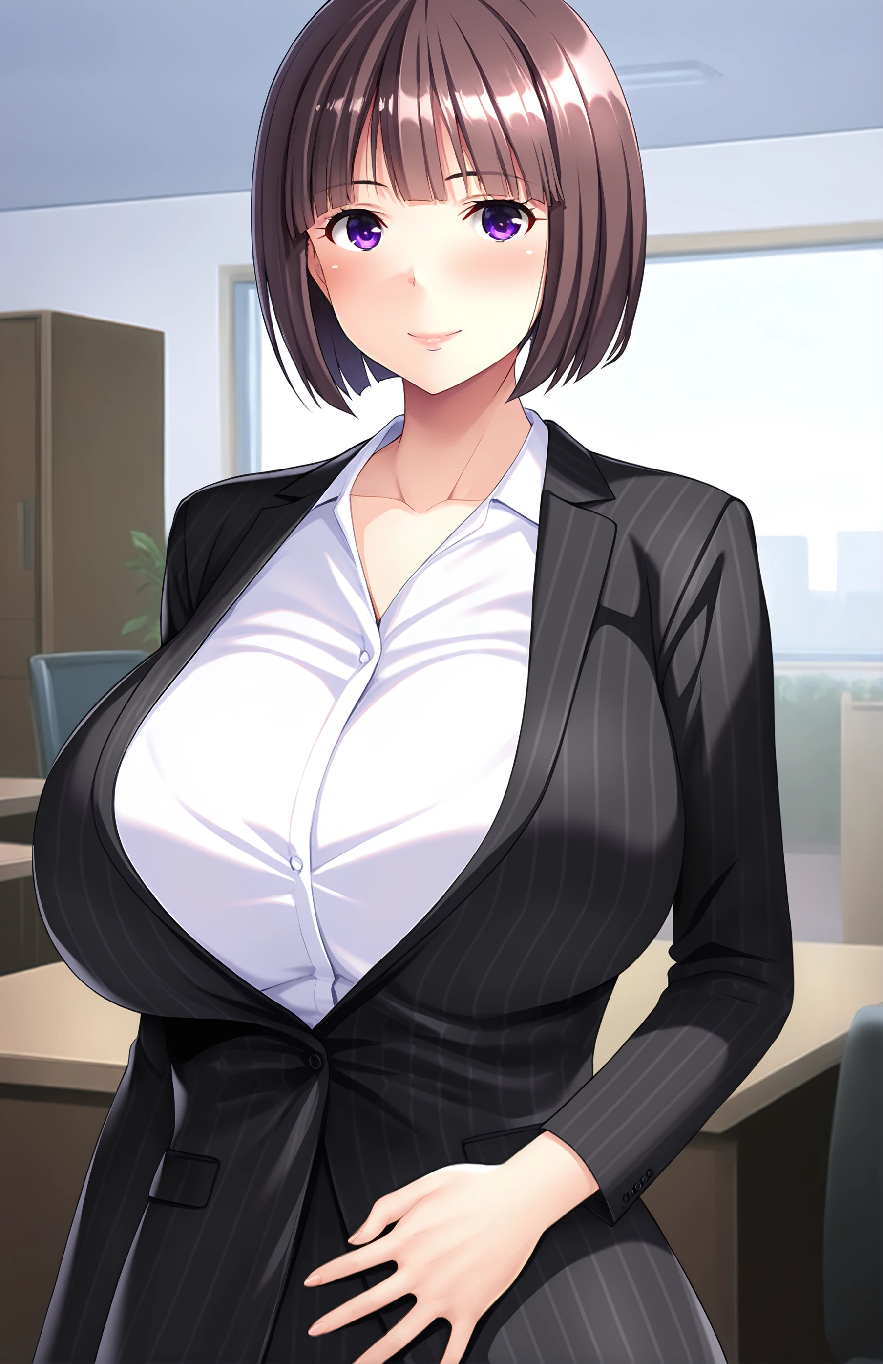 HishiharaRyou, , short hair, bangs, skirt, , brown hair, shirt, long sleeves, purple eyes, collarbone, jacket, white shirt, striped, collared shirt, , black jacket, dress shirt, formal, bob cut, suit, office lady, pinstripe pattern, business suit, pinstripe suit