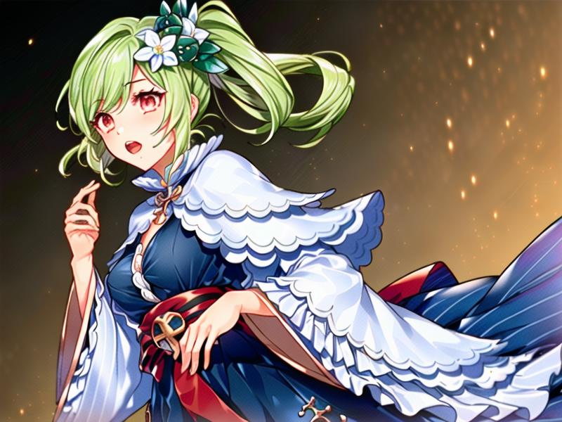 ujou,green hair, one side up, hair ornament, blue dress, long skirt, wide sleeves, long sleeves,white capelet,