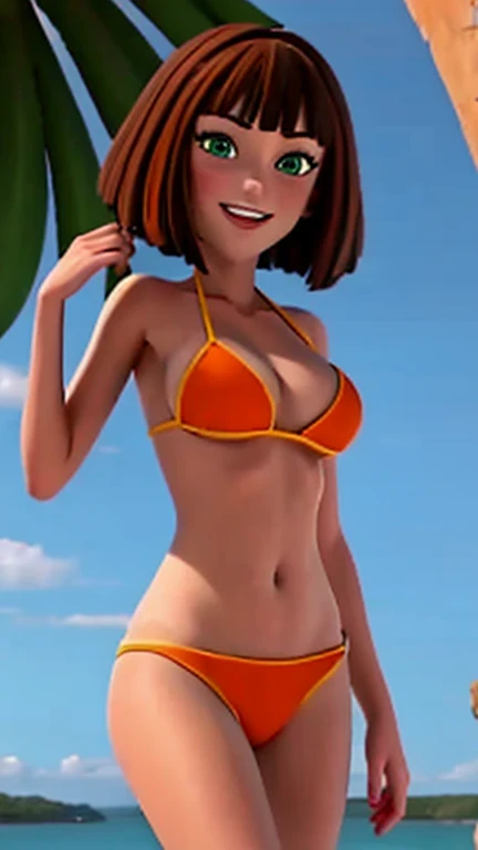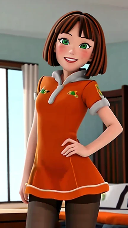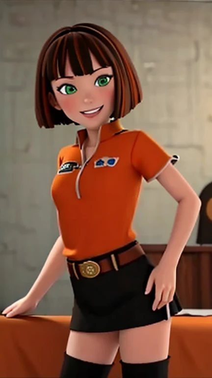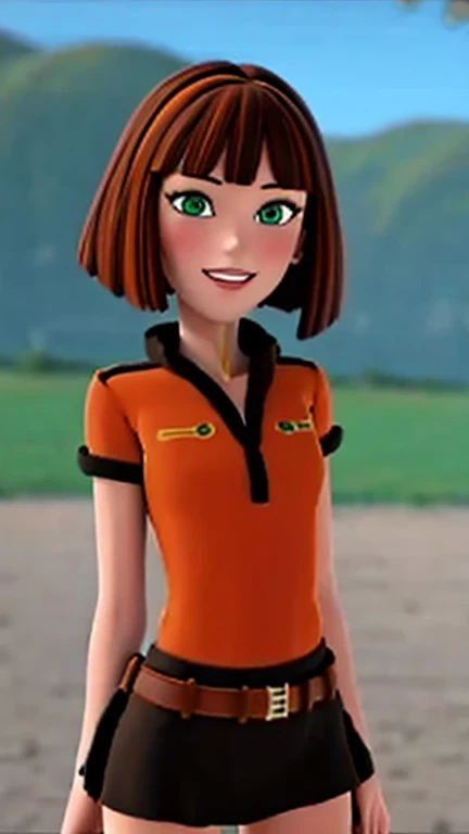 1girl, solo, russian girl, brown hair, bang, short hair, smile, green eyes, mole, shirt, short sleeves, skirt,