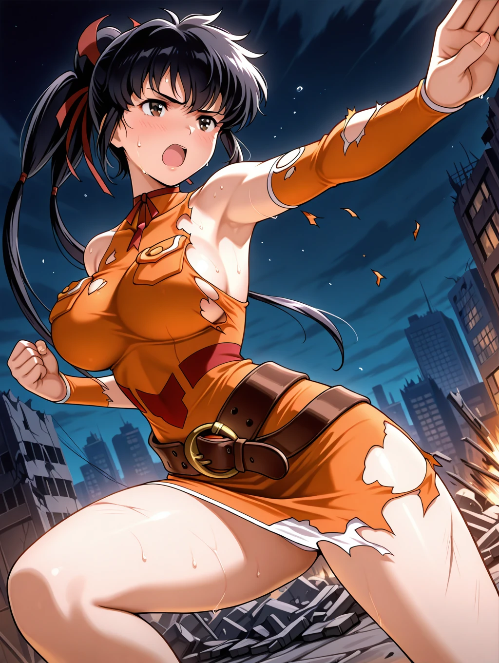 1girl, lisapacifist, black hair, brown eyes, hair up, high ponytail with low tied twintails, orange tube-dress with detached sleeves, red ribbon-choker, pockets on chest, red stripes on waist, brown belt with gold buckleWorks well with LoRA weight 1 - 0.8