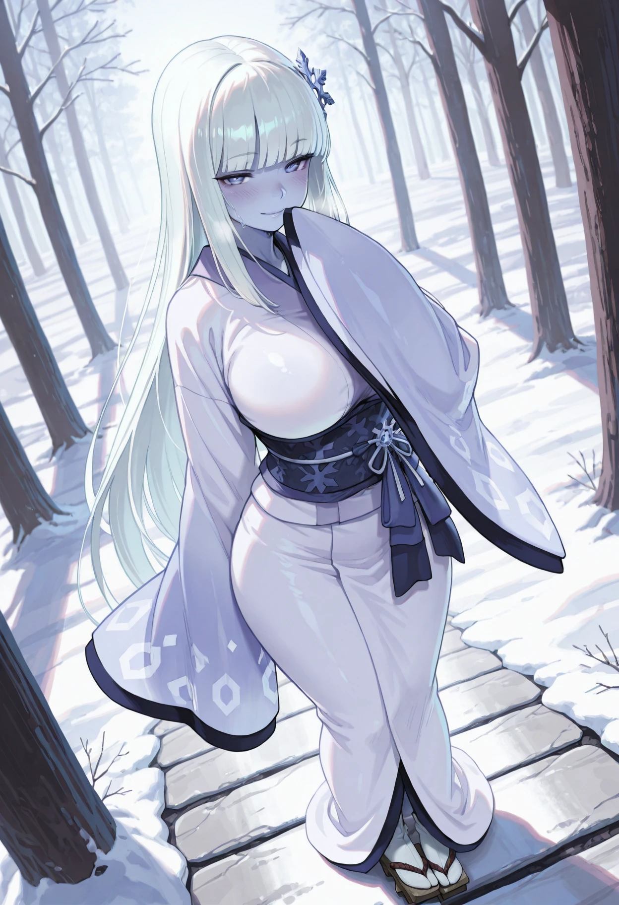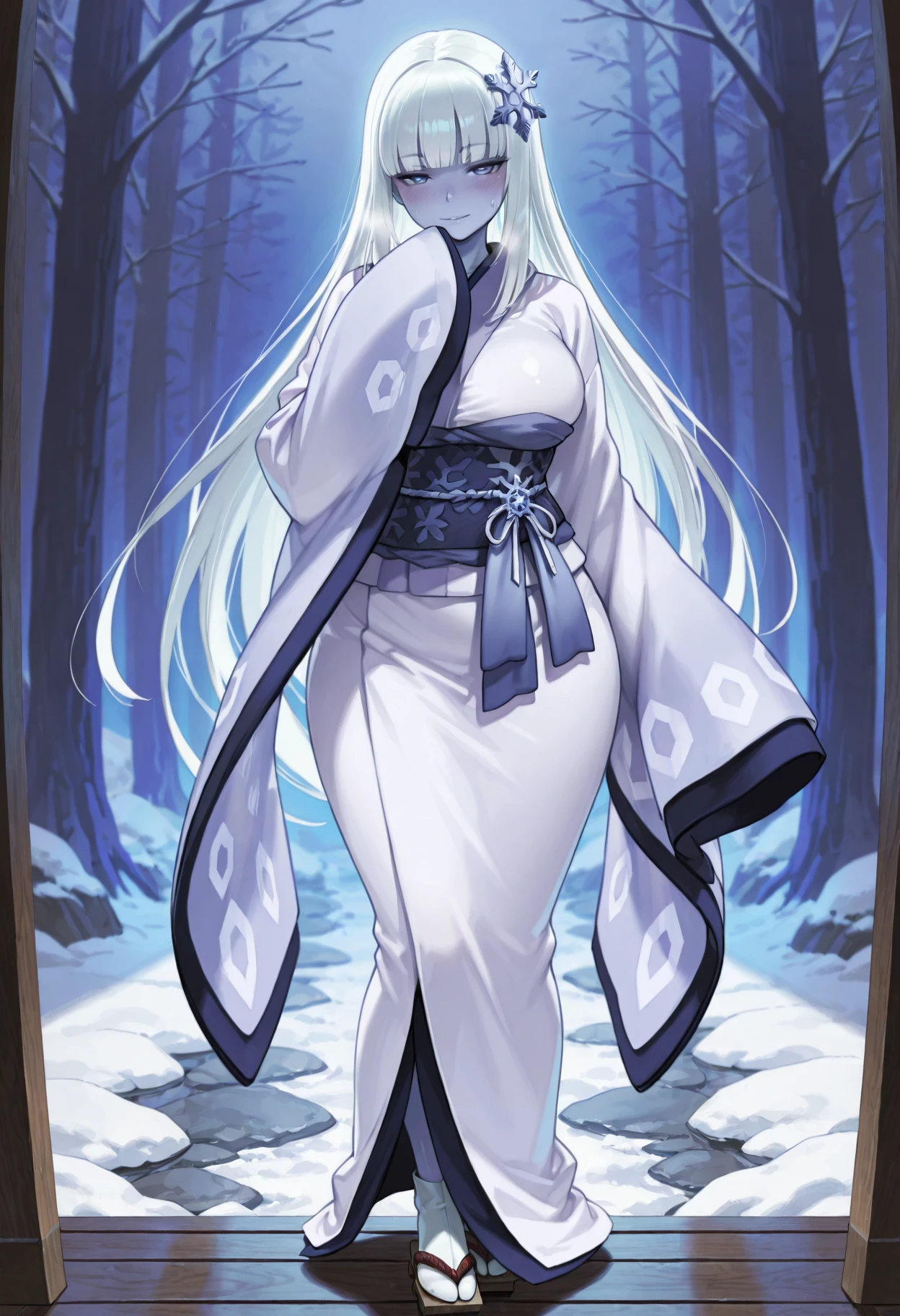 japanese clothes, layered kimono, wide sleeves, sleeves past wrists, sleeves past fingers, sash, obi, geta, tabi, snowflake hair ornament