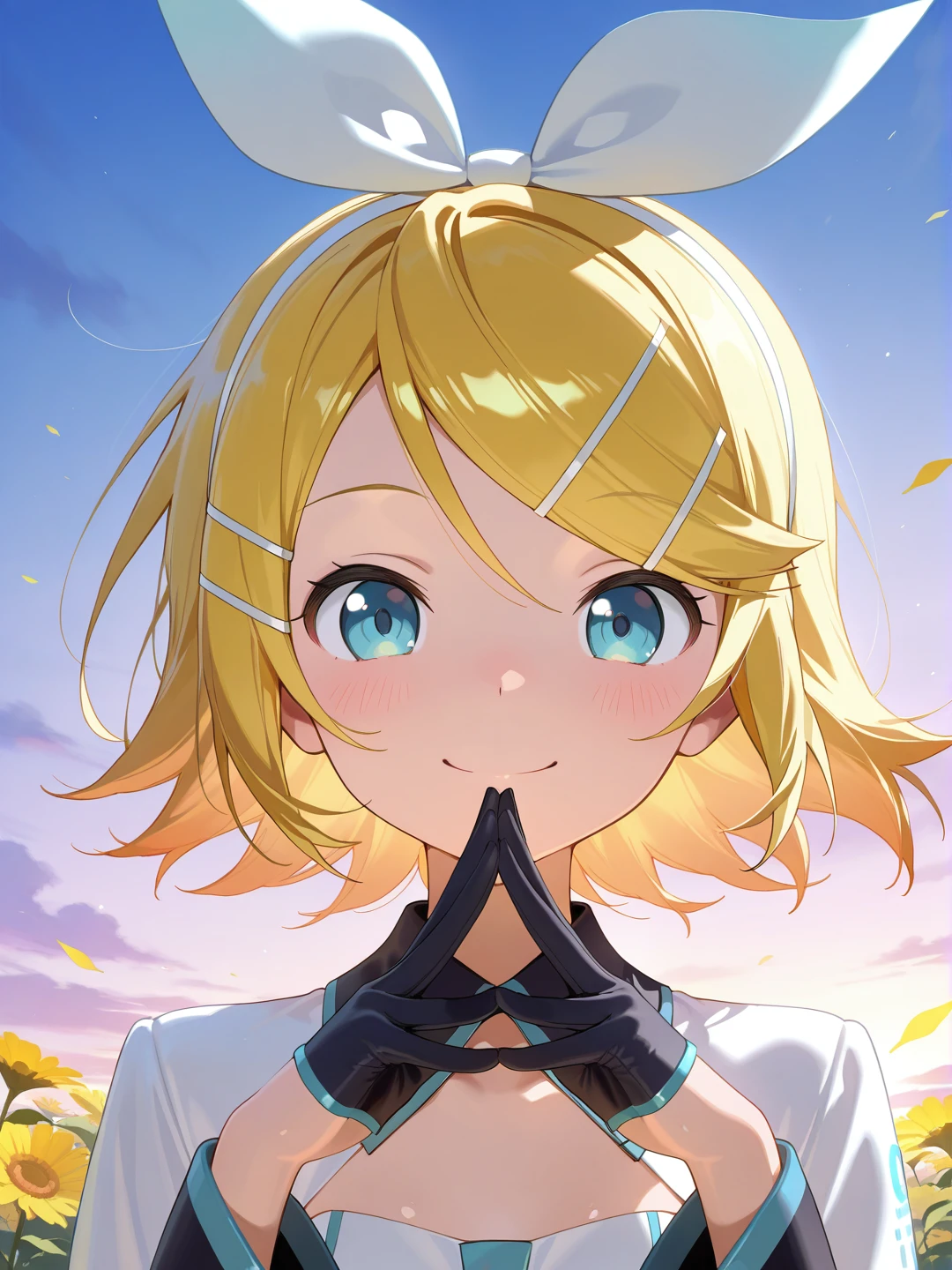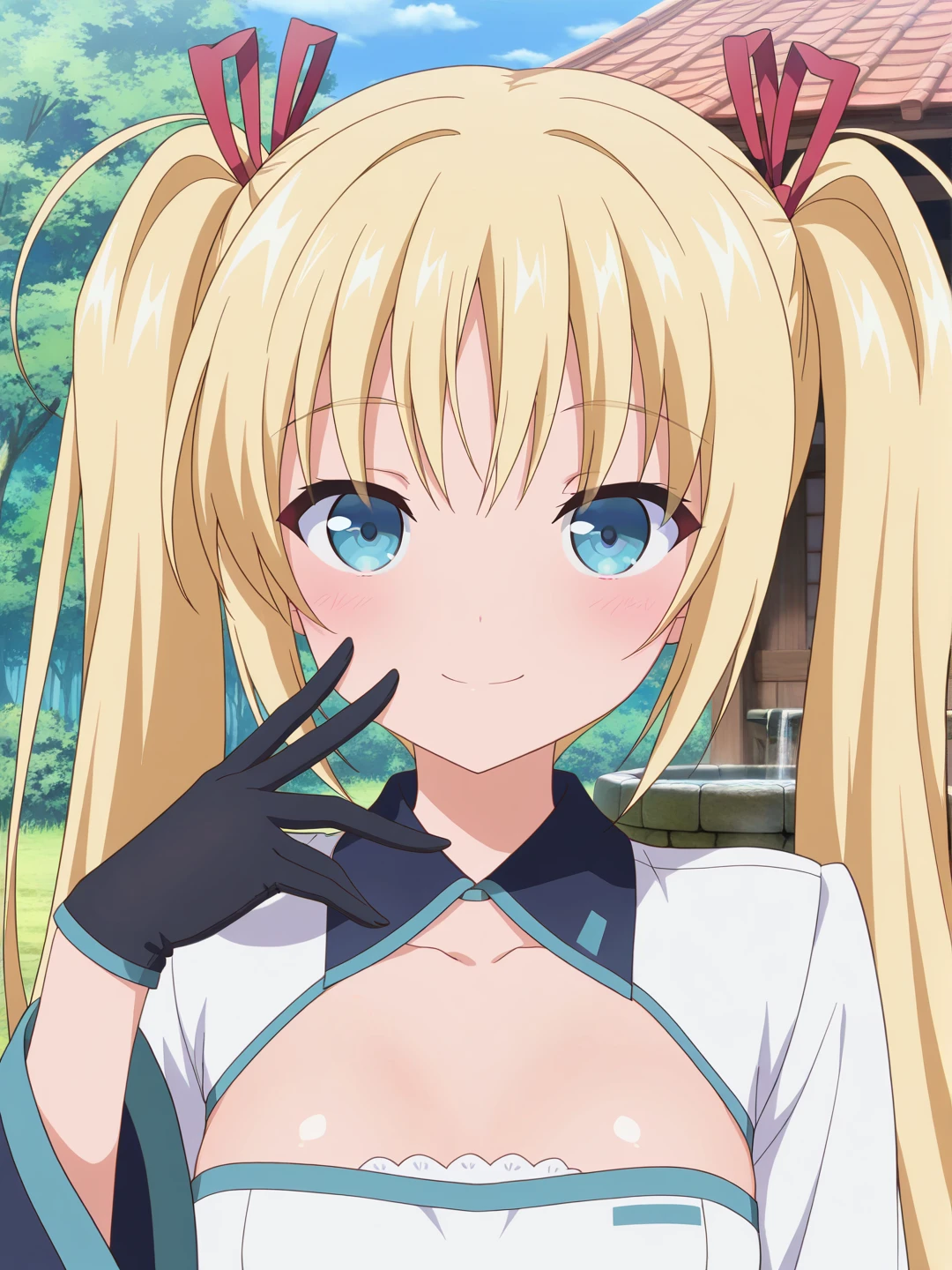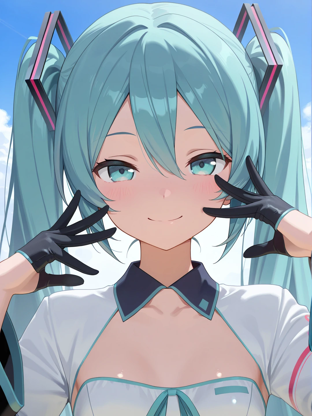 detached collar,shrug \(clothing\),short dress,white dress,dress ribbon,aqua ribbon,white sleeves,long sleeves,wide sleeves,black gloves,thigh strap,bare legs,white footwear