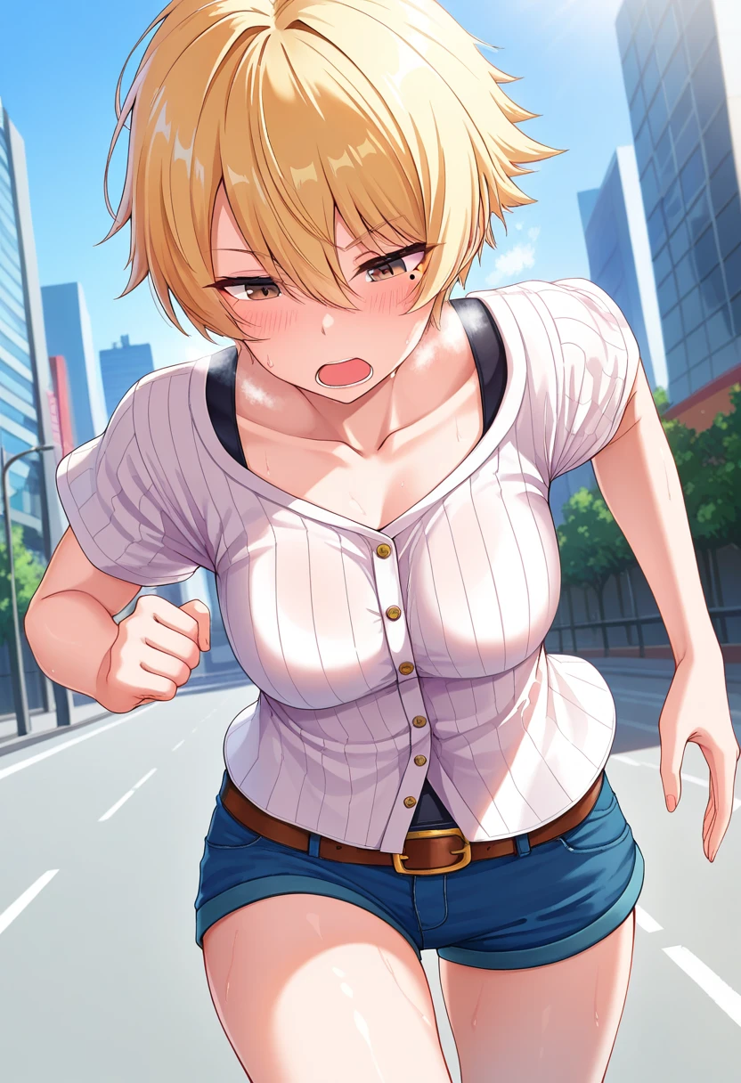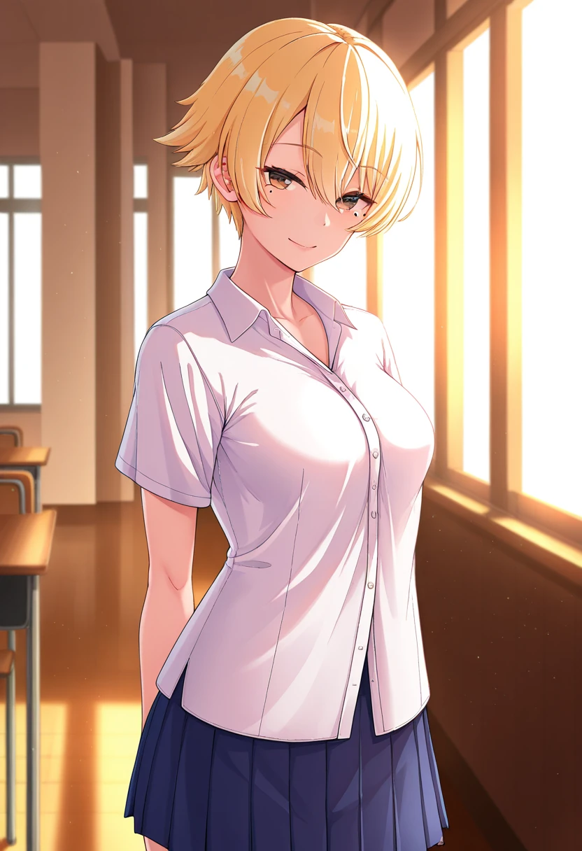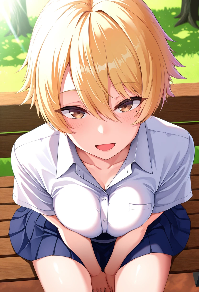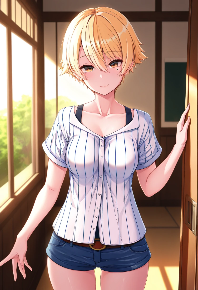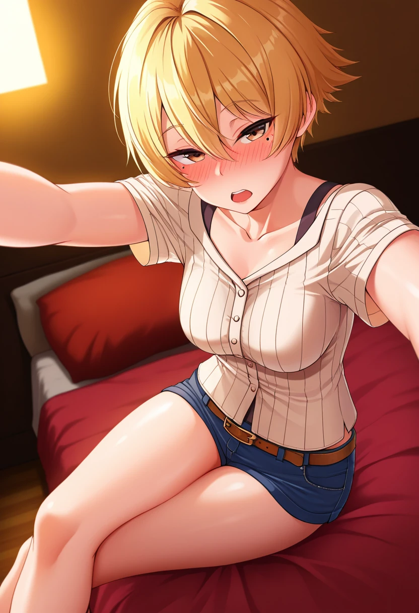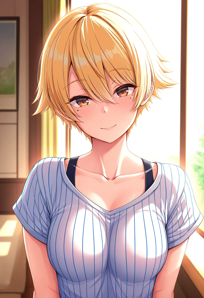 nanamiww, brown eyes, blonde hair, short hair, hair between eyes, medium breasts, mole under eye,