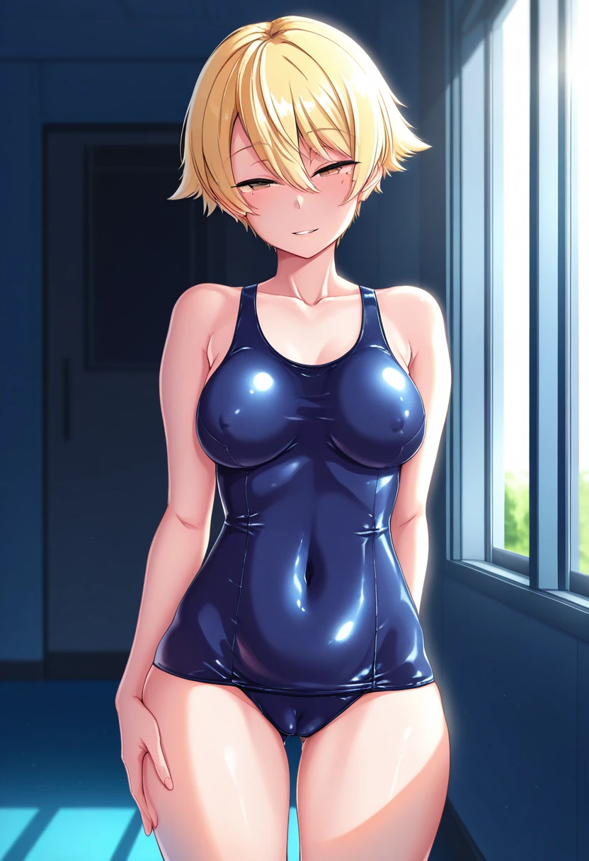 • skin tight, school swimsuit, one-piece swimsuit, breasts, cleavage, covered ???????, covered navel, cameltoe, collarbone,