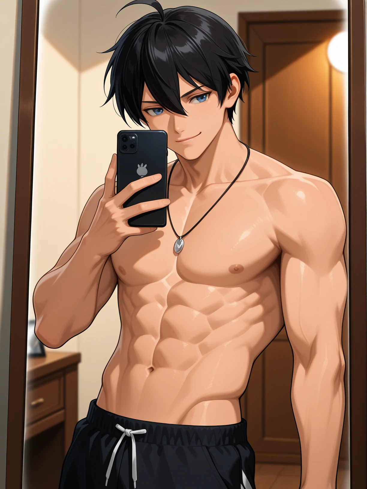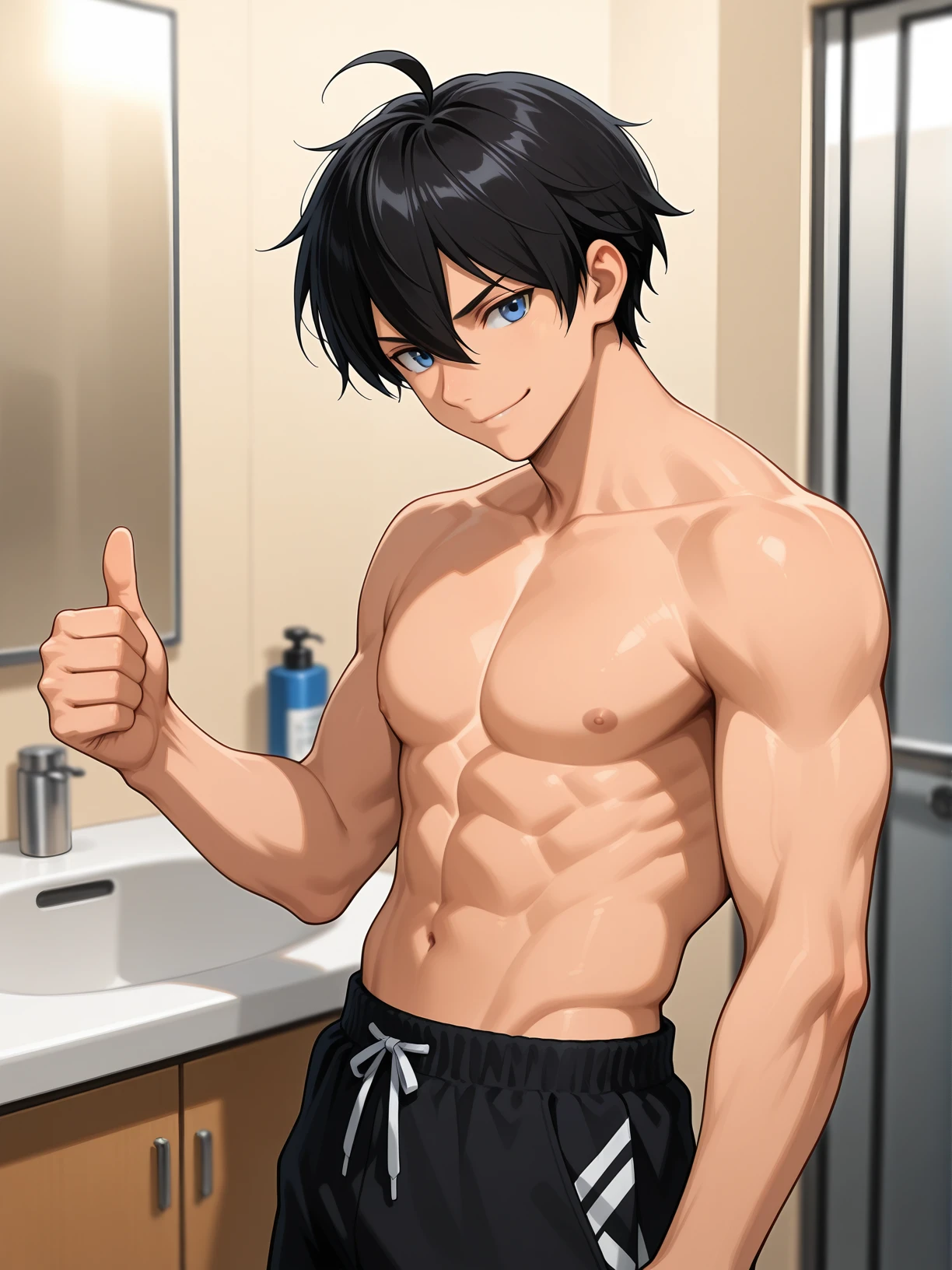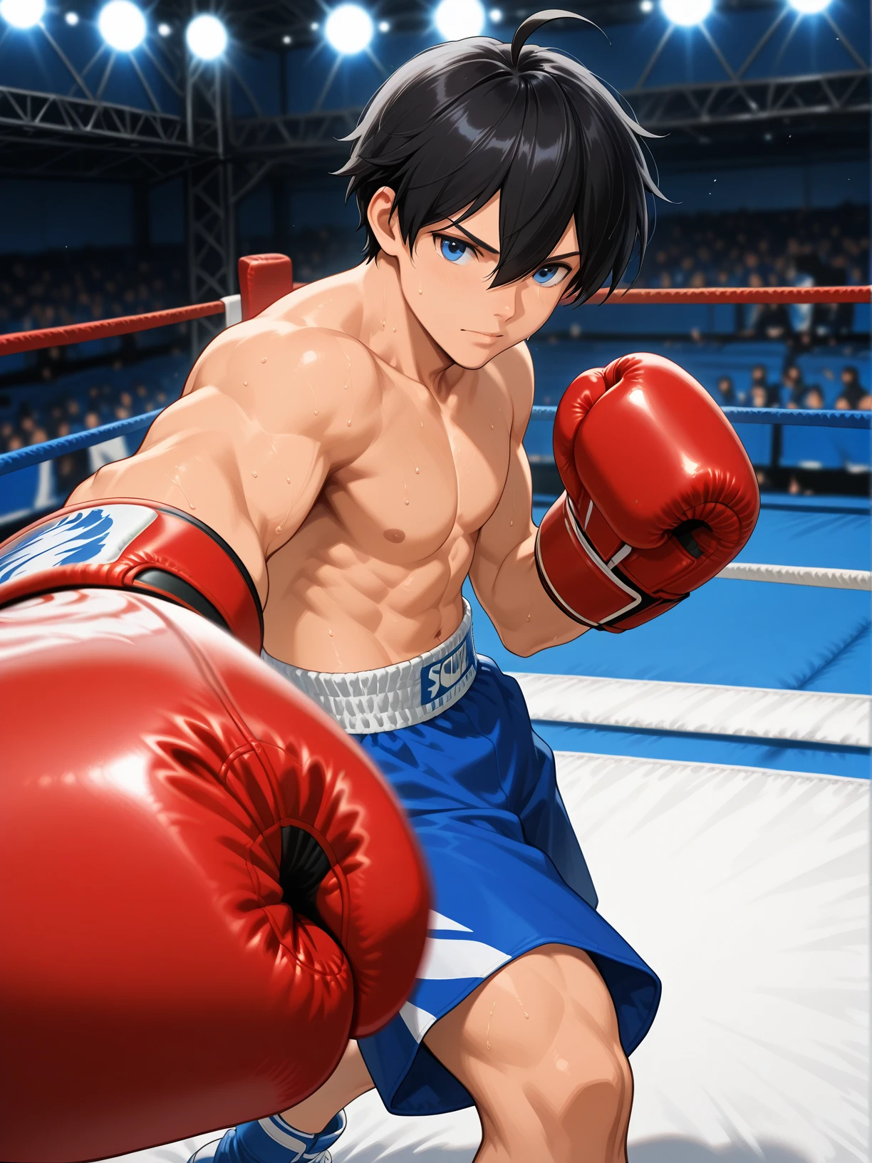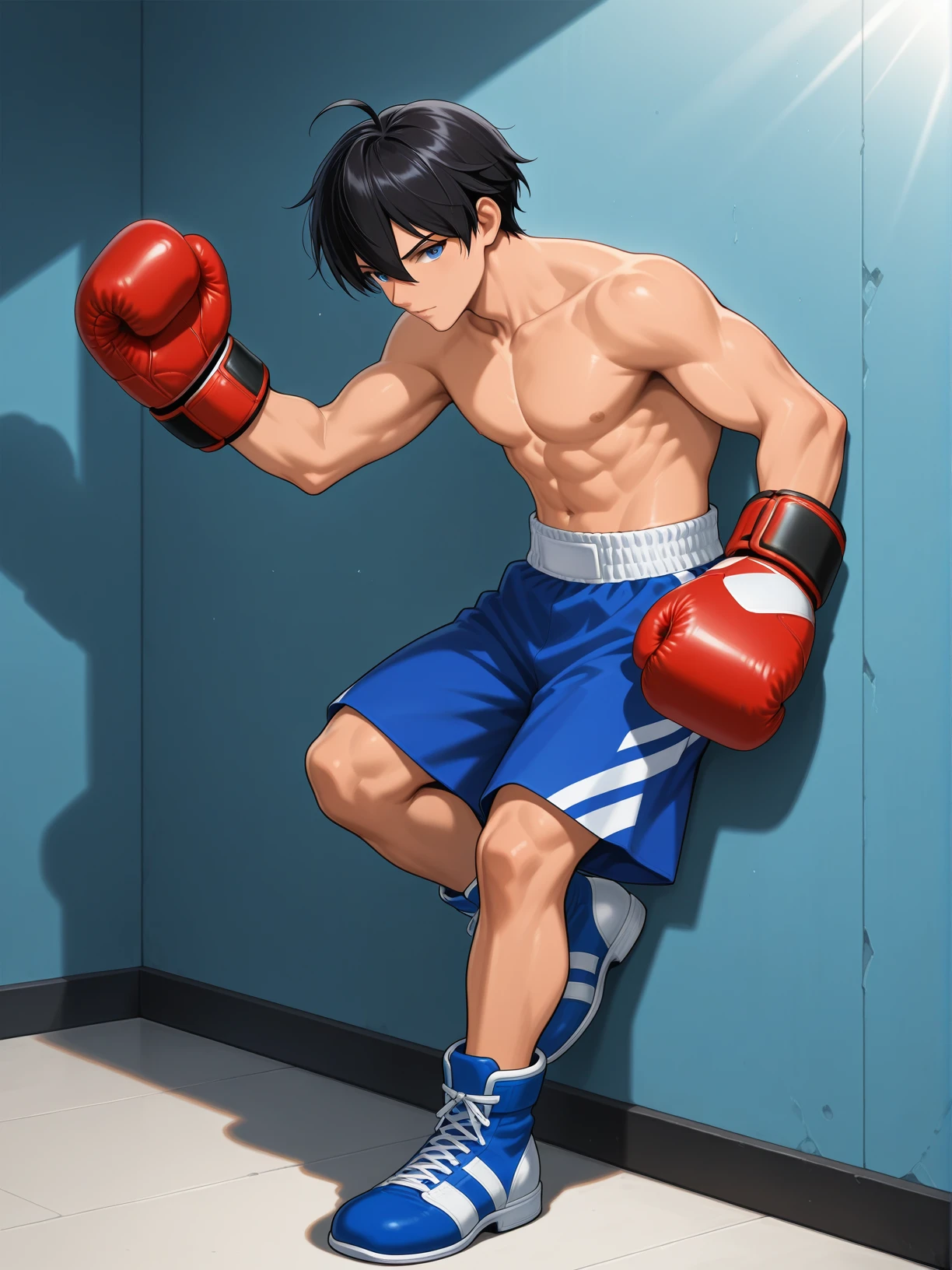 sota, 1boy, black hair, messy short hair, blue eyes, shirtless male, boxing gloves, red gloves, blue boxing shorts, boxing shoes