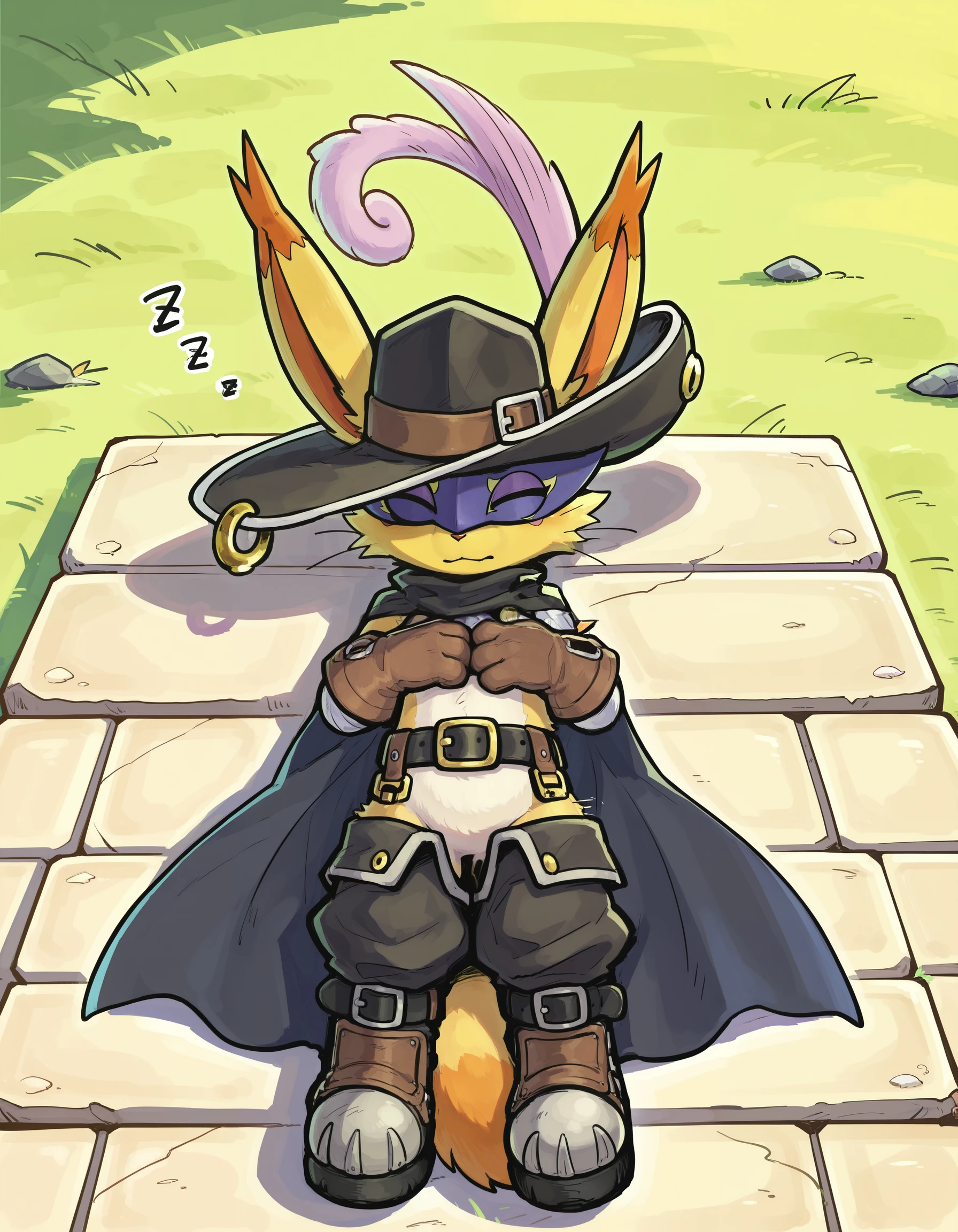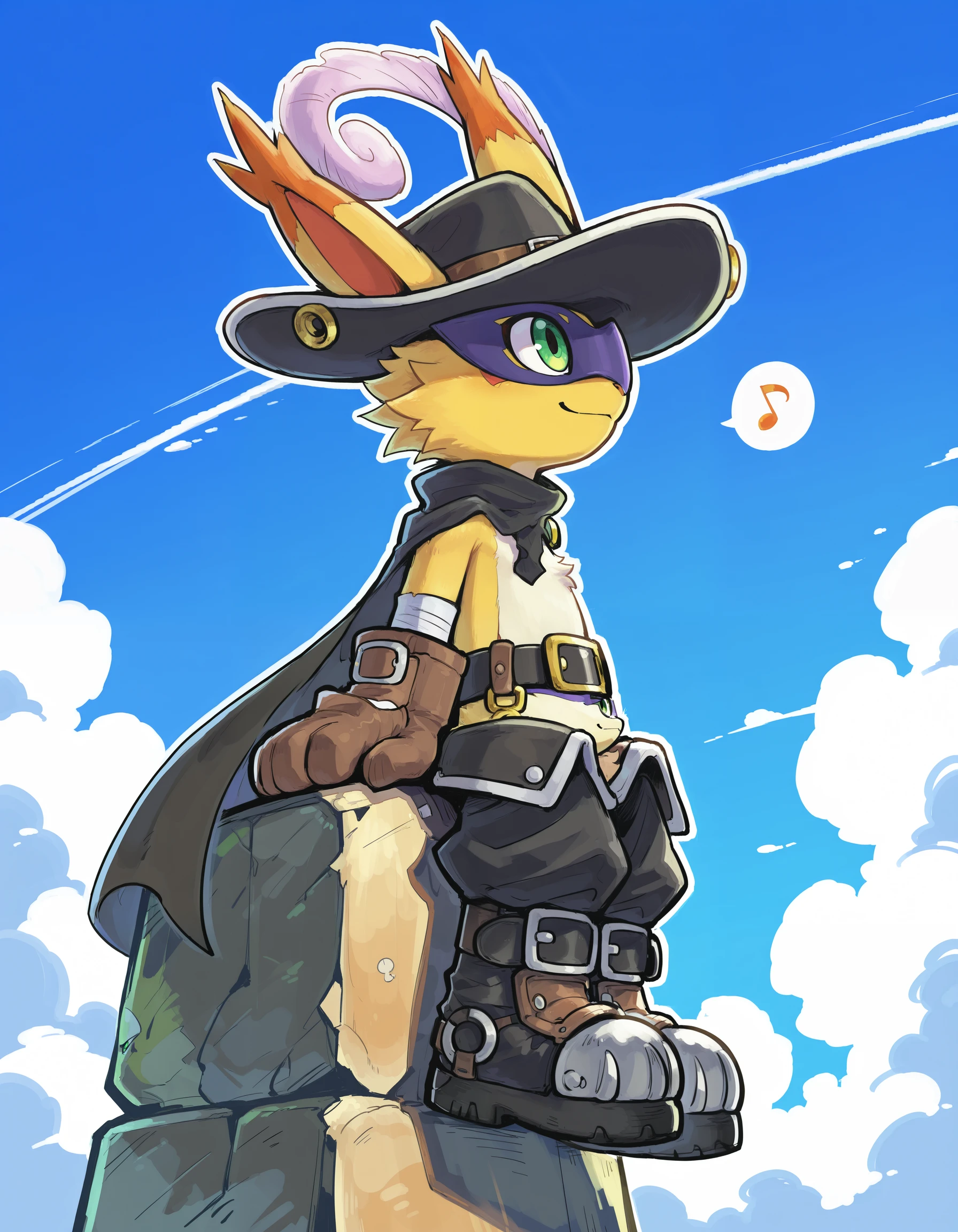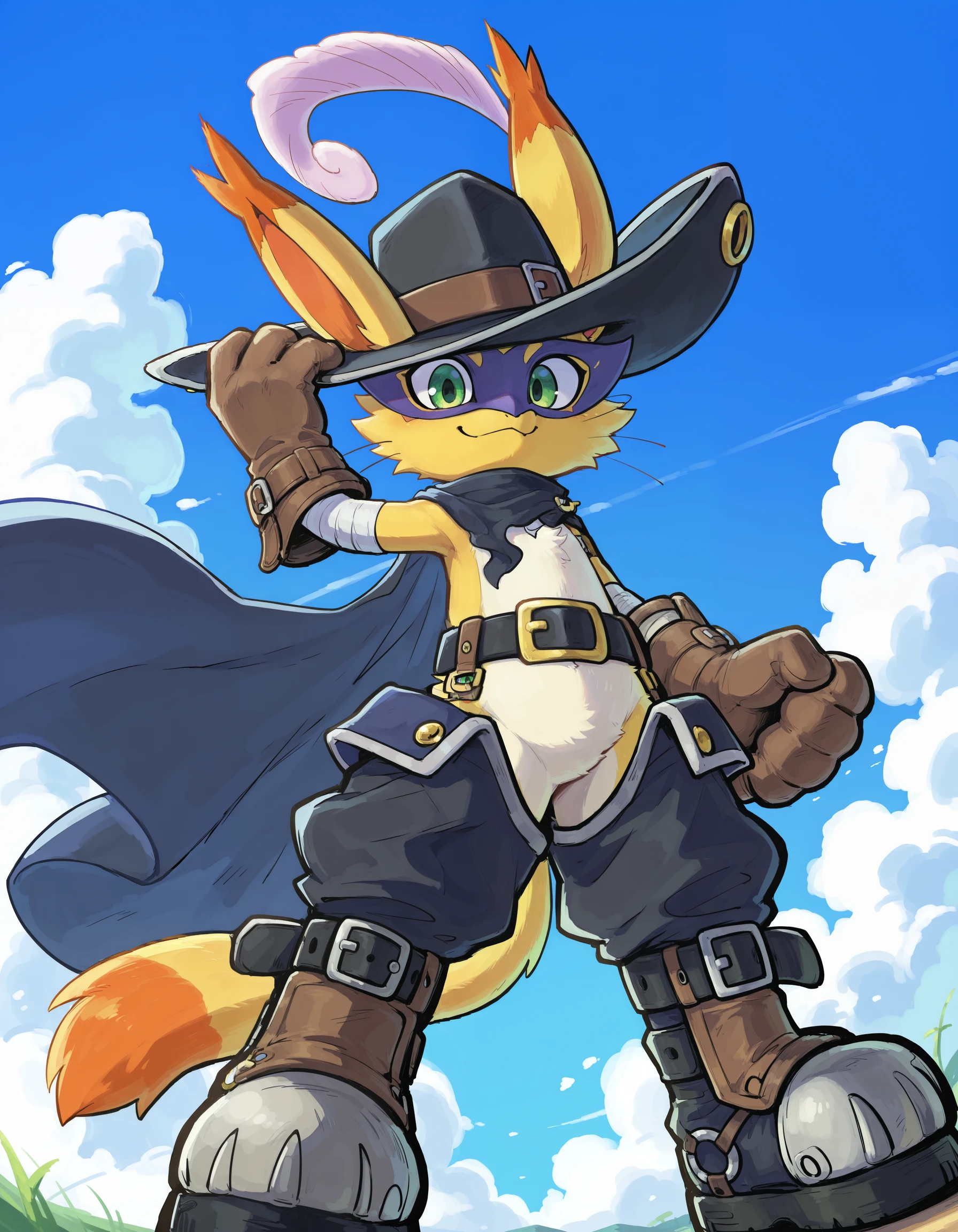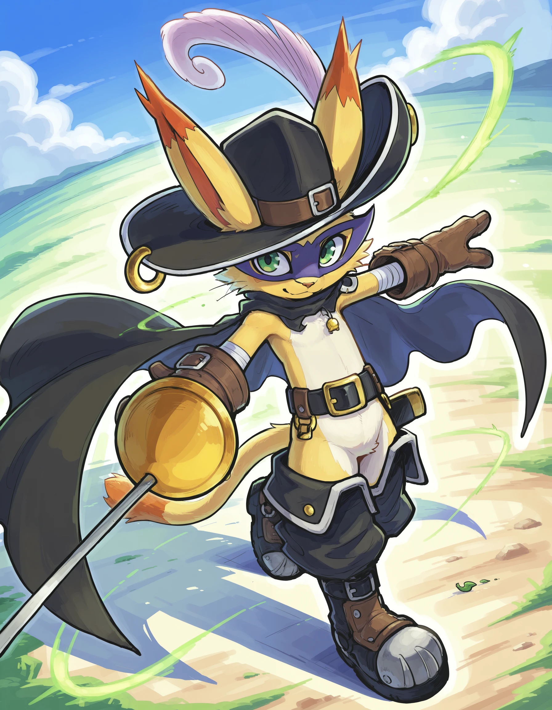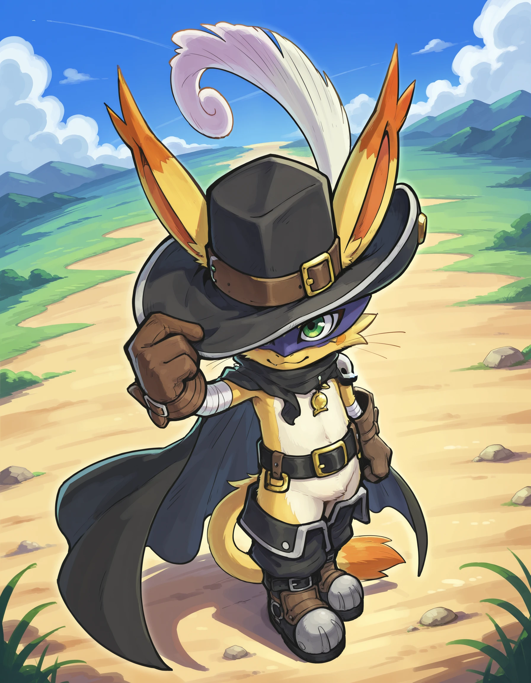 Nyabootmon is a heroic, puppet-type Digimon that looks like a bipedal cat dressed as a dandy knight. It wears a wide-brimmed hat with a feather, a long flowing cape and leather boots that let it glide through the Digital World. Despite its flashy, theatrical manners, it has a strong sense of justice and fights evil with its beloved Nekojara Sword and agile, acrobatic moves.