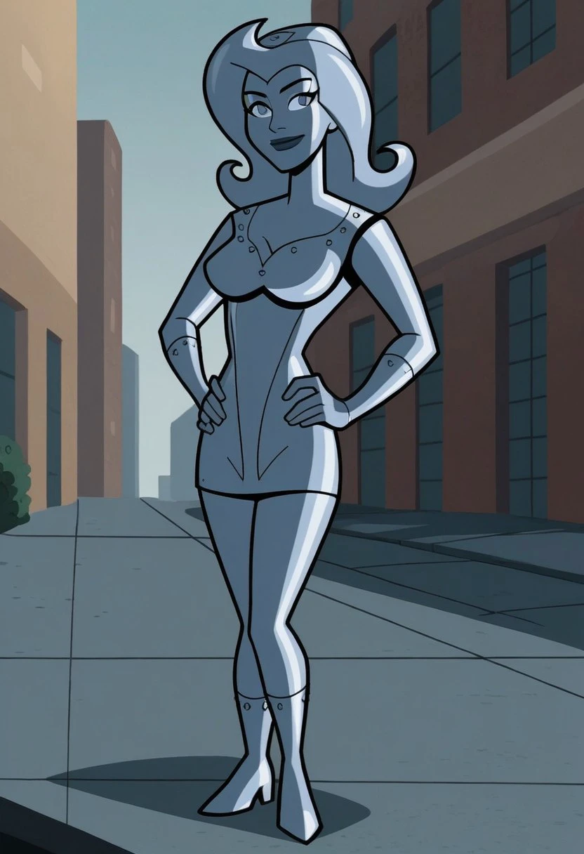 metallic body, silver body, colored skin, breasts silver eyes, silver hair, long hair, metal cap, lipstick, metal cap, short dress, silver dress, gloves, silver gloves, boots, silver boots,