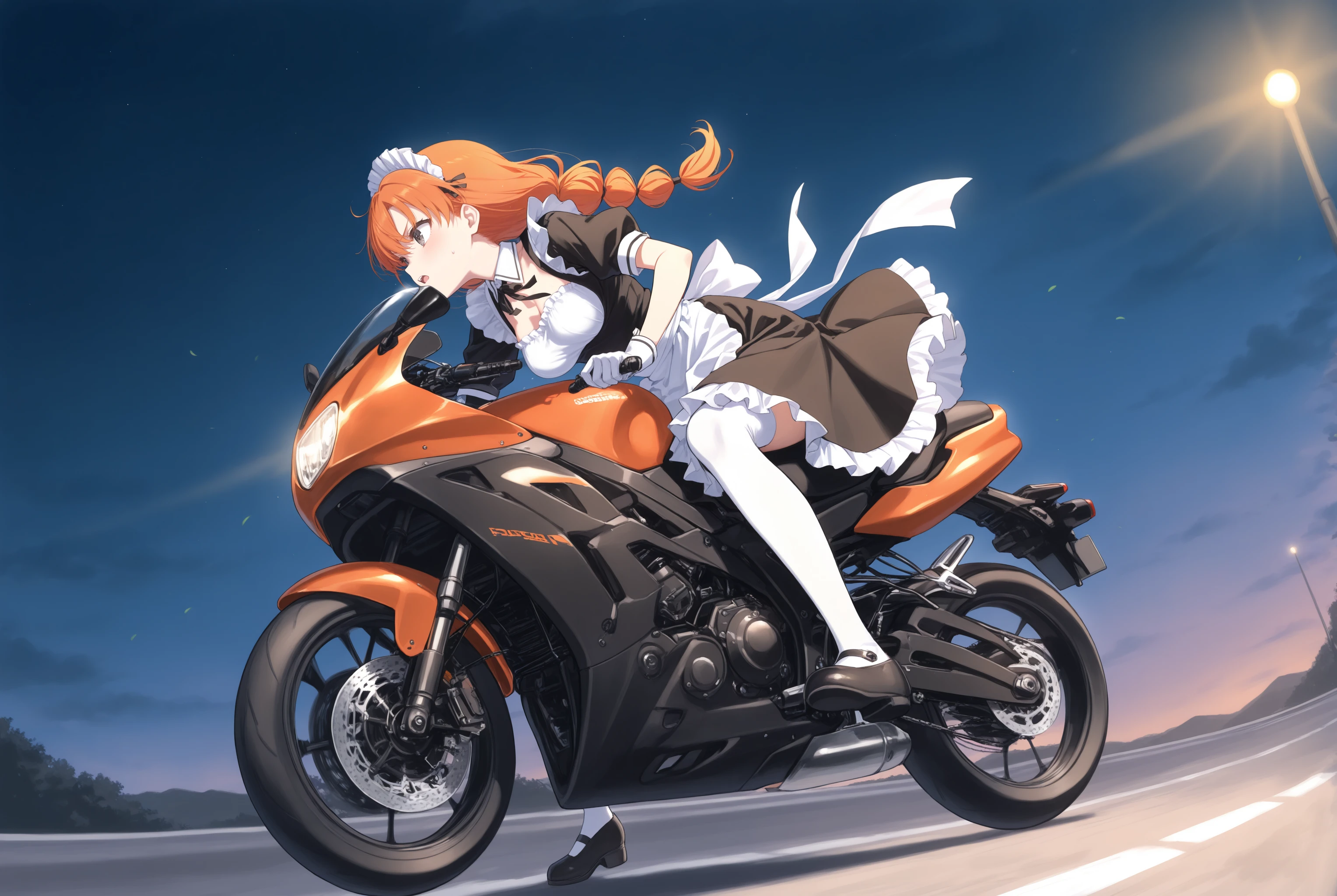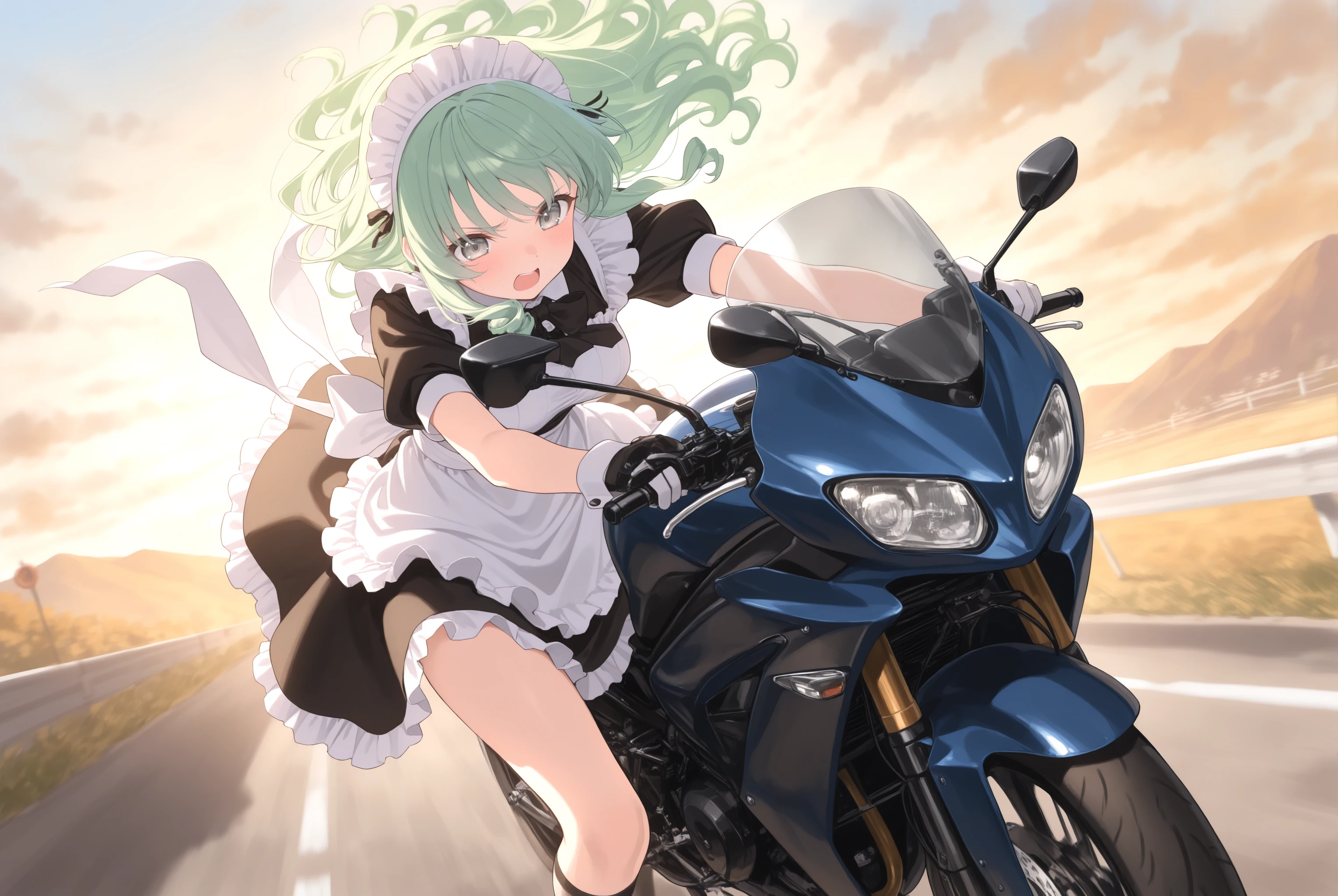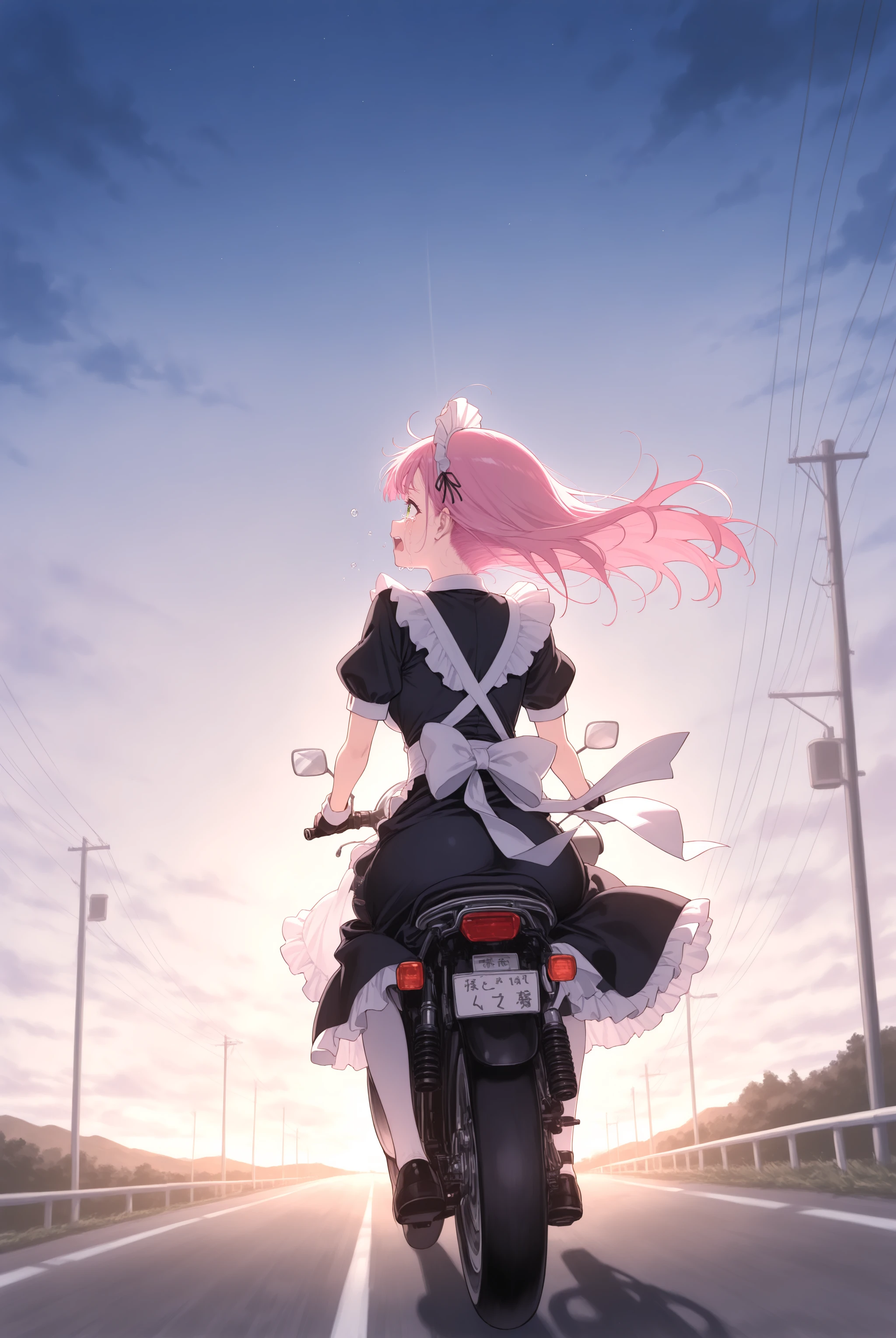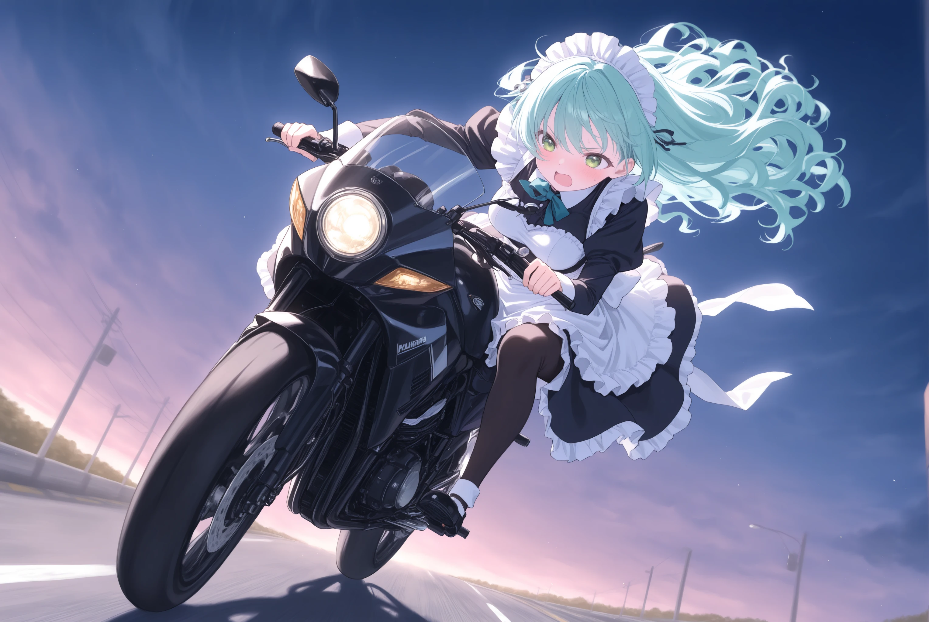 元から学習はされていますがバイクの造形や姿勢を改善させます。トリガー以外で motor vehicle, motorcycle, outdoors, riding, road, driving, floating hair, wind, headlight 辺りはお好みで。
