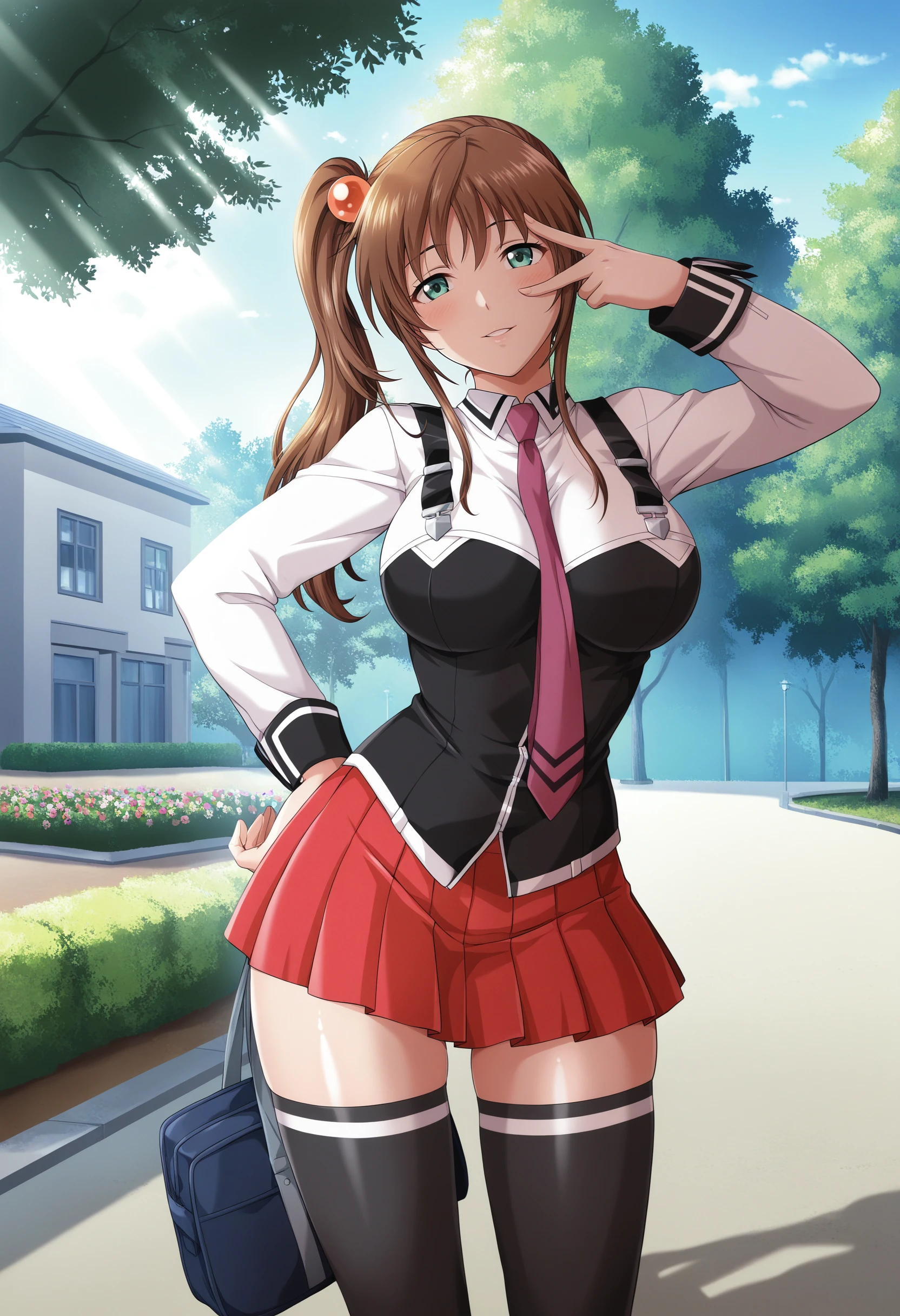 brown hair, long hair, green eyes, hair bobbles, high side ponytail,
