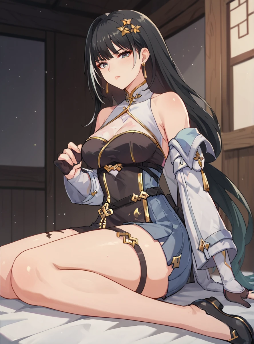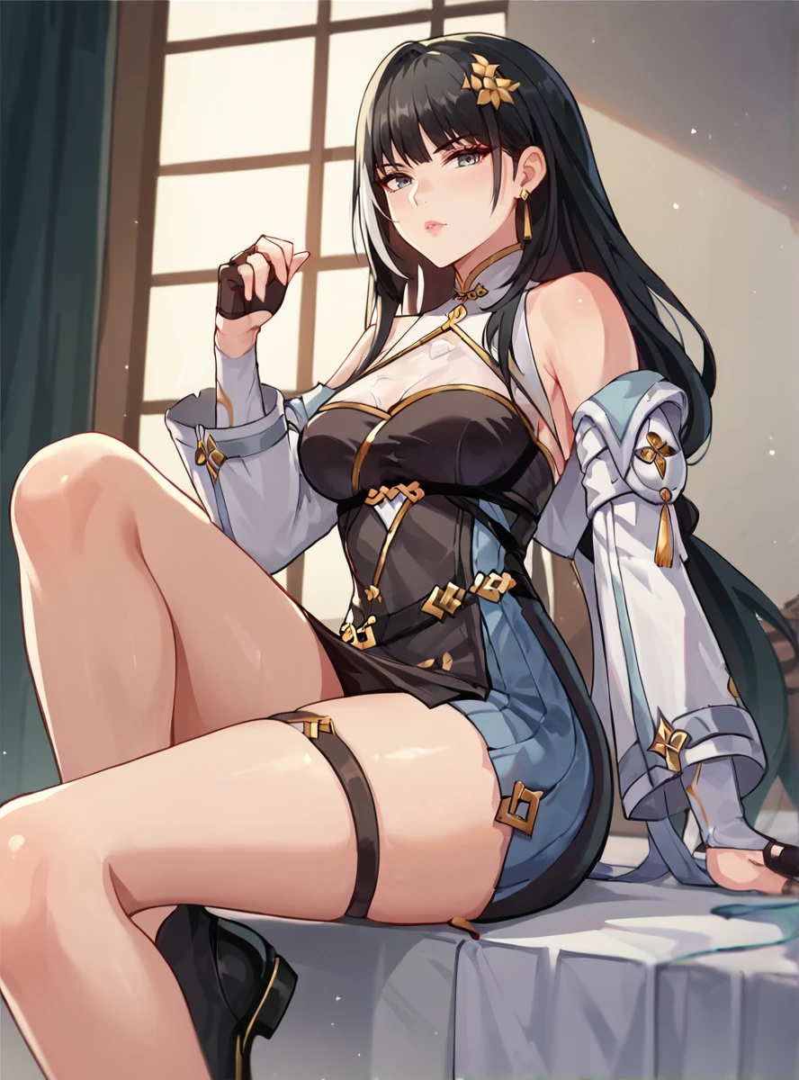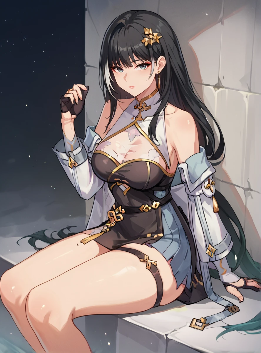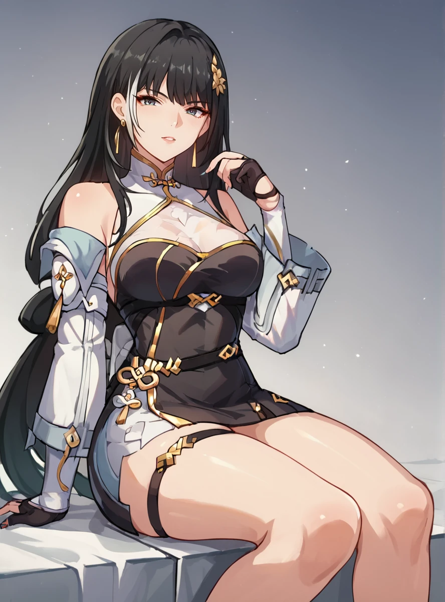 Prompts:long hair, black hair, breasts, gloves, hair ornament, dress, black gloves, black footwear, fingerless gloves, thigh strap, earrings, streaked hair thick thighs,