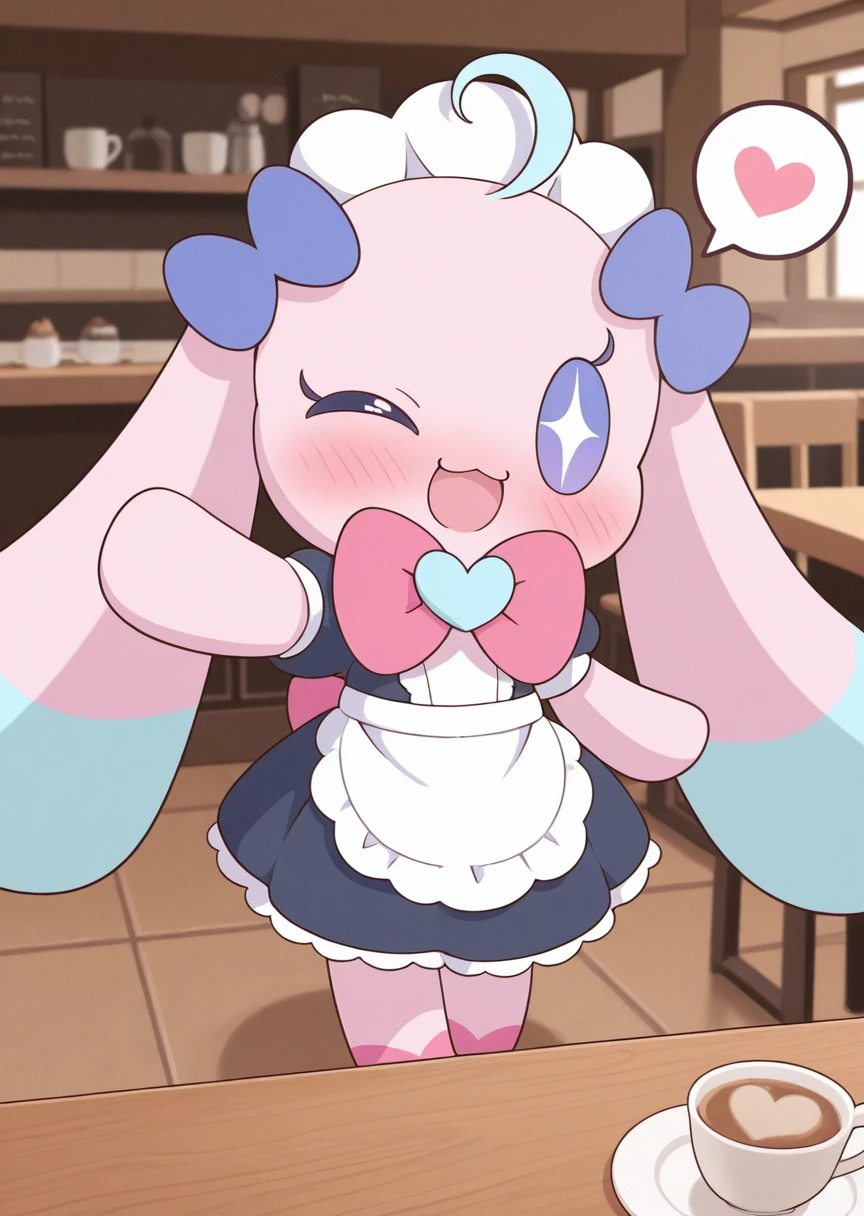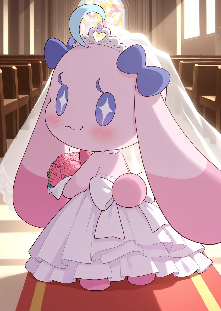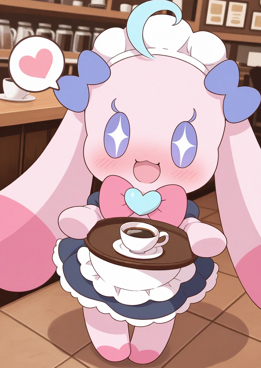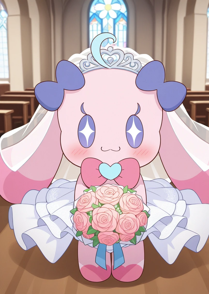 Prompts: mugiaipri, furry, stuffed animal, animal ears, purple eyes, + +, no sclera, dot eyes, neck accessory, ear accessory, pink fur, chibi, no nose,