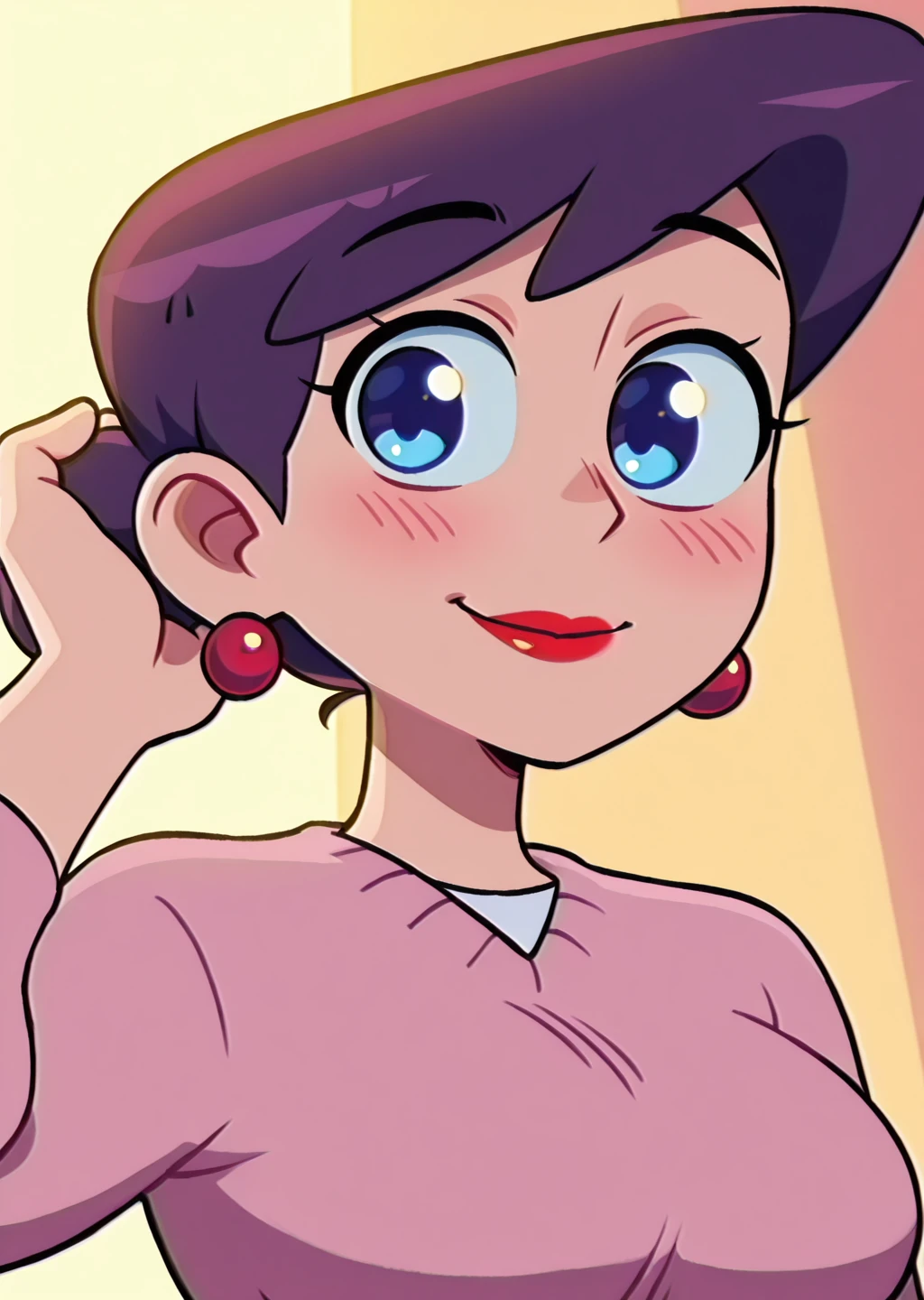 apron, white apron, waist apron, earrings, slippers, pantyhose, black pantyhose, makeup, lipstick, red lips, skirt, brown skirt, pink sweater, sweater, glasses