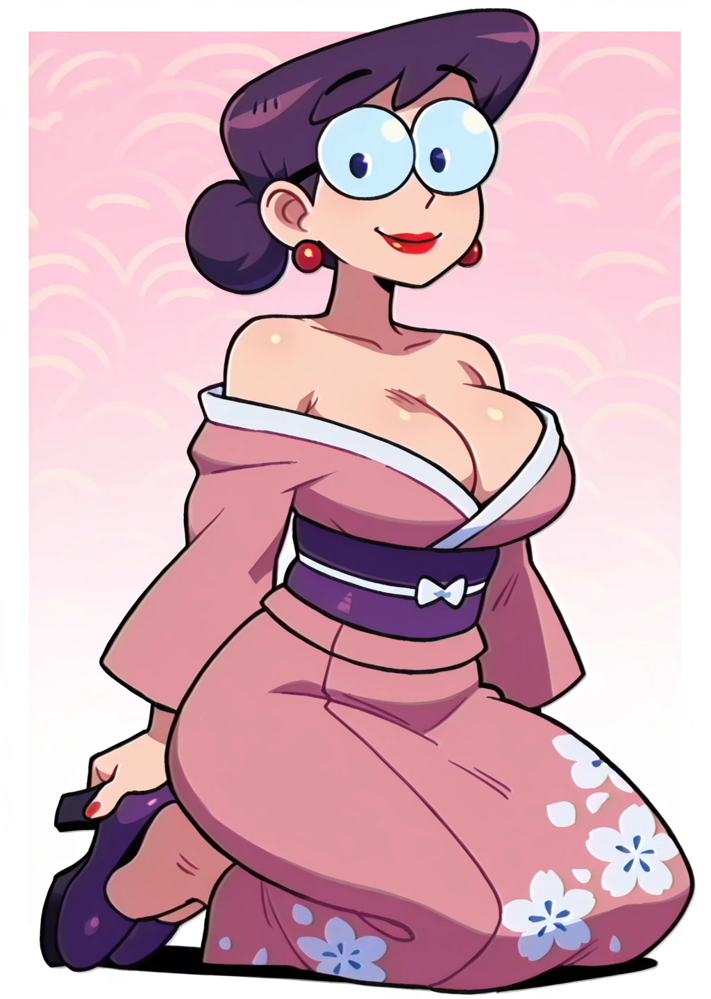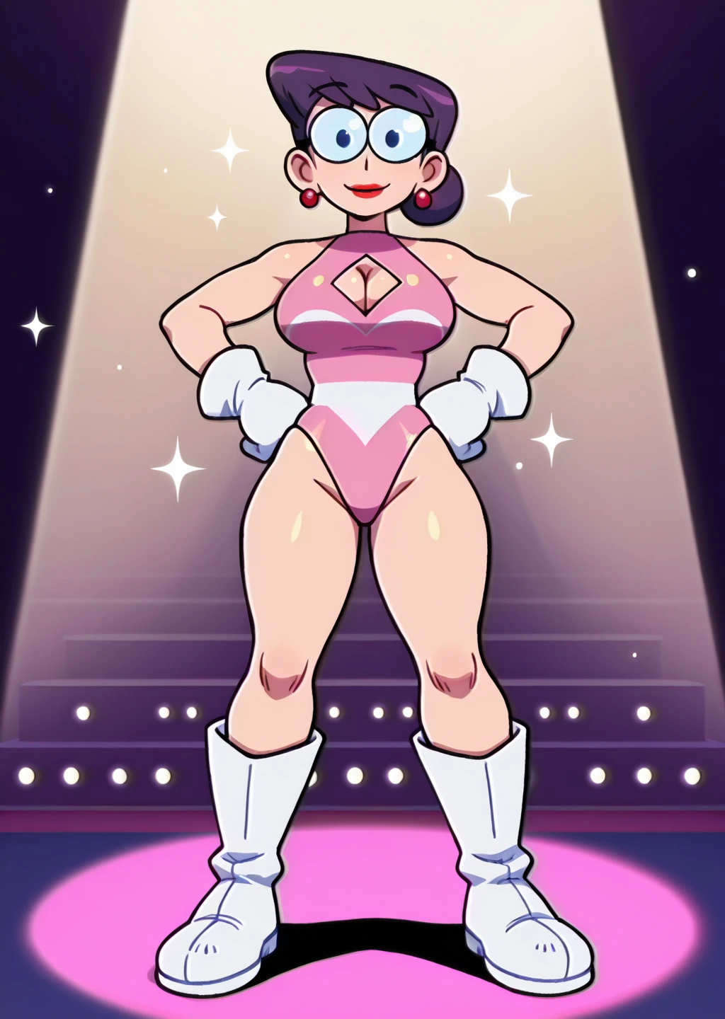 pink leotard, leotard, cleavage cutout, clothing cutout, white gloves, gloves, makeup, lipstick, red lips, earrings, jewelry, glasses