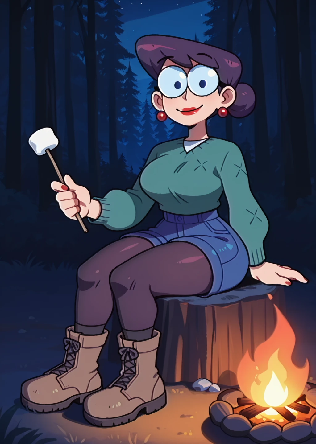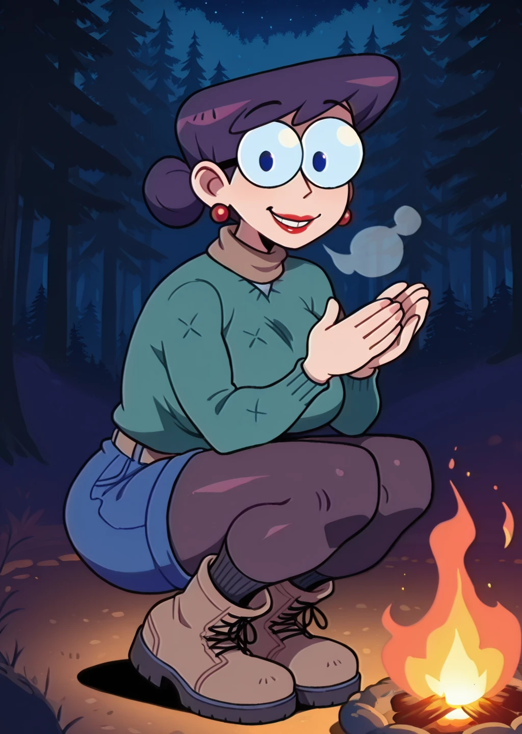 sweater, green sweater, blue shorts, shorts, legwear under shorts, black pantyhose, pantyhose, socks, boots, brown footwear, earrings, glasses