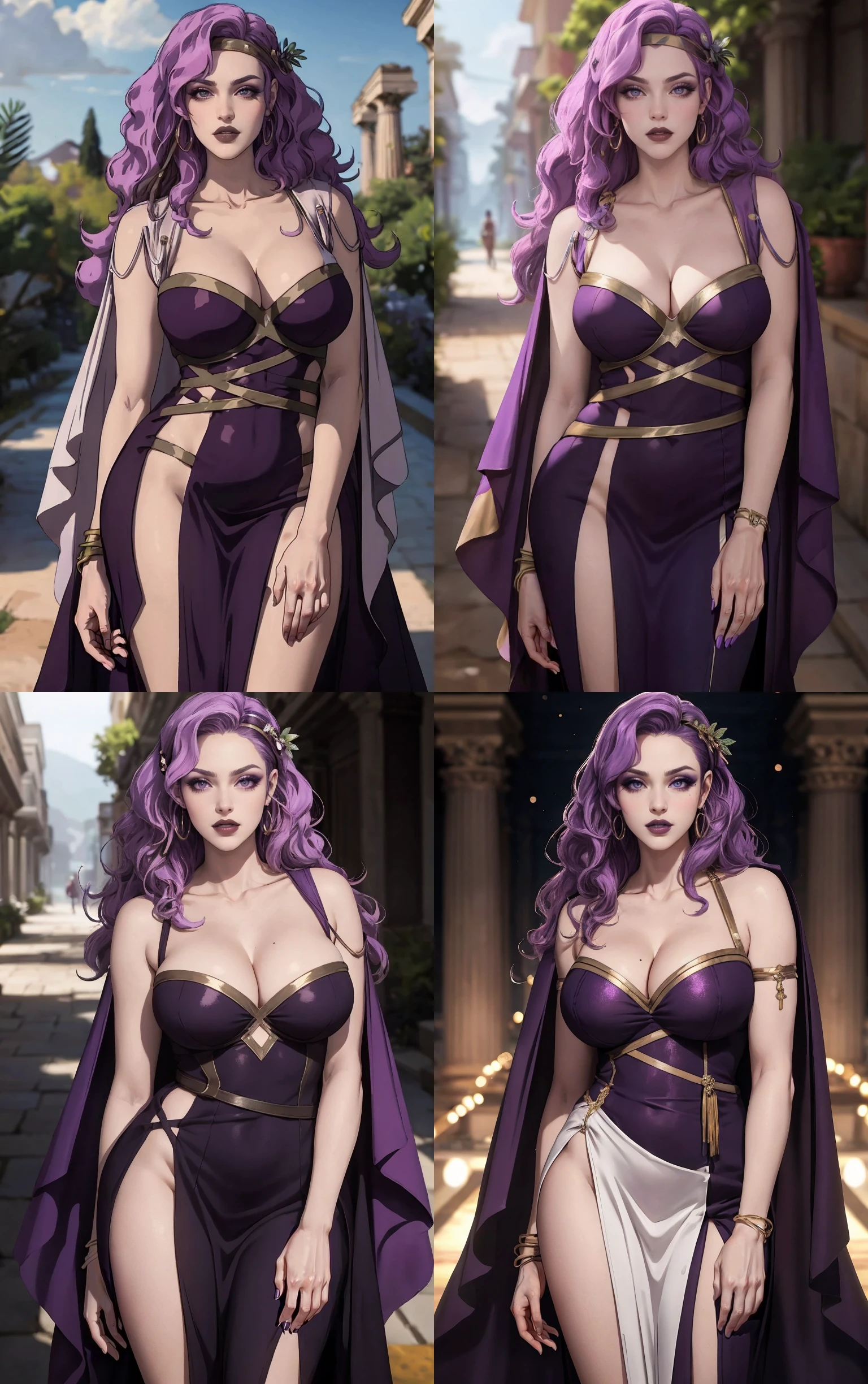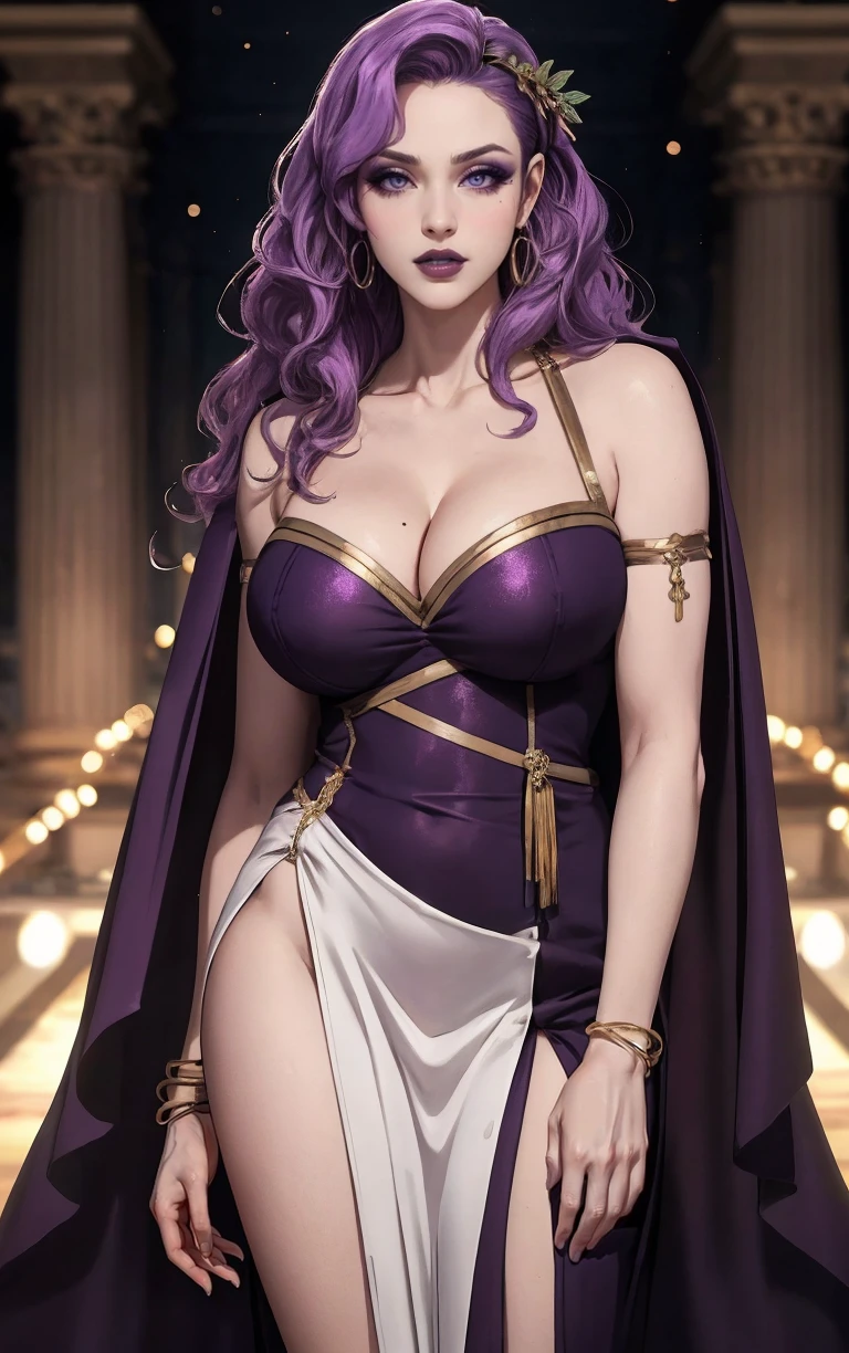 1girl, long hair, purple hair, breasts, cleavage, purple eyes, large breasts, makeup, lipstick, mole under eye, wavy hair, black lips,