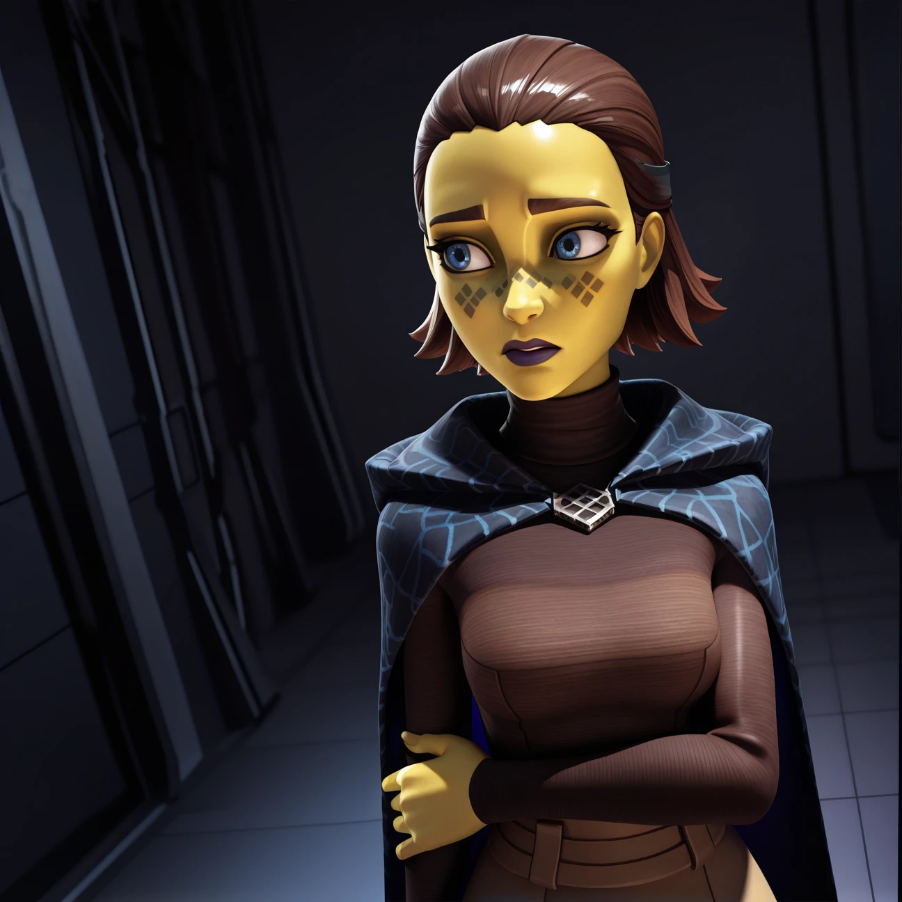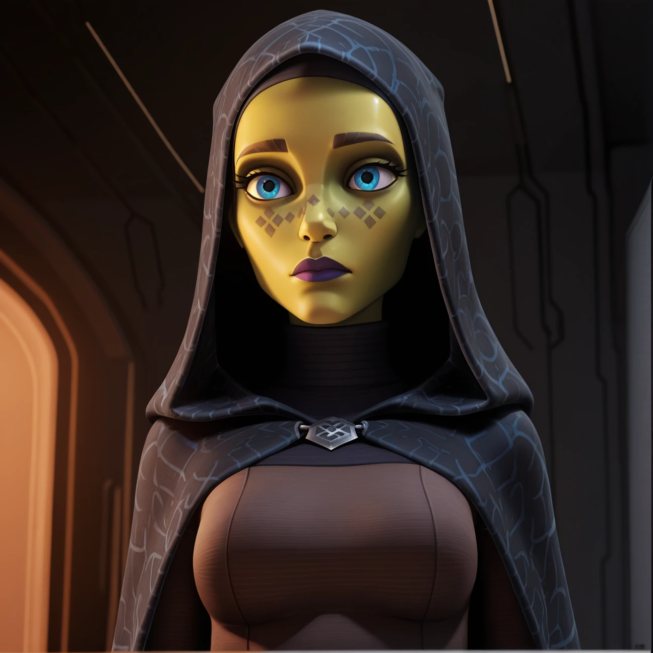 Barriss Offee: barriss offee, mirialan, 1girl, solo, blue eyes, facial mark, facial tattoo, colored skin, green skin, purple lips, alien, eyelashes, brown eyebrows, black eyebrows, medium breasts, makeup, cloak, hood, turtleneck, yellow skin, black lips, ///