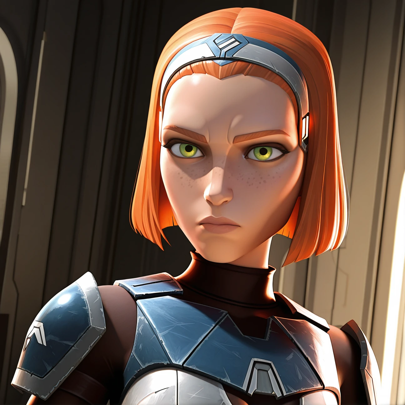 Bo-katan kryze: bo-katan kryze, mandalorian, 1girl, solo, breasts, green eyes, orange hair, freckles, short hair, medium hair, hairband, forehead, bob cut, lips, mandalorian armor, bodysuit, mature female, yellow eyes