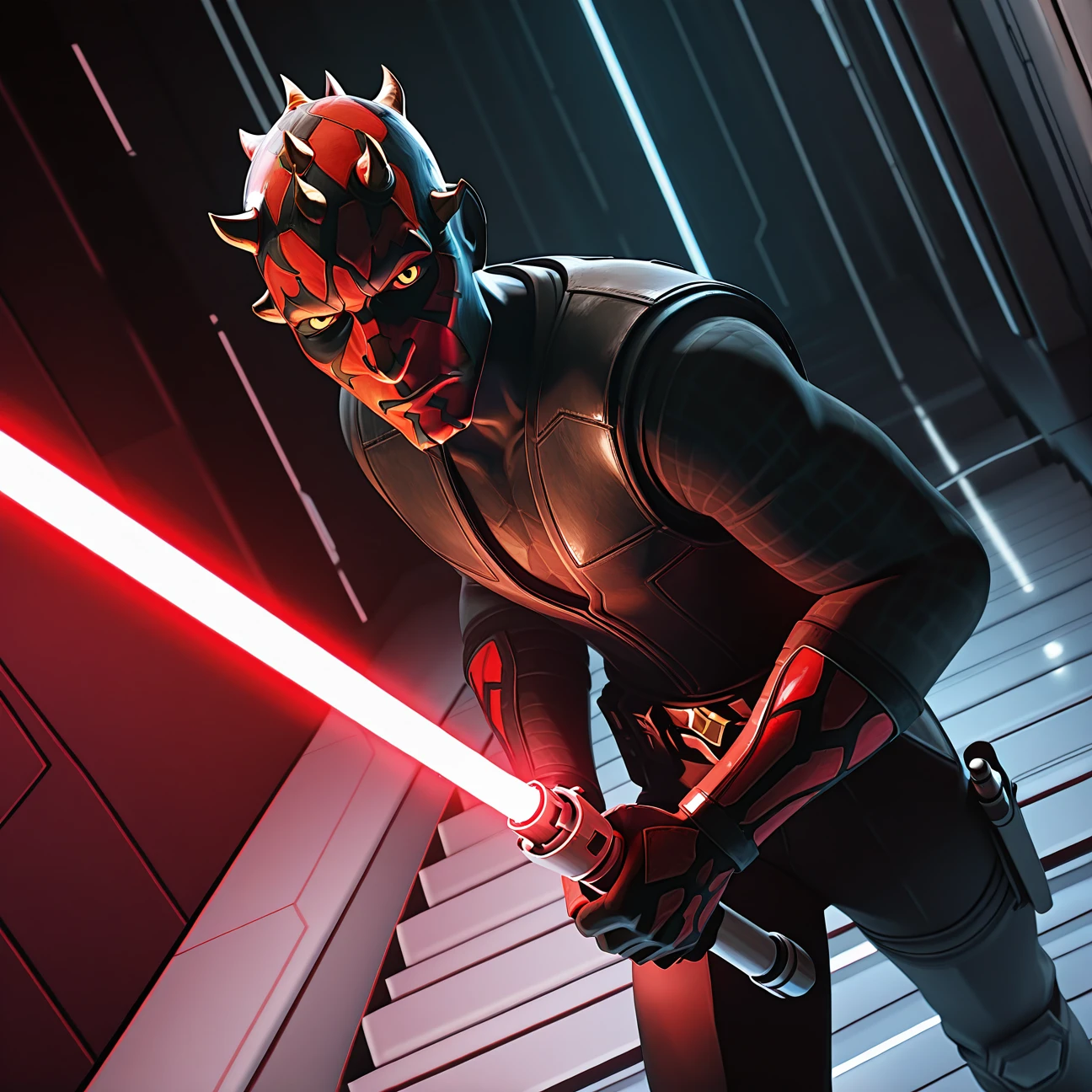 Darth Maul: darth maul, zabrak, solo, 1boy, male focus, yellow eyes, sith, shirt, black pants, colored skin, black pants, black vest, red skin, alien