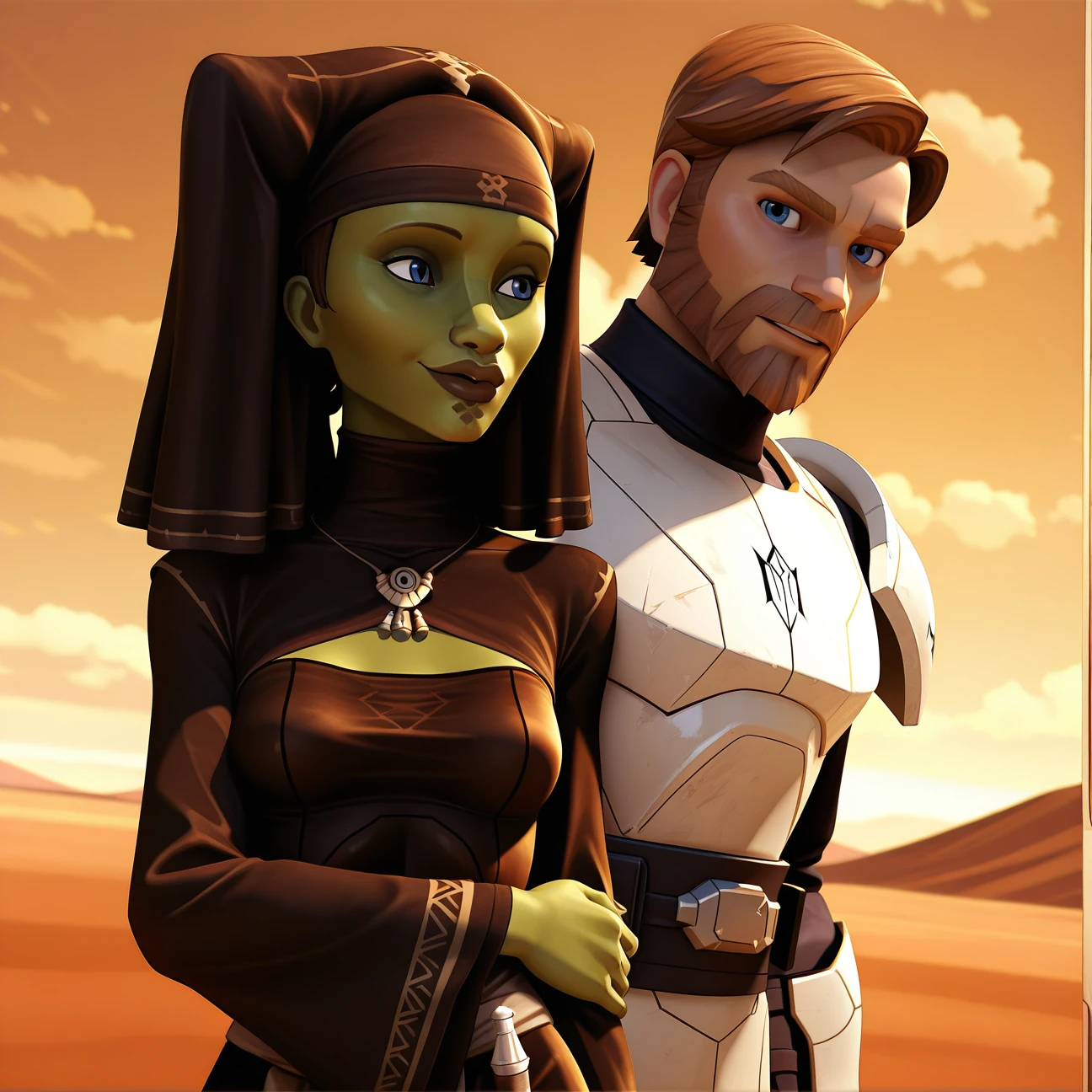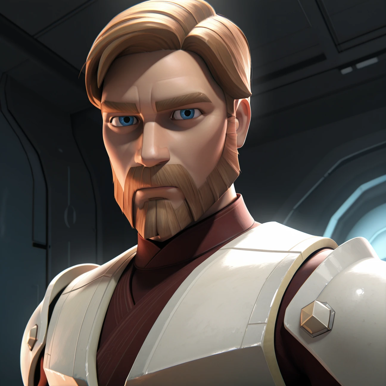 Obi-Wan Kenobi: obi-wan kenobi, solo, brown hair, blonde hair, 1boy, blue eyes, male focus, facial hair, beard, manly, white armor, bodysuit