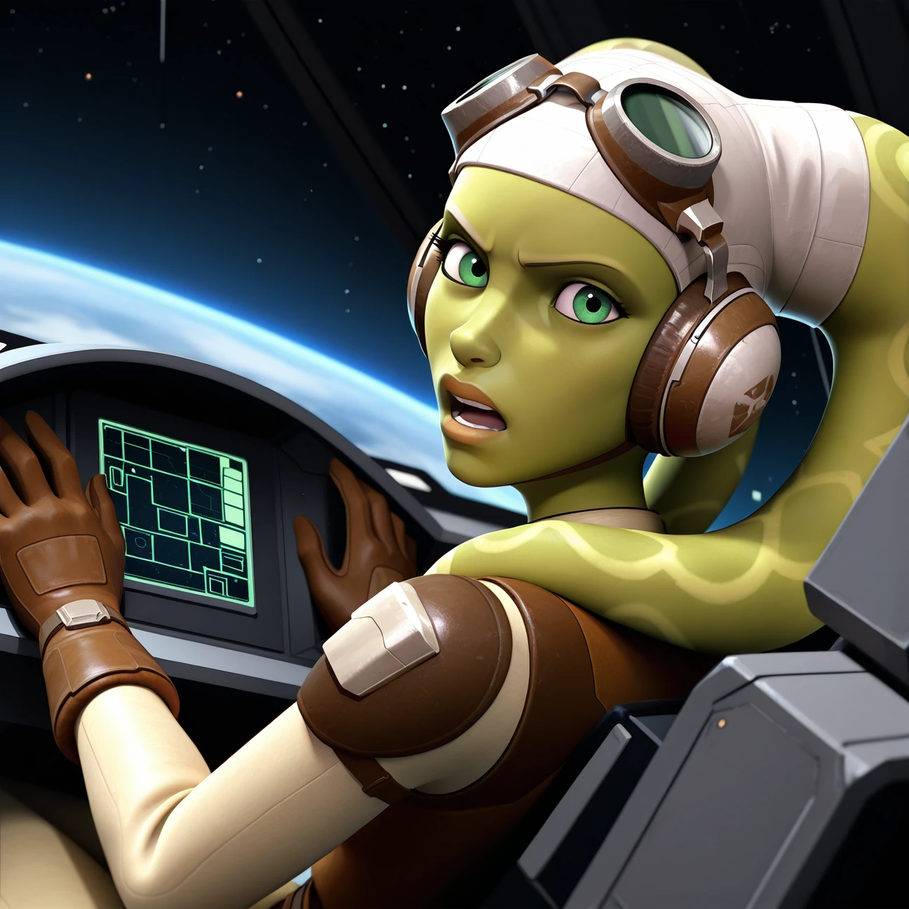 Hera Syndulla: hera syndulla, twi'lek, 1girl, solo, green eyes, breasts, colored skin, green skin, alien, goggles, goggles on head, lips, tentacle hair, twintails, hat, headphones, thin eyebrow, black eyebrow, brown vest, white shirt, black gloves, armor