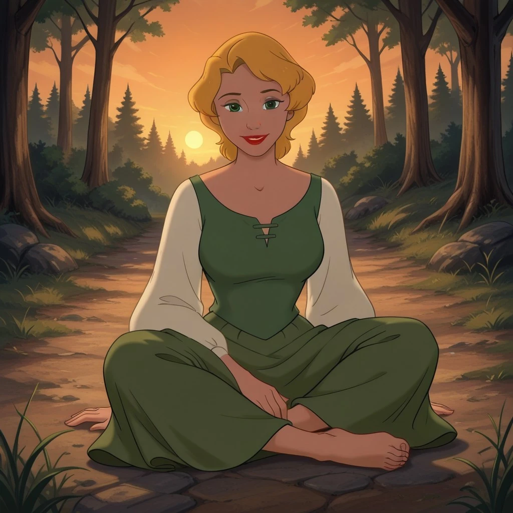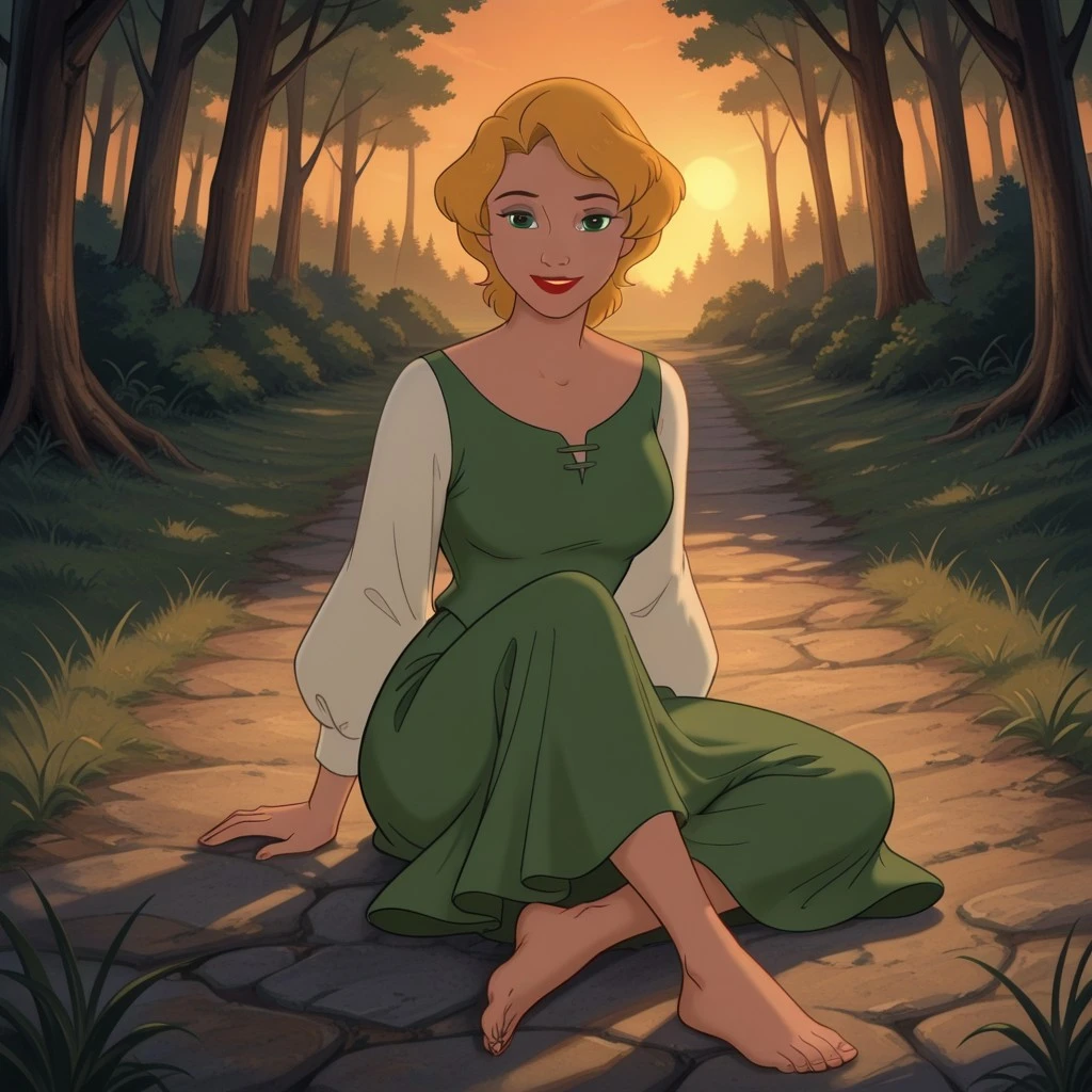 MadellaineHoND, 1girl, blonde hair, short hair, dark green eyes, lipstick, green dress, beige sleeves, green petticoat, barefoot