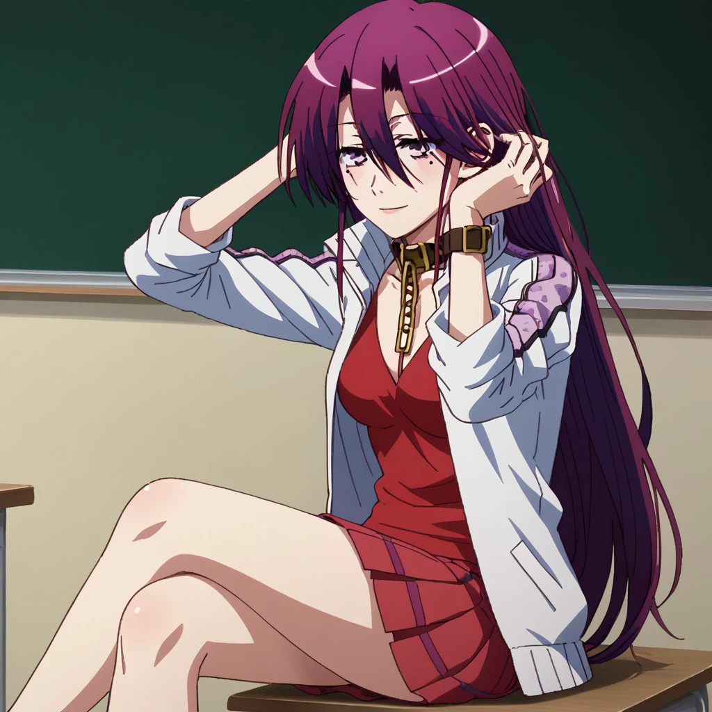 Shishido_Shiho, purple hair, long hair. collar chain, mole under eye, jacket, skirt