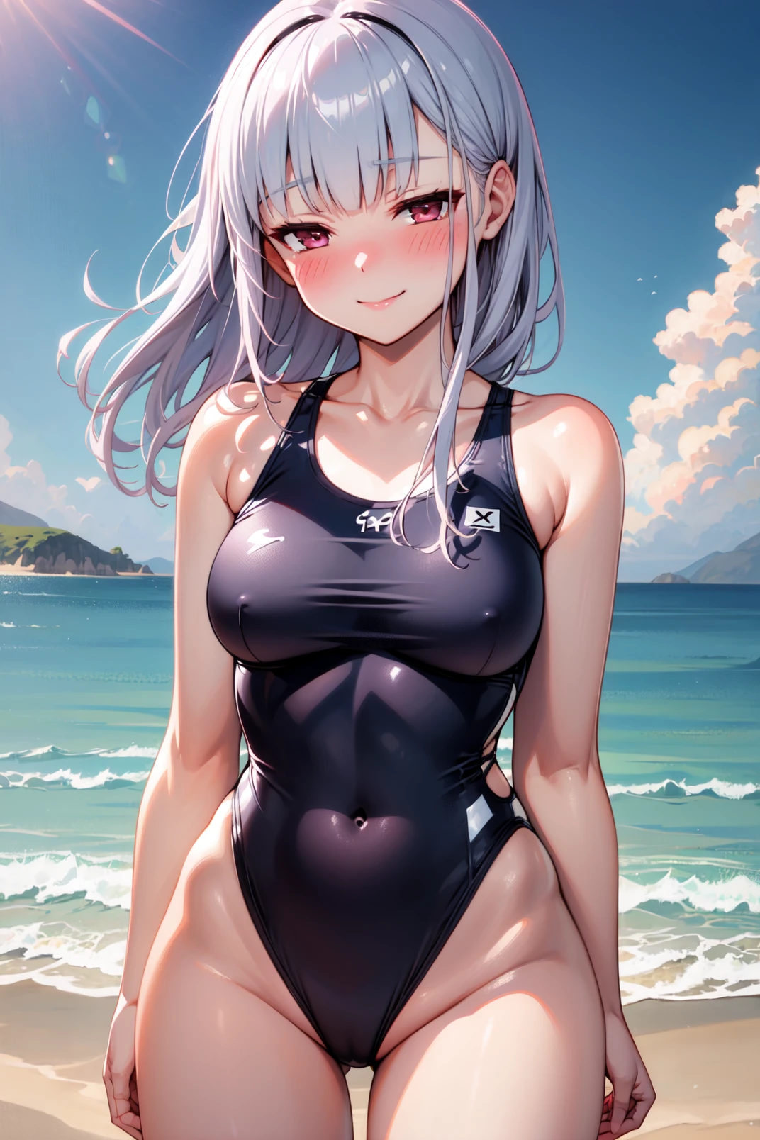 dido, pink eyes, gray hair, long hair, blunt bangs