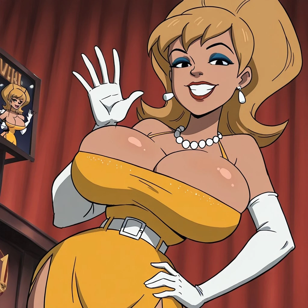 enormaray, brownish blonde hair, large hair, black eyes with white shine, blue eyeshadow, white elbow gloves, pearl necklace, white earrings, lipstick, blue eyeshadow, , cleavage, yellow slit dress with with white belt