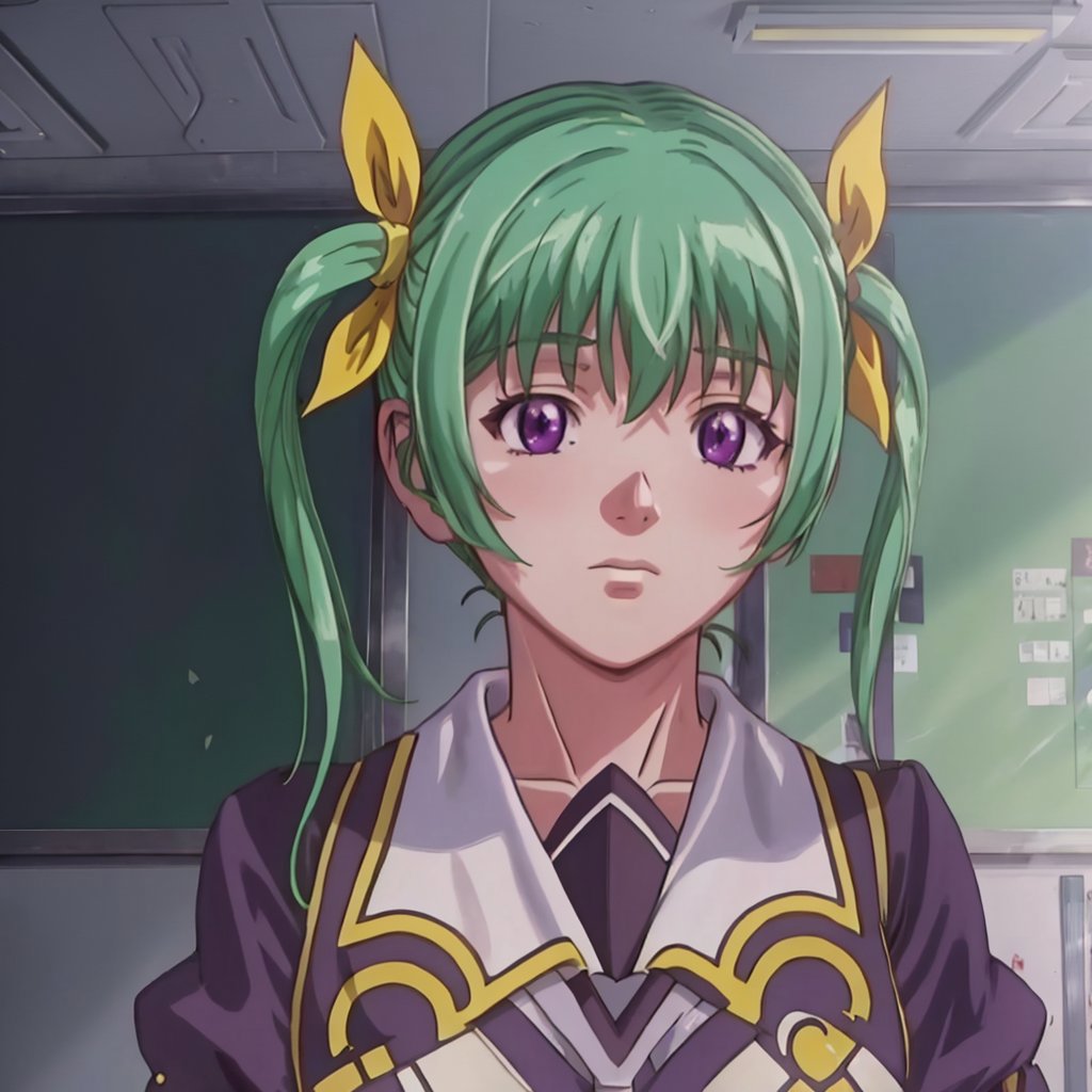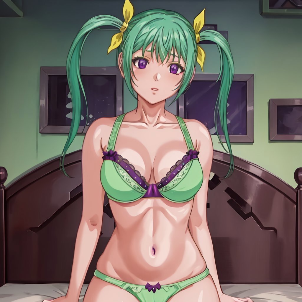 You'll most likely need green hair, purple_eyes and twintails tags to get her character to prompt. This character had the least number of screens + game cg + fan works to make up a dataset from so it was a bit lacking. Enjoy it for what it's worth.